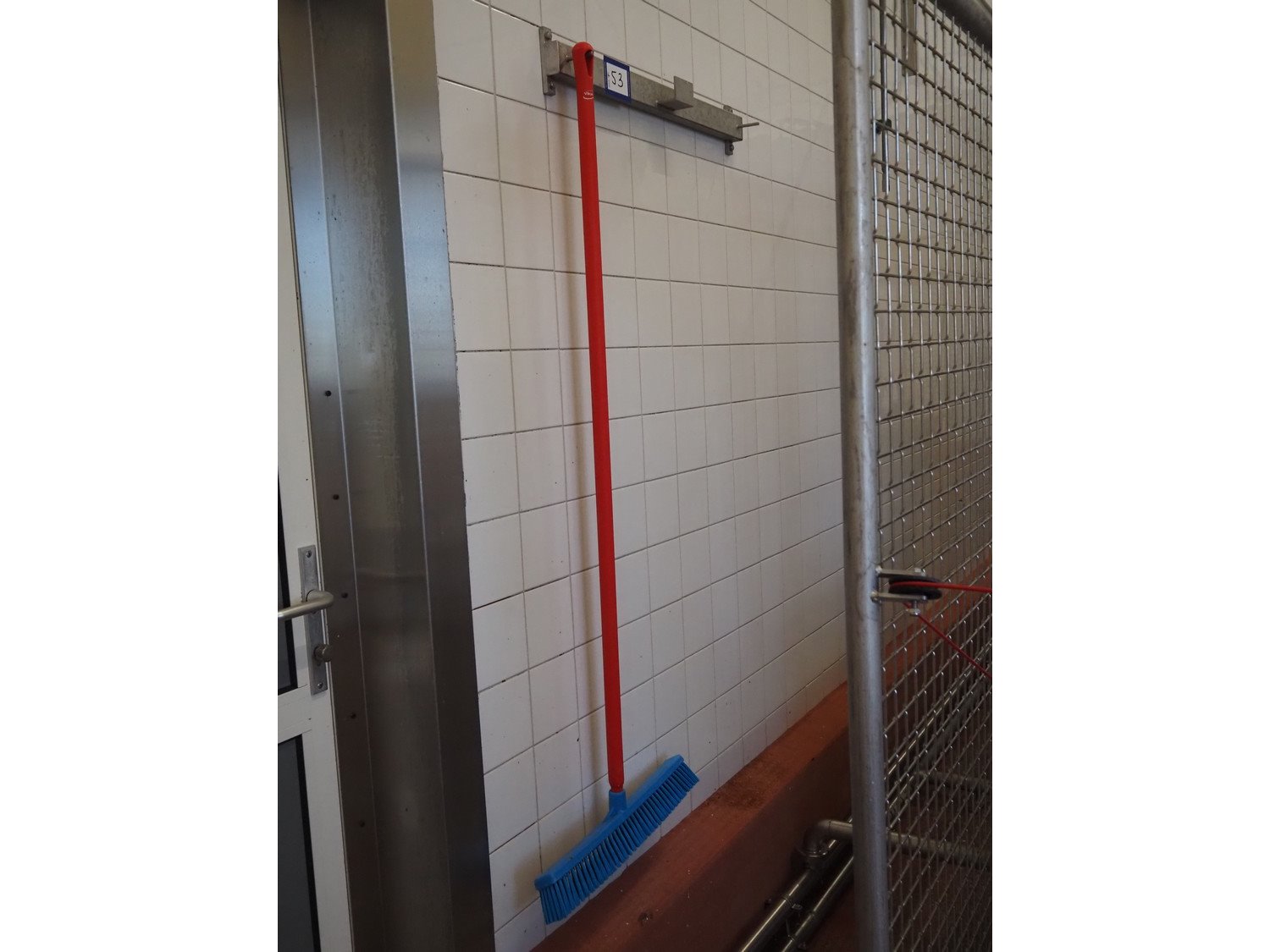 S/s peg with Vikan broom, dimensions peg: 800 mm x 100 mm x 130 mm. Kavel locatie: Bunsenstraat 79, 3316 GC Dordrecht, Nederland