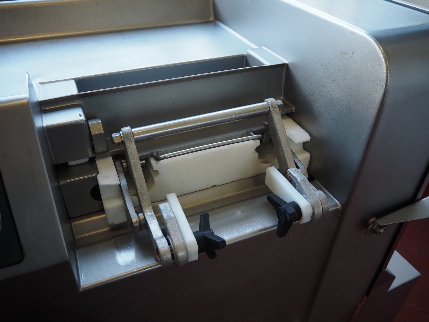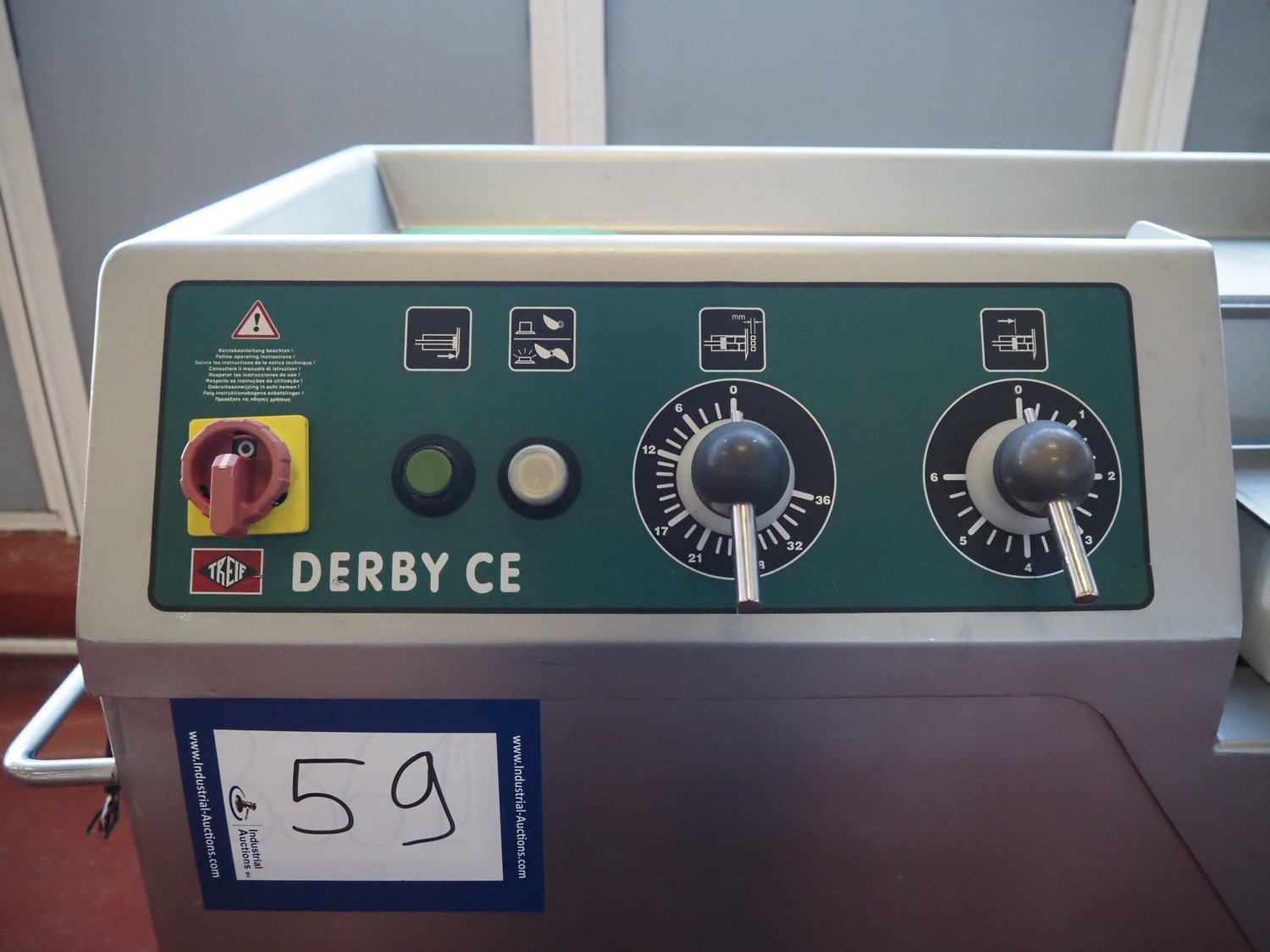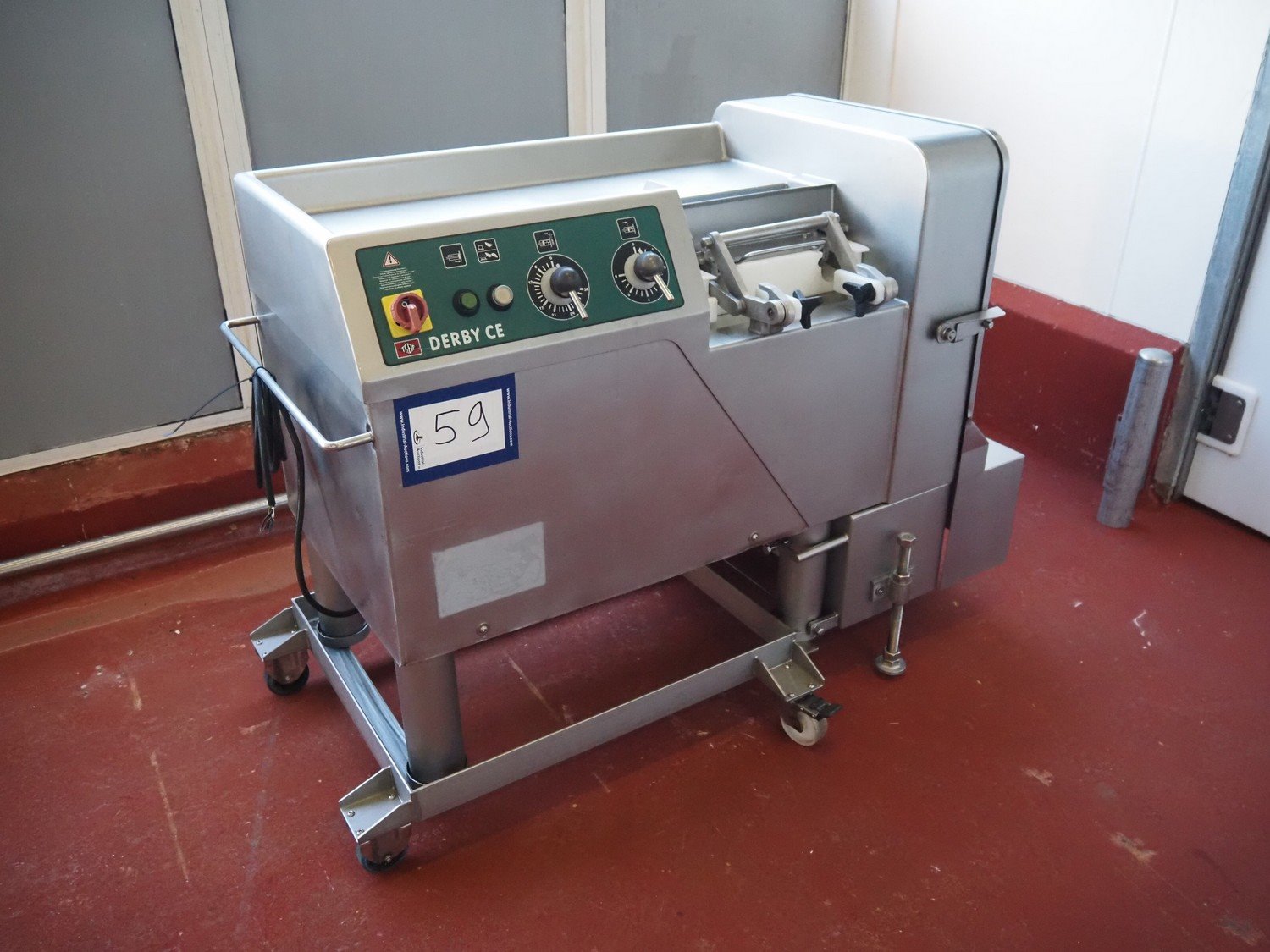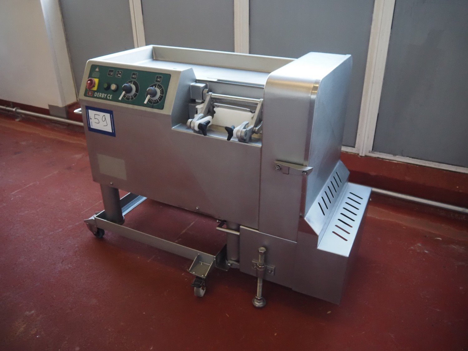 Treif dicer on mobile frame, type: DERBY-CE, 3 x 380 V, 50 Hz, 2.2 kW, capacity: maximum 995 kg per hour, chamber size: 360 mm x 84 mm x 84 mm, cut-off length: 0.5 - 36 mm, knife set: 17 mm x 17 mm, weight: 295 kg, dimensions: 1650 mm x 900 mm x 1200 mm. Kavel locatie: Bunsenstraat 79, 3316 GC Dordrecht, Nederland