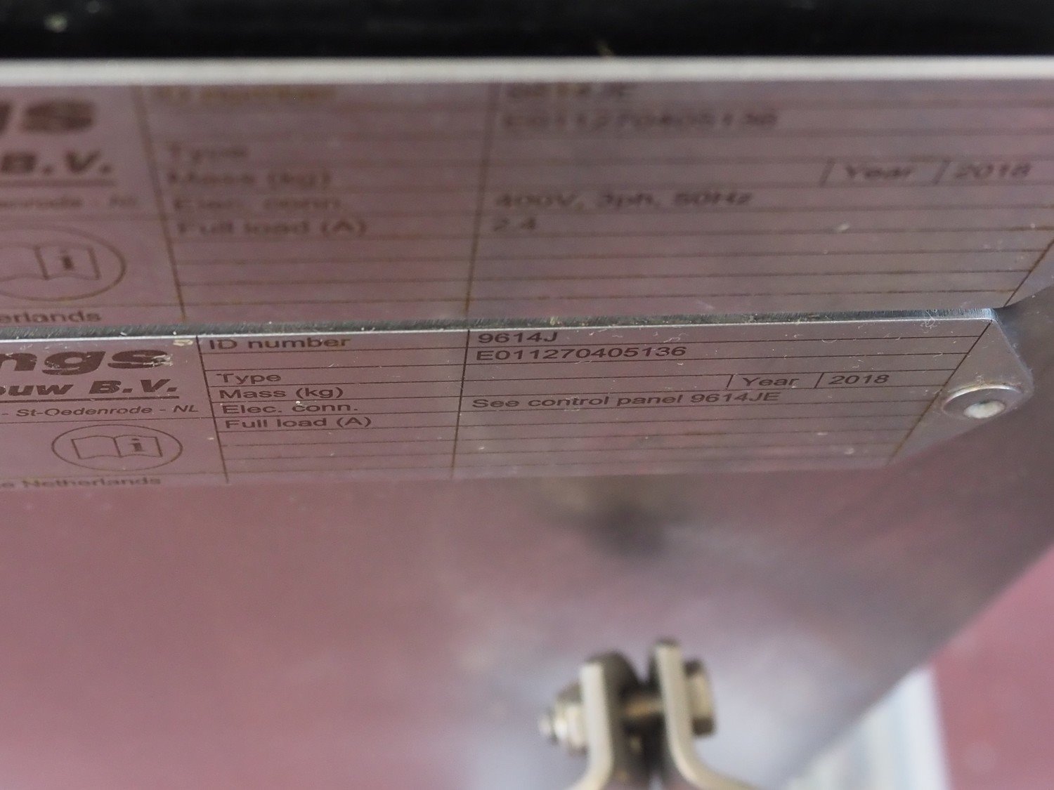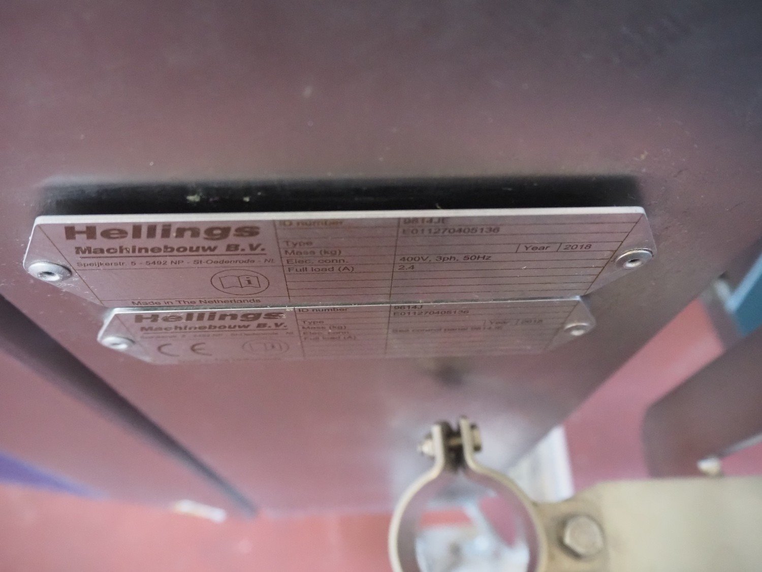 GEA / Hellings Machinebouw B.V. mobile elevating belt, serial number: E011270405136, year of construction: 2018, 400 V, 3 Ph, 50 Hz, s/s frame, plastic belt, belt width: 600 mm, elevating height: 1000 mm, total dimensions: 1900 mm x 1250 mm x 1100 mm. Kavel locatie: Bunsenstraat 79, 3316 GC Dordrecht, Nederland