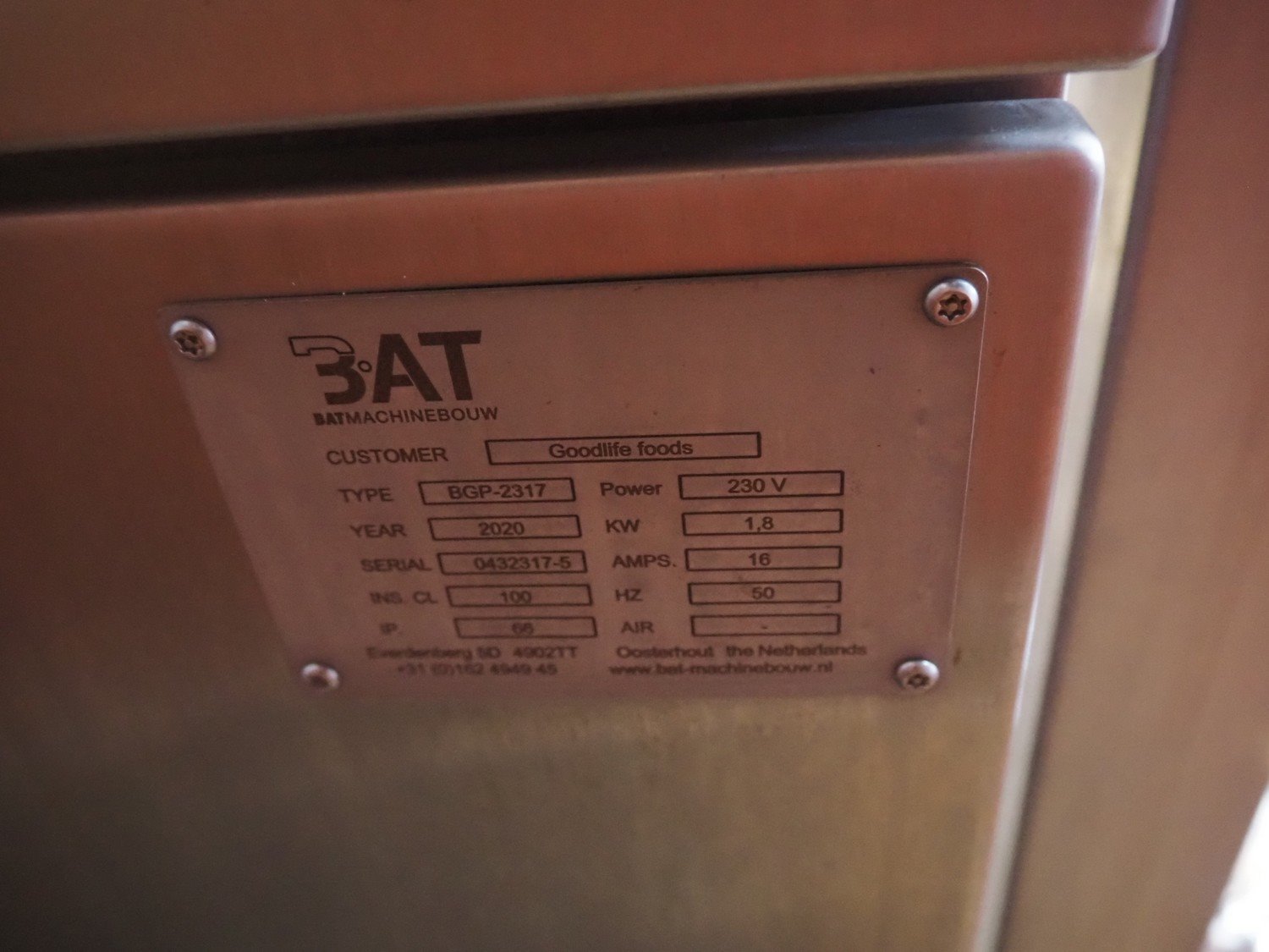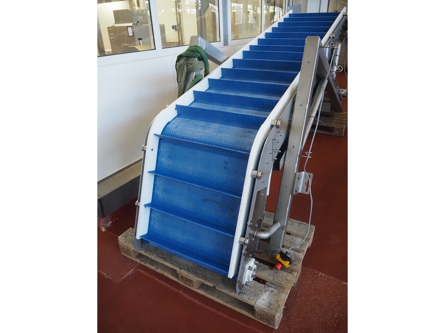 BAT Machinebouw elevating belt, type: BGP-2317, serial number: 0432317-5, year of construction: 2020, 230 V, 50 Hz, 16 A, 1.8 kW, plastic belt width dividers, belt width: 700 mm, divider height: 80 mm, distance between dividers: 200 mm, elevating height: 4000 mm, total dimensions: 4200 mm x 1100 mm x 1600 mm. Kavel locatie: Bunsenstraat 79, 3316 GC Dordrecht, Nederland