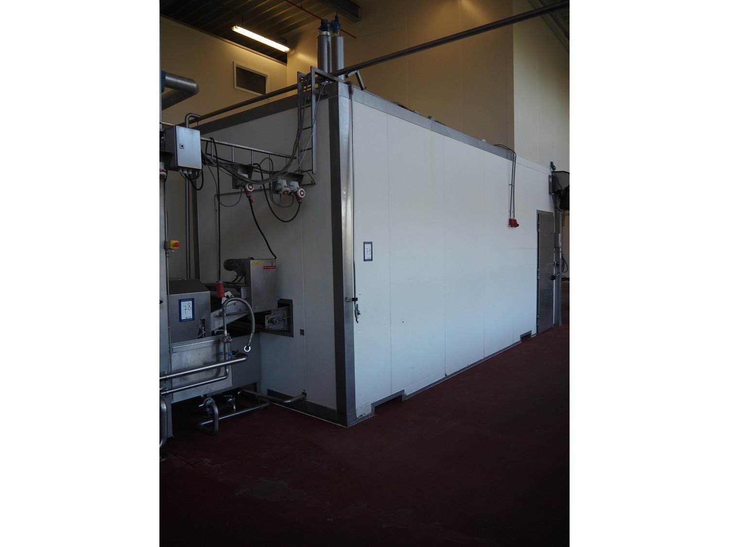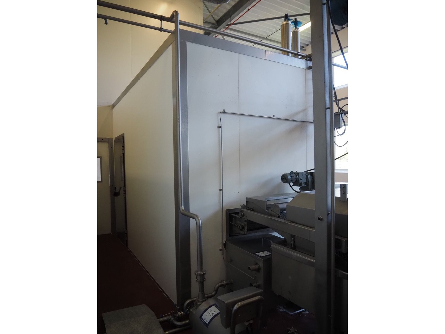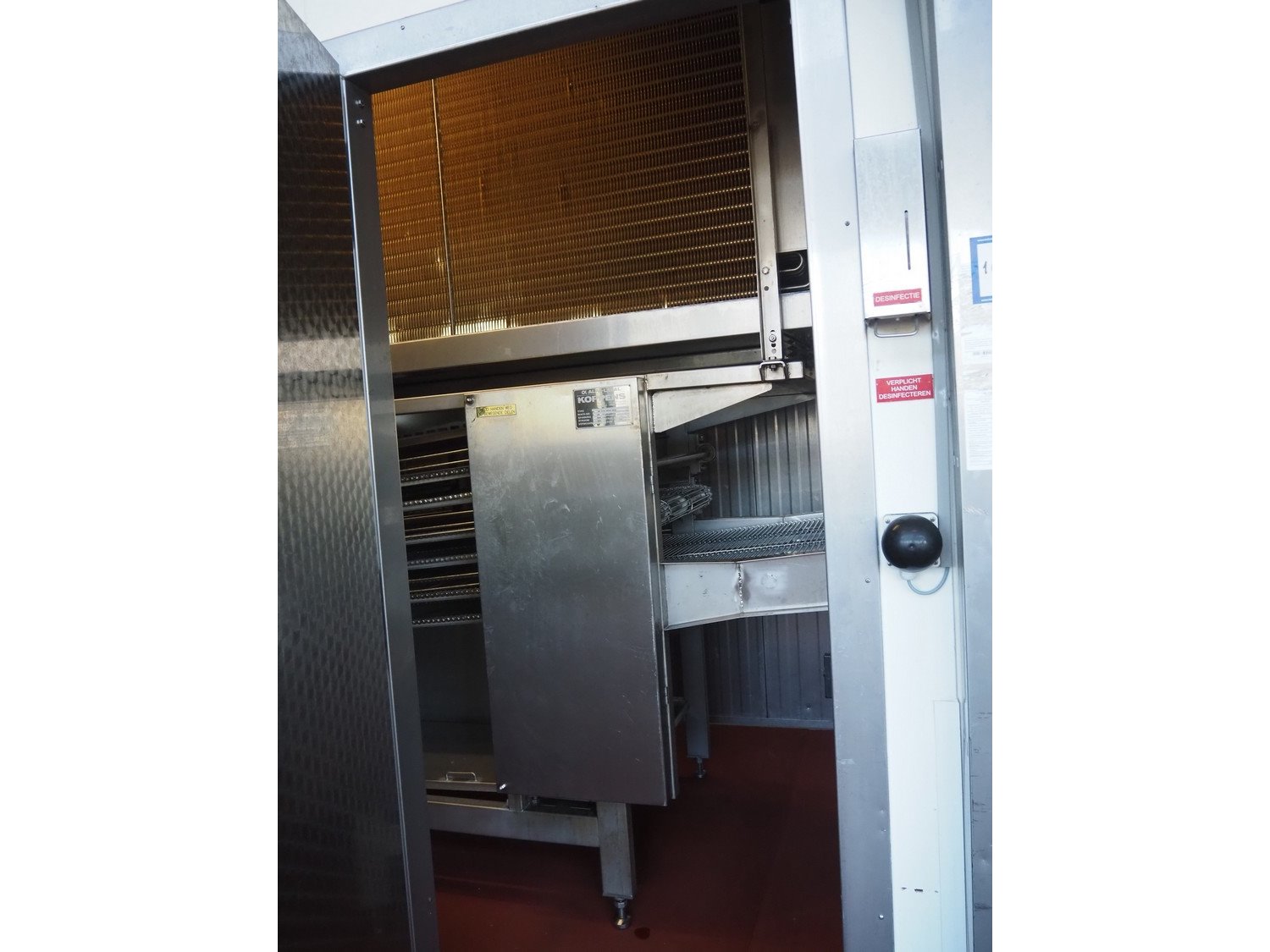 Koppens / GEA Goedhart B.V. cooling tunnel, type: KT3S 6000 / 1000, machine number: KT3S 6000 / 1000 - 138, 380 V, 3 Ph, 50 Hz, 1.12 A, 0.37 kW, 3 floors, s/s mesh belt, belt width: 1000 mm, GEA Goedhart B.V. evaporator, type: LLK.s 411 m², manufacturing number: PJV100282, year of construction: 2010, volume: 135 dm³, refrigerant: NH3, weight: 770 kg, working pressure: 22 bar, test pressure: 32 bar, total dimensions including cooling panels and s/s door: 7500 mm x 2700 mm x 3300 mm. Kavel locatie: Bunsenstraat 79, 3316 GC Dordrecht, Nederland