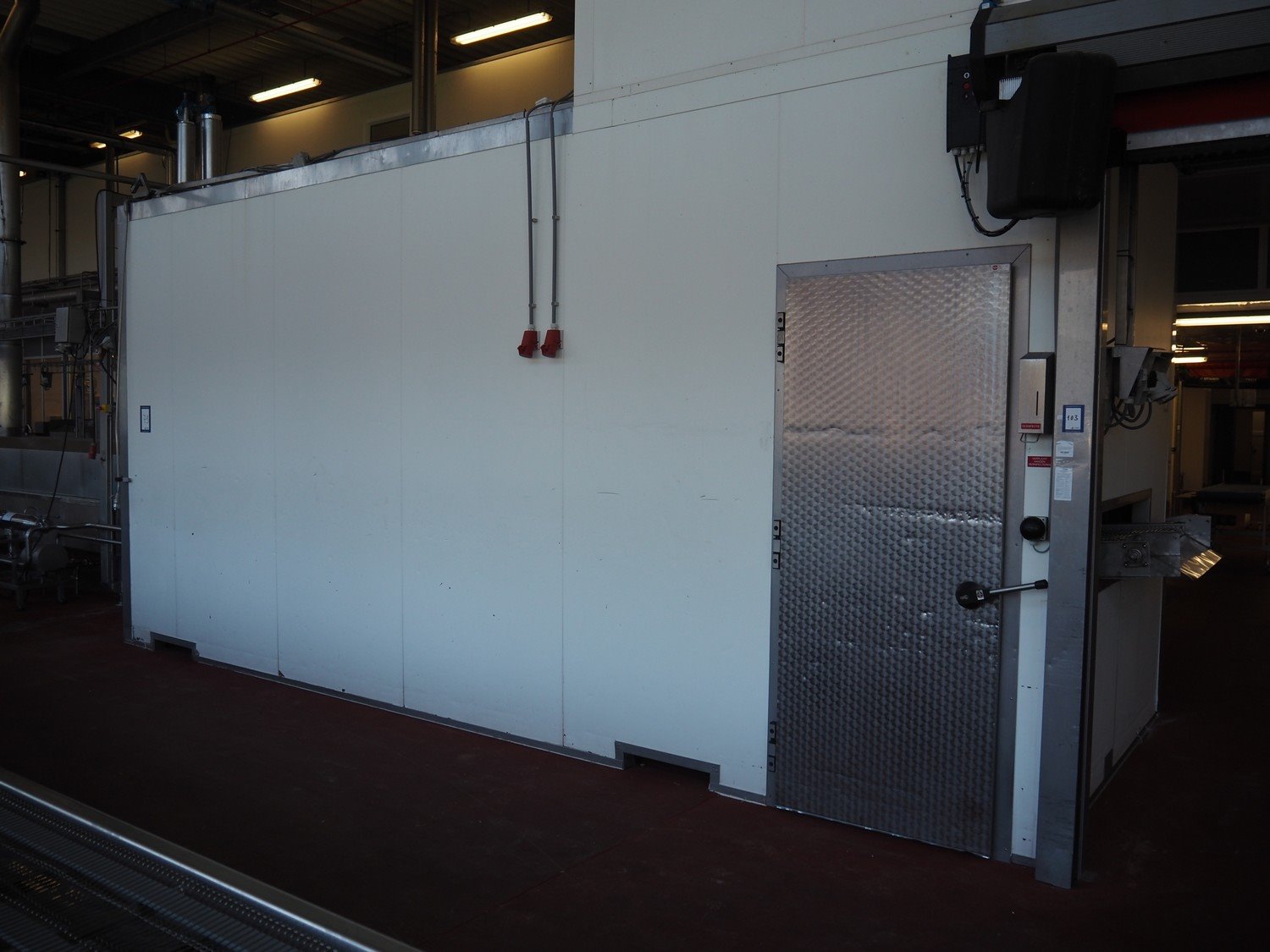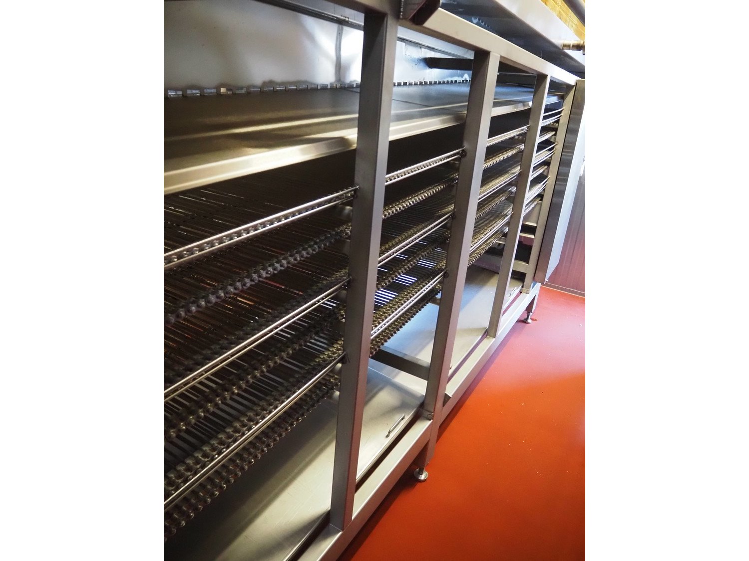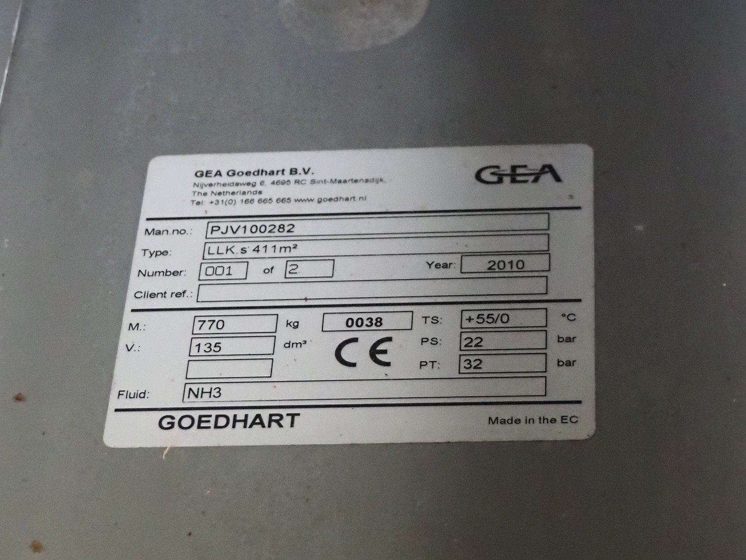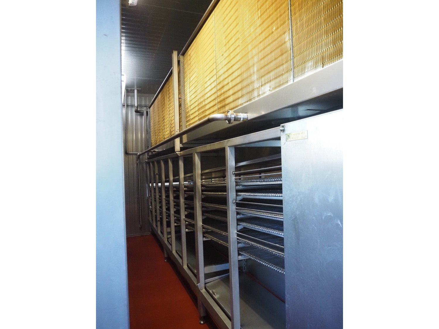 Koppens / GEA Goedhart B.V. cooling tunnel, type: KT3S 6000 / 1000, machine number: KT3S 6000 / 1000 - 138, 380 V, 3 Ph, 50 Hz, 1.12 A, 0.37 kW, 3 floors, s/s mesh belt, belt width: 1000 mm, GEA Goedhart B.V. evaporator, type: LLK.s 411 m², manufacturing number: PJV100282, year of construction: 2010, volume: 135 dm³, refrigerant: NH3, weight: 770 kg, working pressure: 22 bar, test pressure: 32 bar, total dimensions including cooling panels and s/s door: 7500 mm x 2700 mm x 3300 mm. Kavel locatie: Bunsenstraat 79, 3316 GC Dordrecht, Nederland