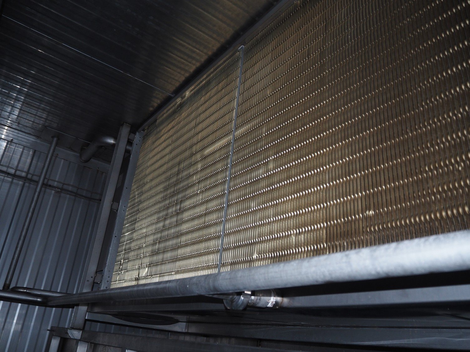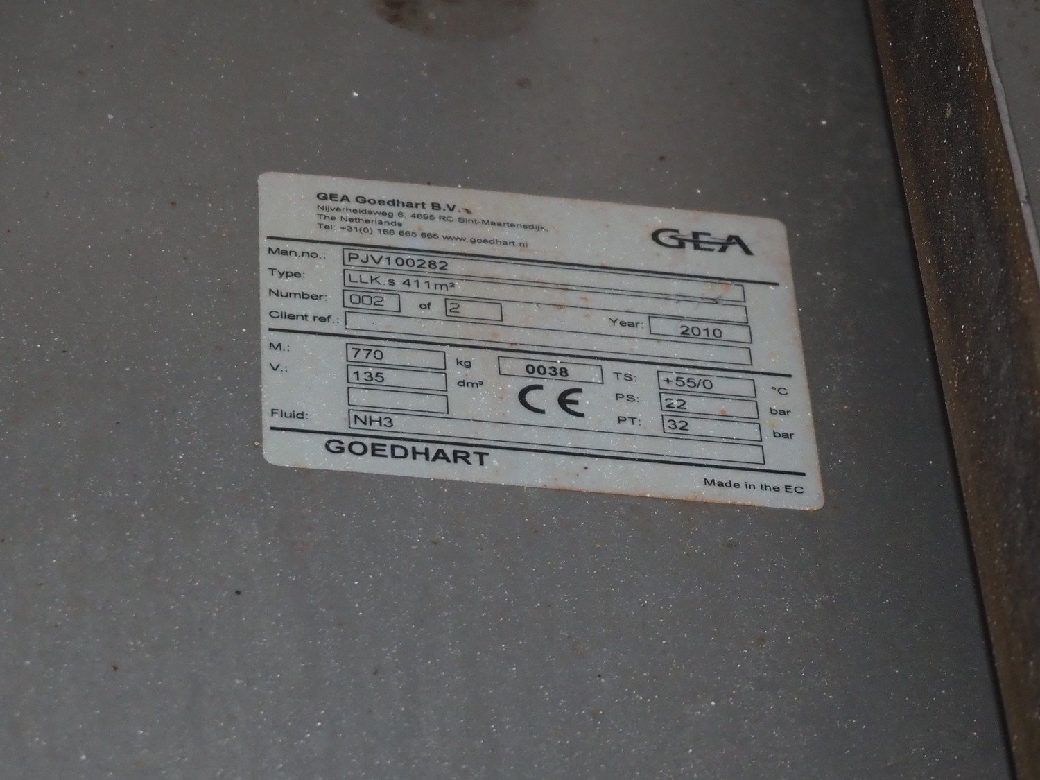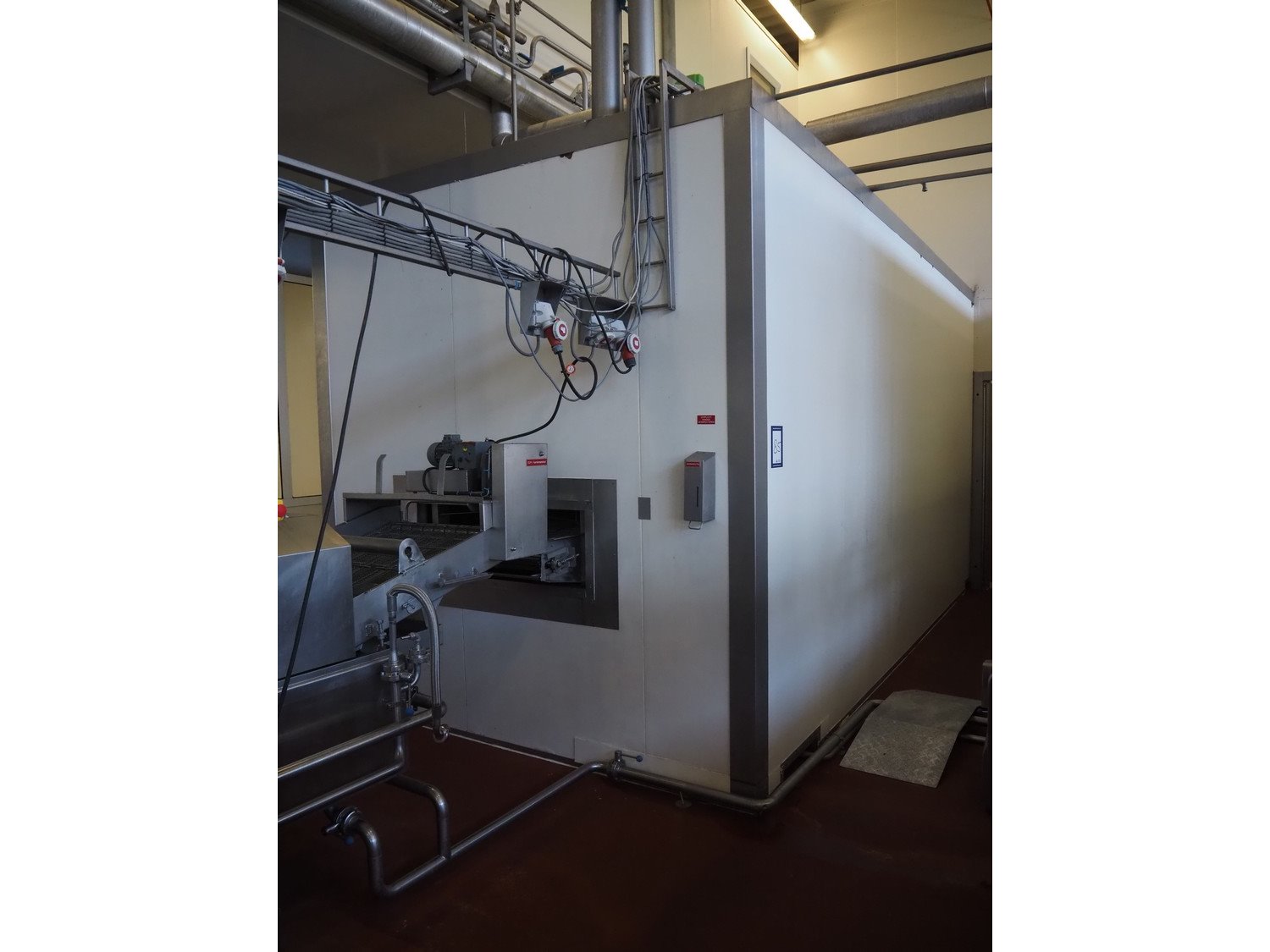Koppens / GEA Goedhart B.V. cooling tunnel, type: KT5S 7500 / 1000, machine number: KT3S 6000 / 1000 - 192, 380 V, 3 Ph, 50 Hz, 5 floors, s/s mesh belt, belt width: 1000 mm, GEA Goedhart B.V. evaporator, type: LLK.s 411 m², manufacturing number: PJV100282, year of construction: 2010, volume: 135 dm³, refrigerant: NH3, weight: 770 kg, working pressure: 22 bar, test pressure: 32 bar, total dimensions including cooling panels and s/s door: 8100 mm x 3000 mm x 3300 mm. Kavel locatie: Bunsenstraat 79, 3316 GC Dordrecht, Nederland