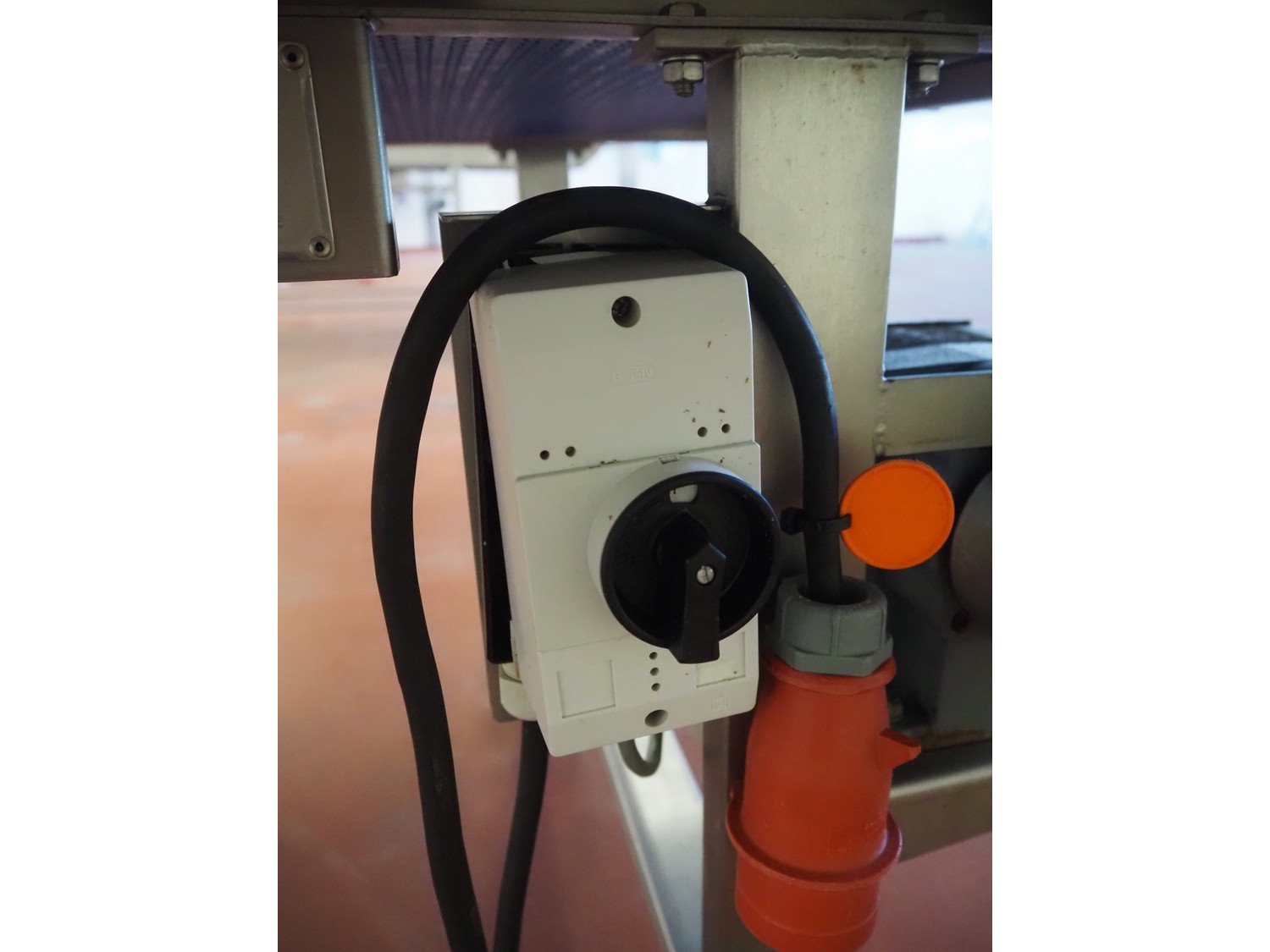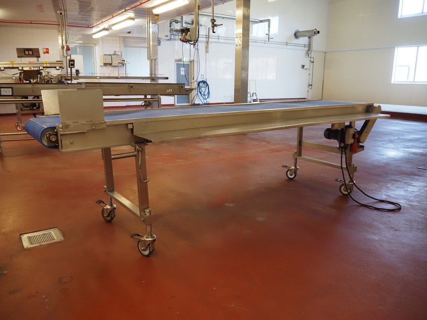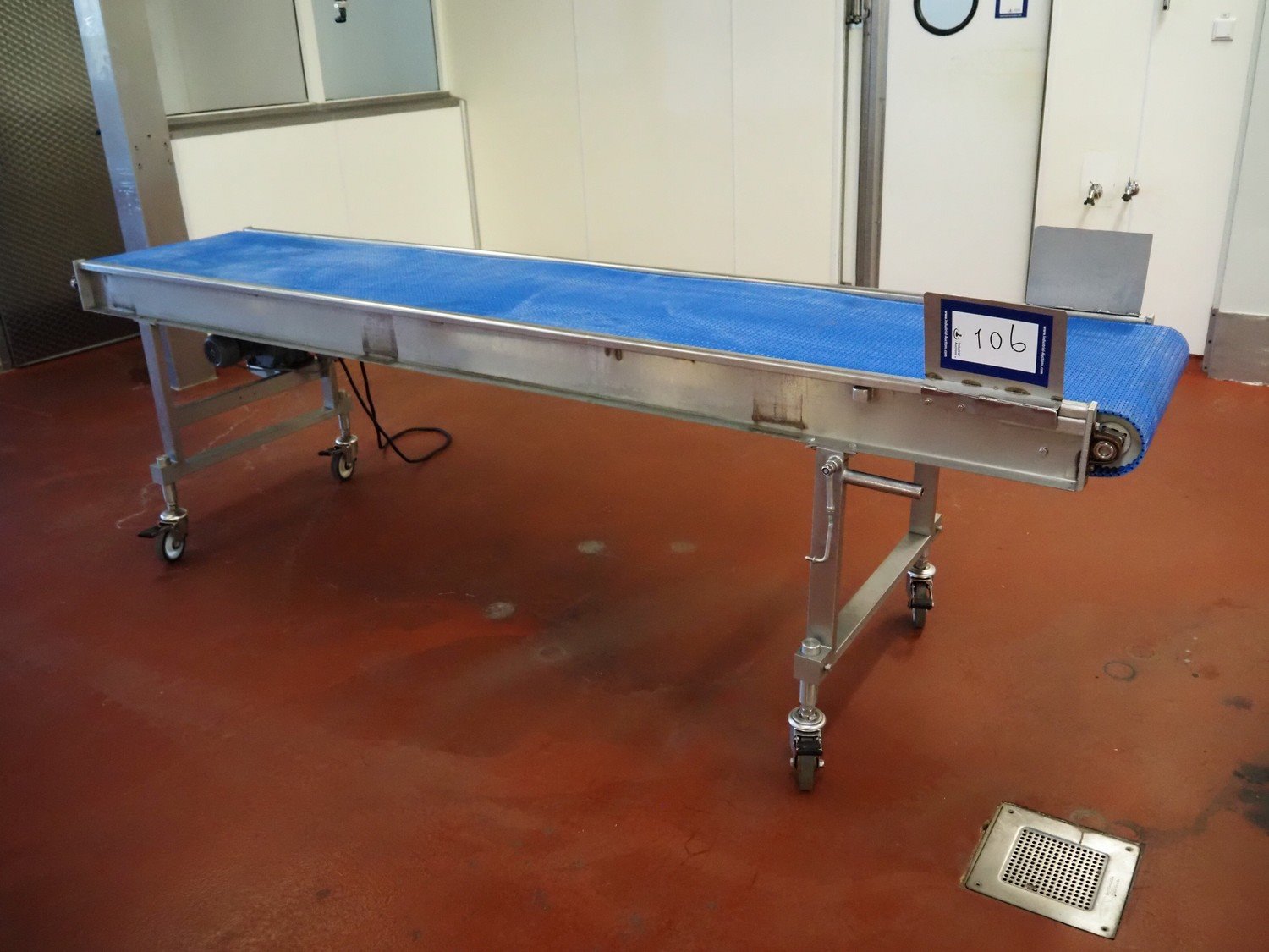 Mobile transport belt, s/s frame, plastic belt, belt width: 610 mm, total dimensions: 3230 mm x 1000 mm x 1130 mm. Kavel locatie: Bunsenstraat 79, 3316 GC Dordrecht, Nederland