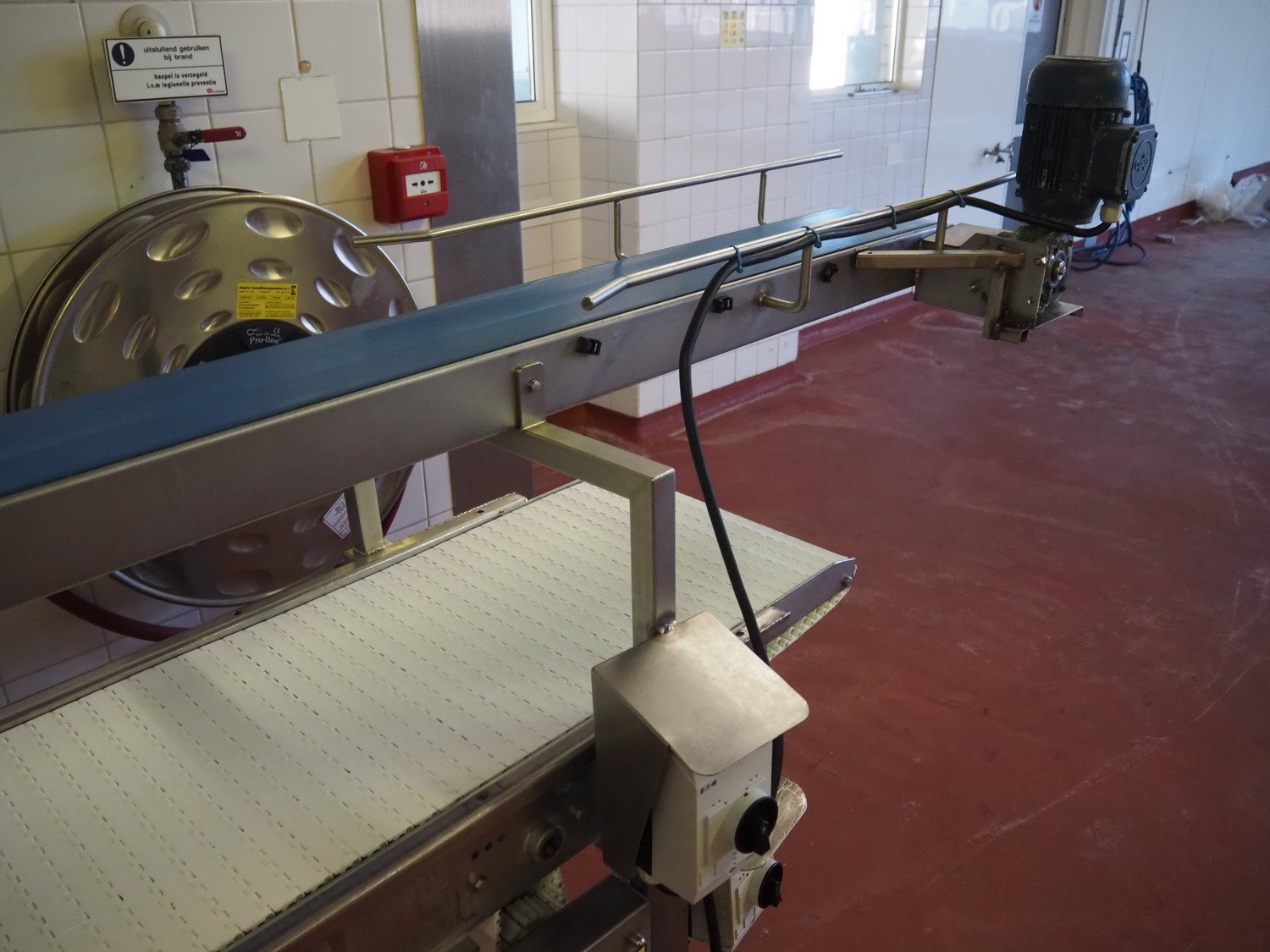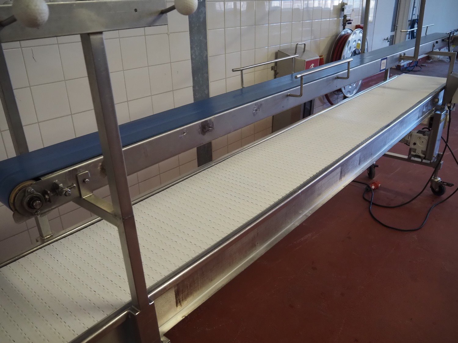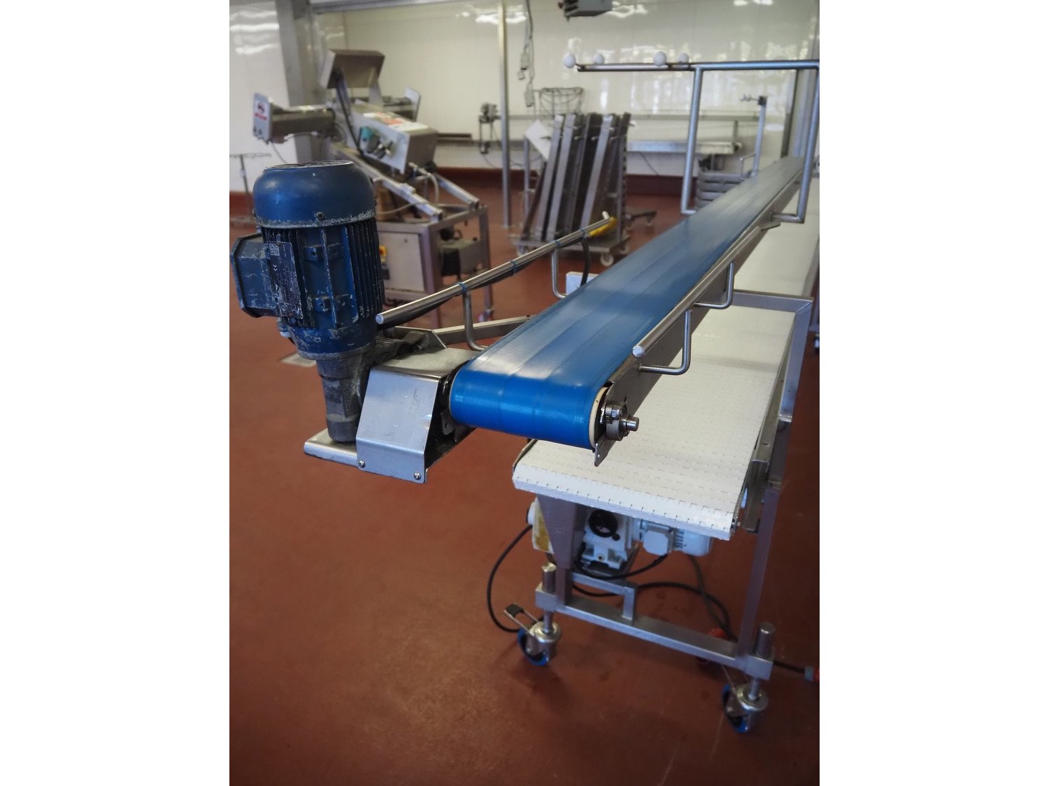Koppens mobile transport belt, type: TG 6700 / 400, serial number: TG 6700 / 400 - 894, 380 V, 3 Ph, 50 Hz, 0.87 A, 0.18 kW, weight: 185 kg, s/s frame, plastic belt, belt width: 400 mm, including upper belt, belt width: 165 mm, total dimensions: 7200 mm x 1000 mm x 1700 mm. Kavel locatie: Bunsenstraat 79, 3316 GC Dordrecht, Nederland