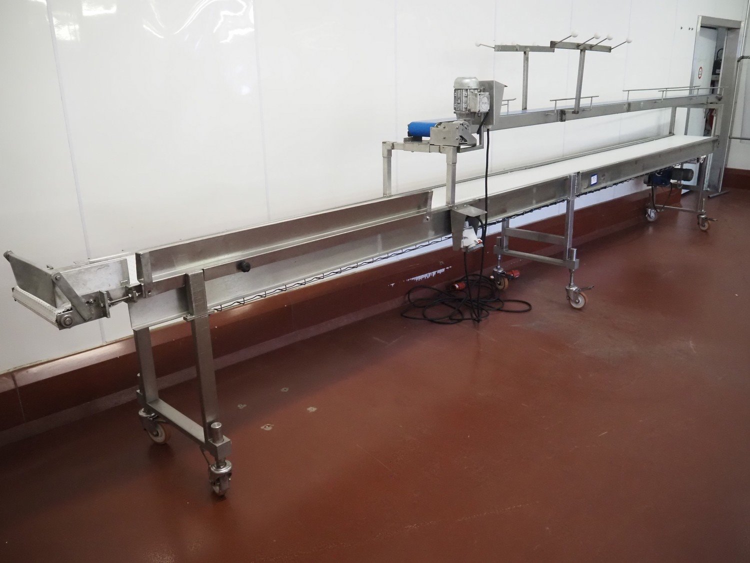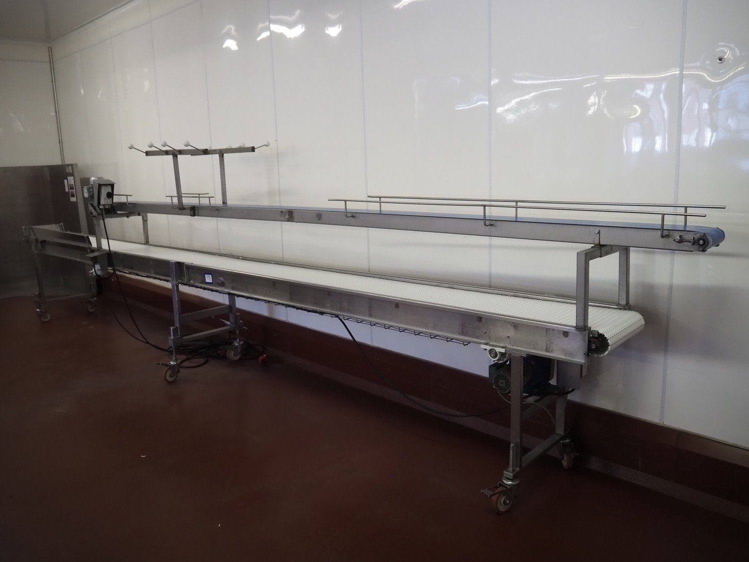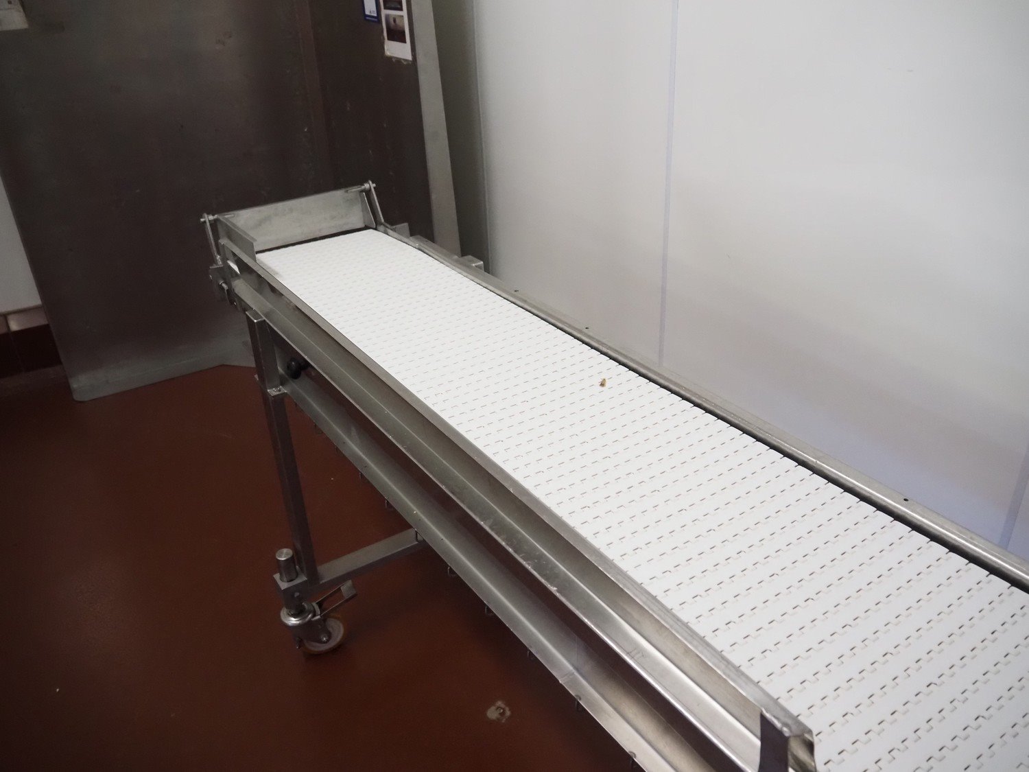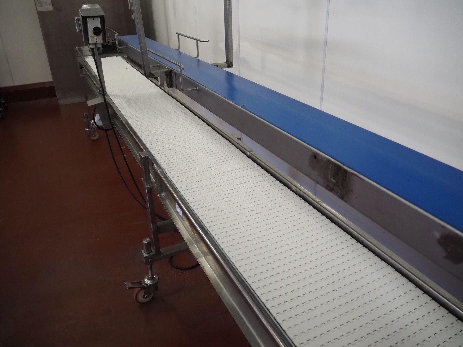 Koppens mobile transport belt, type: TG 3400/400, machine number: TG 3400/400-895, 380 V, 3 Ph, 50 Hz, 0.47 A, 0.09 kW, s/s frame, plastic belt, belt width: 400 mm, including upper belt, belt width: 170 mm, total dimensions: 6800 mm x 700 mm x 1800 mm. Kavel locatie: Bunsenstraat 79, 3316 GC Dordrecht, Nederland