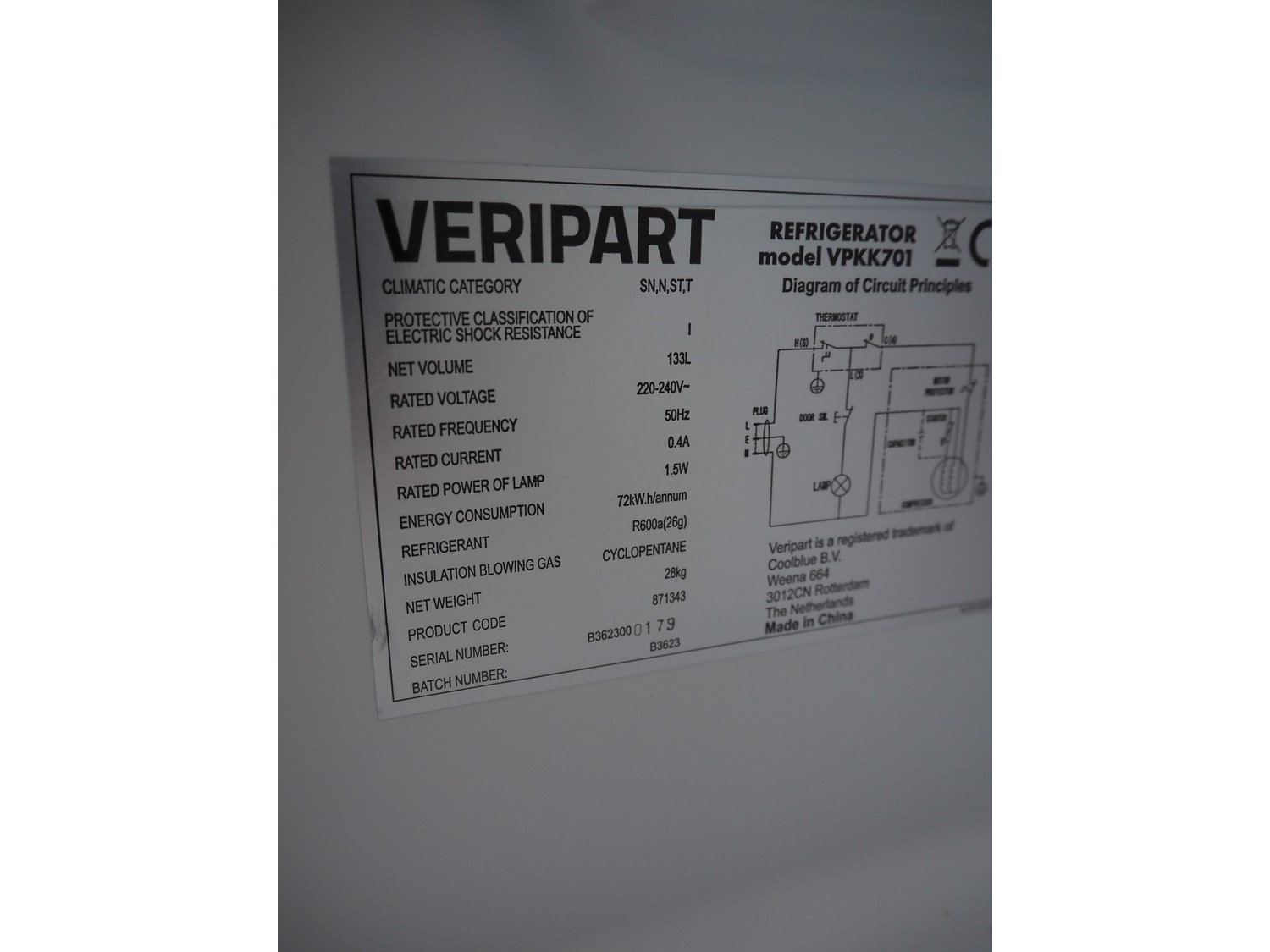 Veripart refrigerator, model: VPKK701, serial number: B362300 0179, 220-240 V, 1 Ph, 50 Hz, 0.4 A, refrigerant: R600a (26 gram, net volume: 133 liter, dimensions: 550 mm x 570 mm x 850 mm. Kavel locatie: Bunsenstraat 79, 3316 GC Dordrecht, Nederland