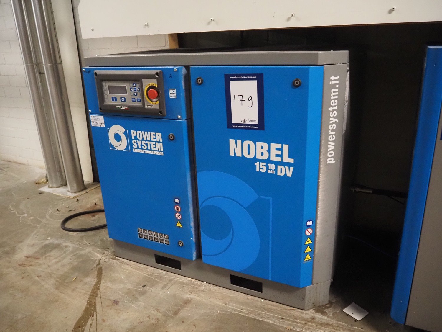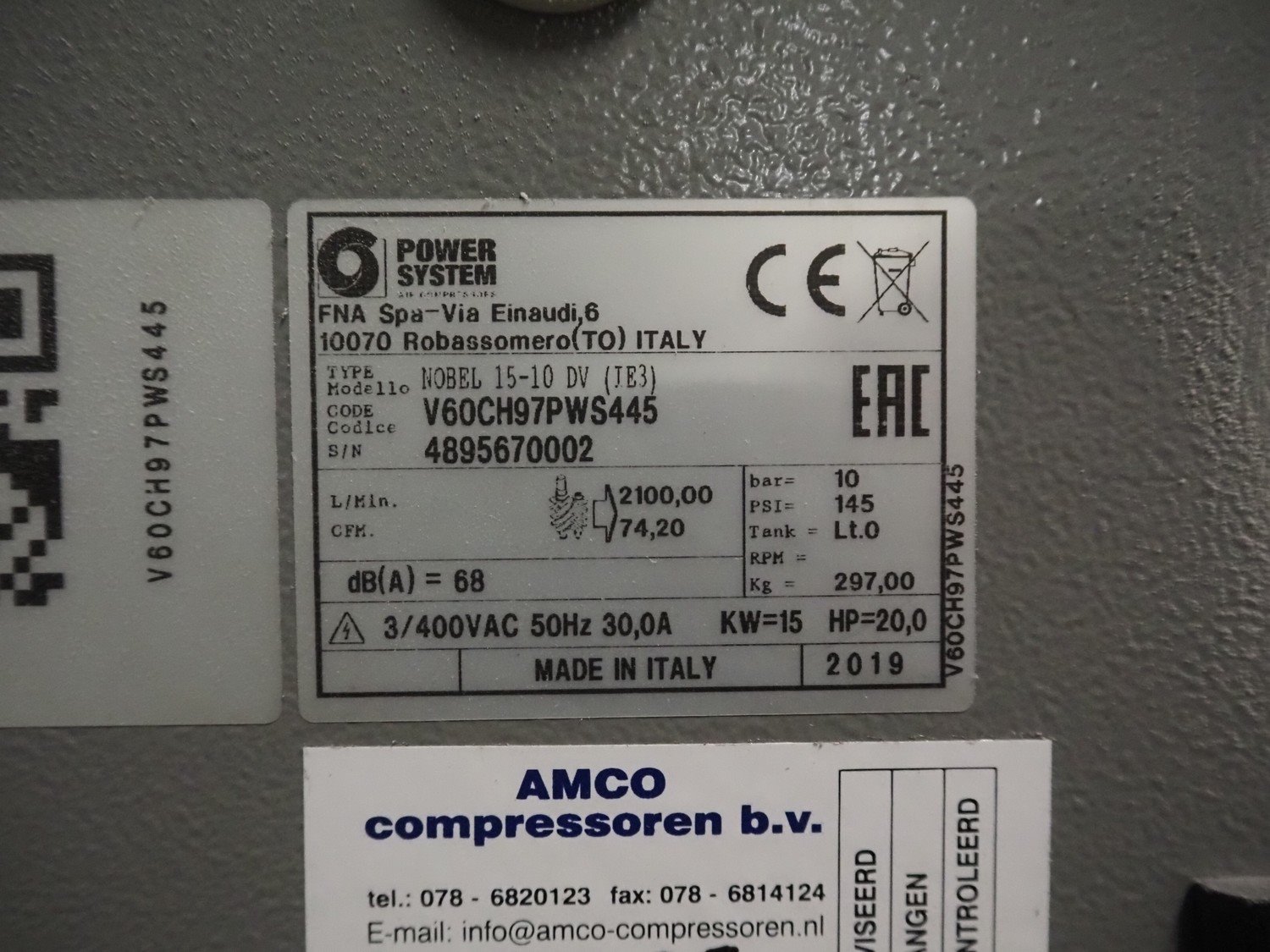 Power System air compressor, type: NOBEL 15-10 DV (IE3), serial number: 4895670002, year of construction: 2019, 400 V, 3 Ph, 50 Hz, 10 bar, 2100 liter / minute, weight: 297 kg, dimensions: 1100 mm x 750 mm x 1050 mm. Kavel locatie: Bunsenstraat 79, 3316 GC Dordrecht, Nederland