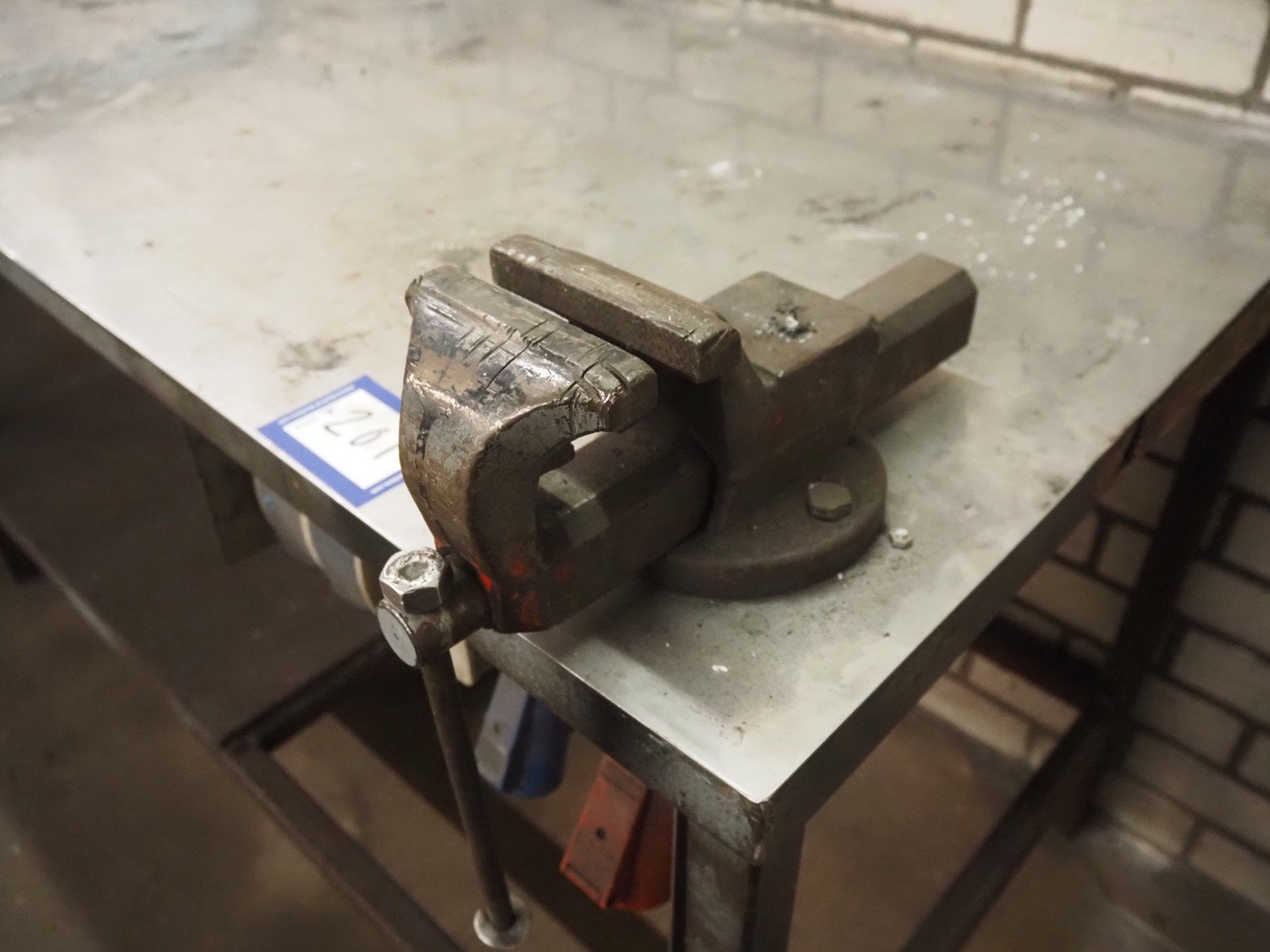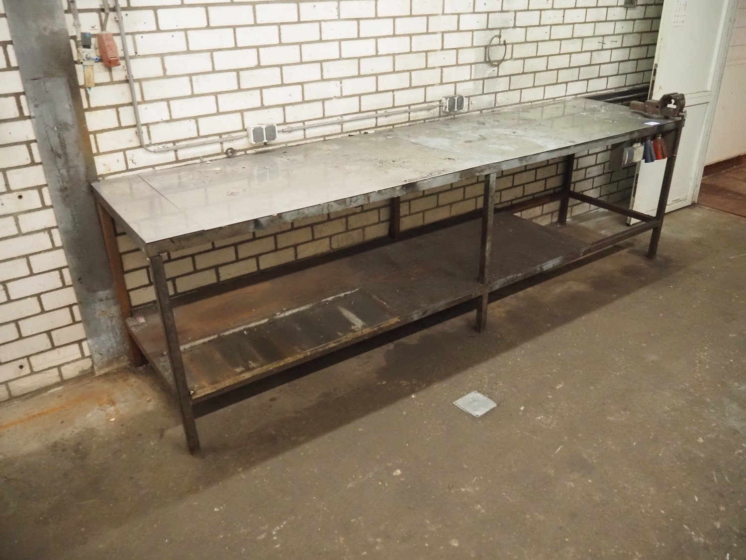 Steel work bench with bench vice, dimensions: 3200 mm x 900 mm x 1100 mm. Kavel locatie: Bunsenstraat 79, 3316 GC Dordrecht, Nederland