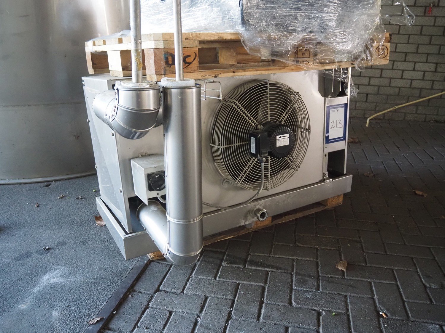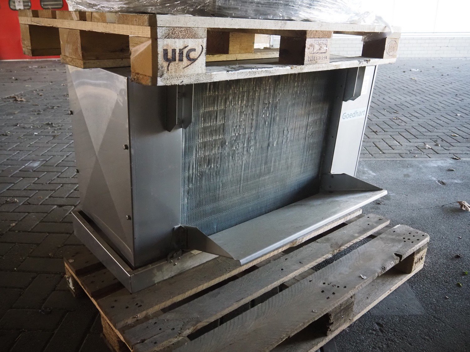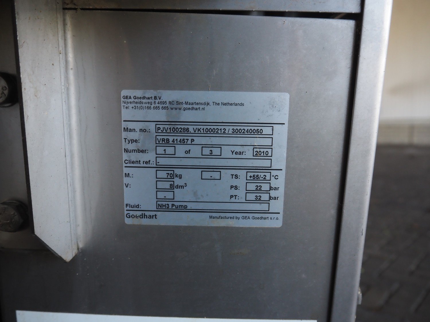 GEA Goedhart B.V. s/s evaporator, type: VRB 41457 P, year of construction: 2010, volume: 8 dm³, PS: 22 bar, PT: 32 bar, fluid: NH3 pump, weight: 70 kg, 1 fan, dimensions: 1300 mm x 600 mm x 700 mm. Kavel locatie: Bunsenstraat 79, 3316 GC Dordrecht, Nederland