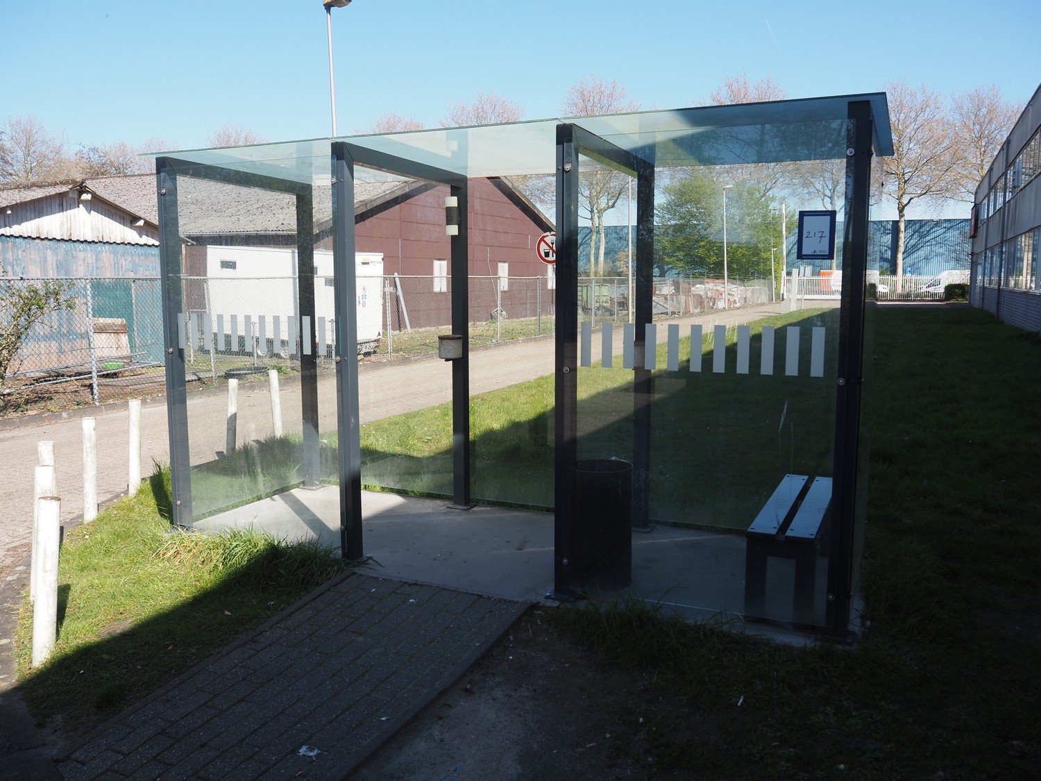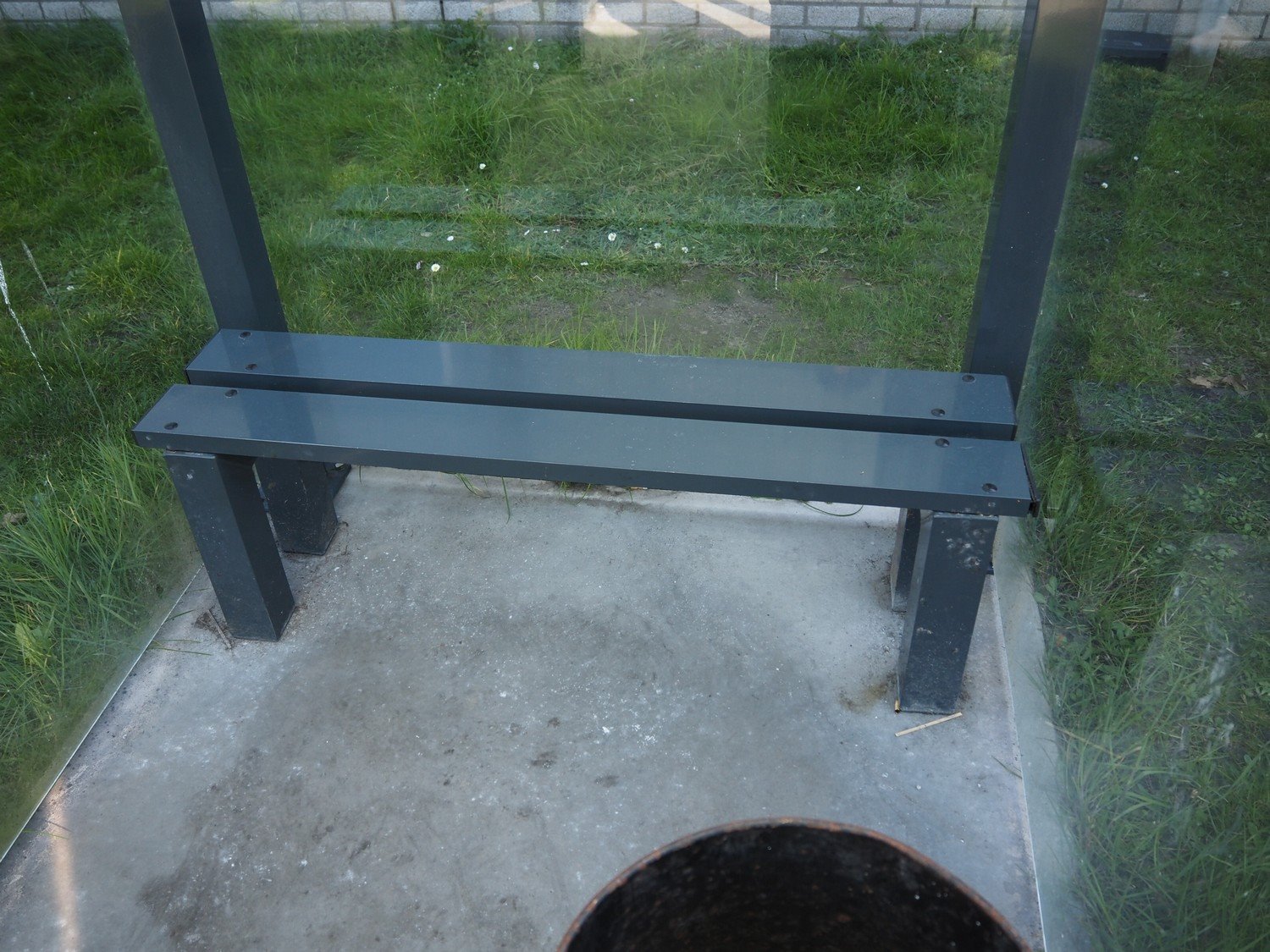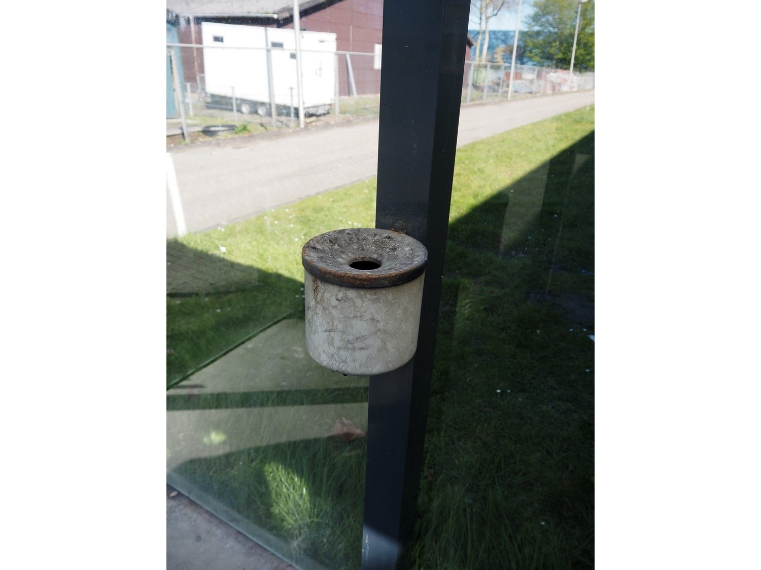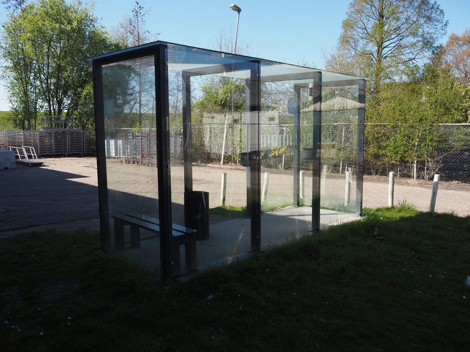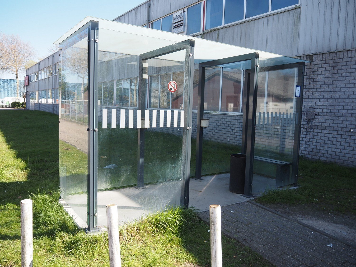 Glass smoking area, dimensions: 3800 mm x 1300 mm x 2200 mm. Including bench and ash tray. Kavel locatie: Bunsenstraat 79, 3316 GC Dordrecht, Nederland