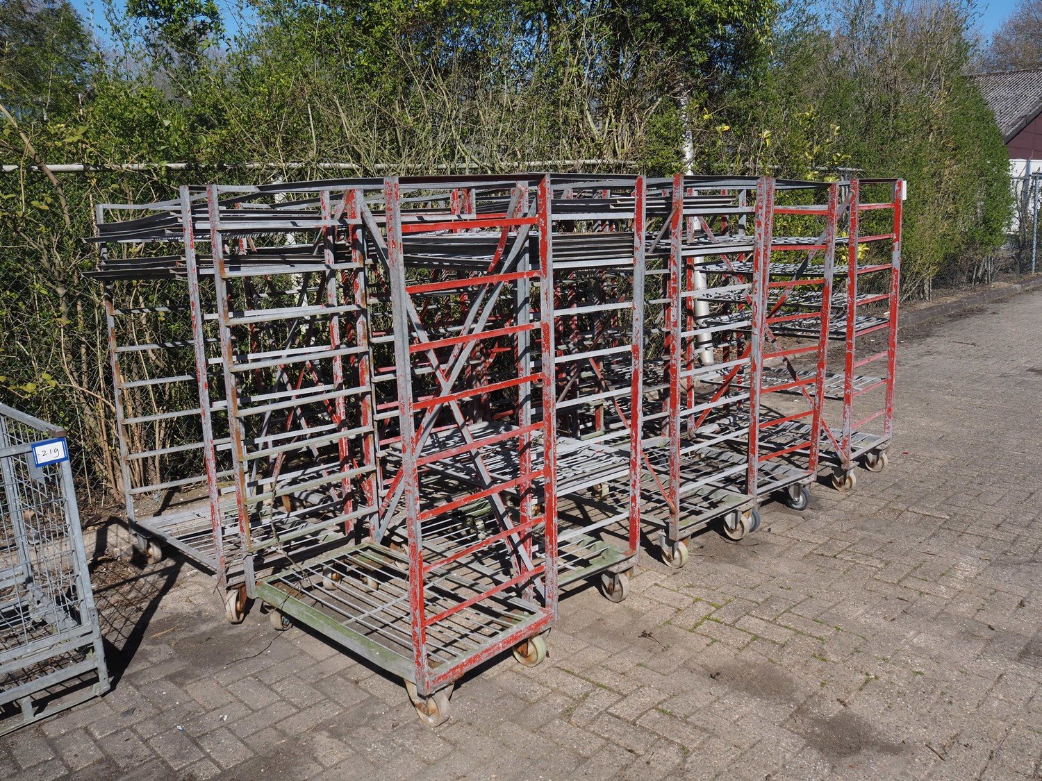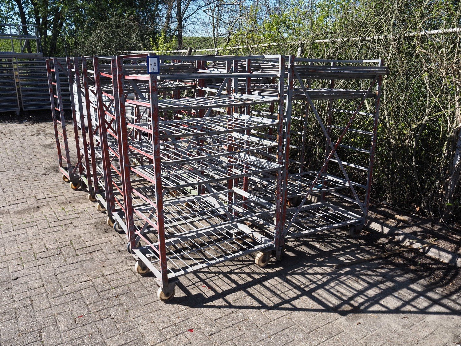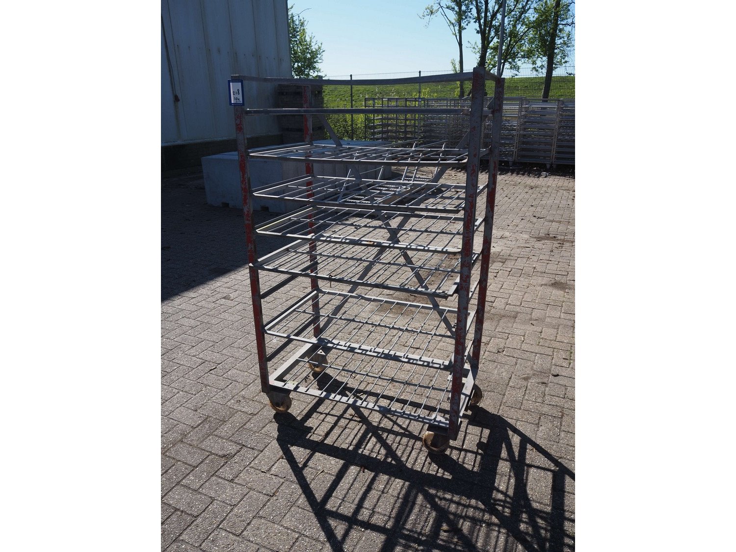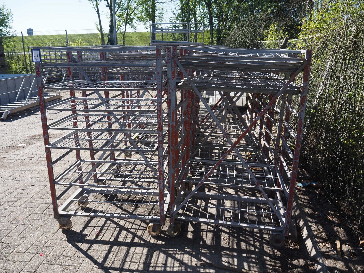 10 steel trolleys, 8 floors, dimensions floors: (8x) 920 mm x 600 mm, total dimensions: (10x) 1000 mm x 600 mm x 1650 mm. Kavel locatie: Bunsenstraat 79, 3316 GC Dordrecht, Nederland