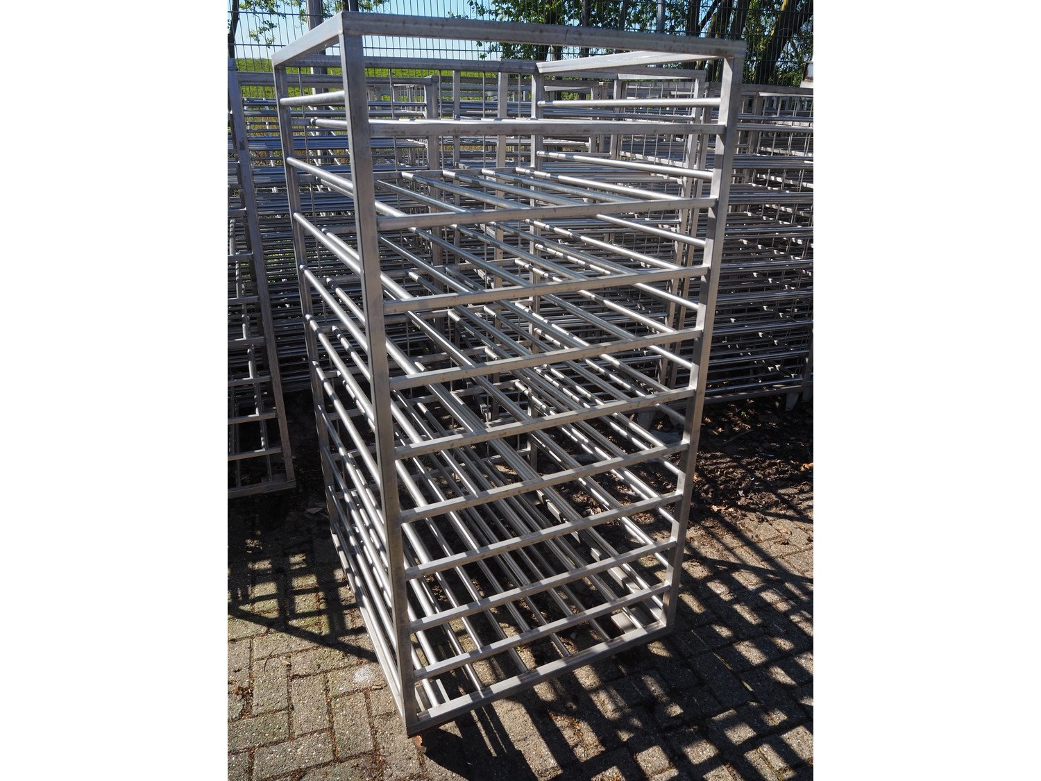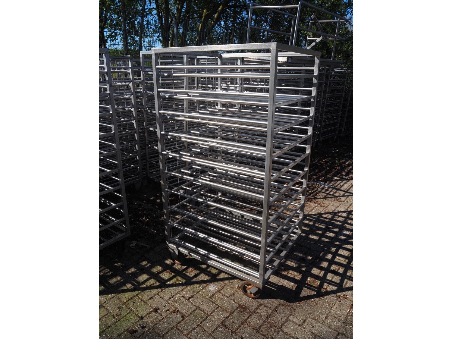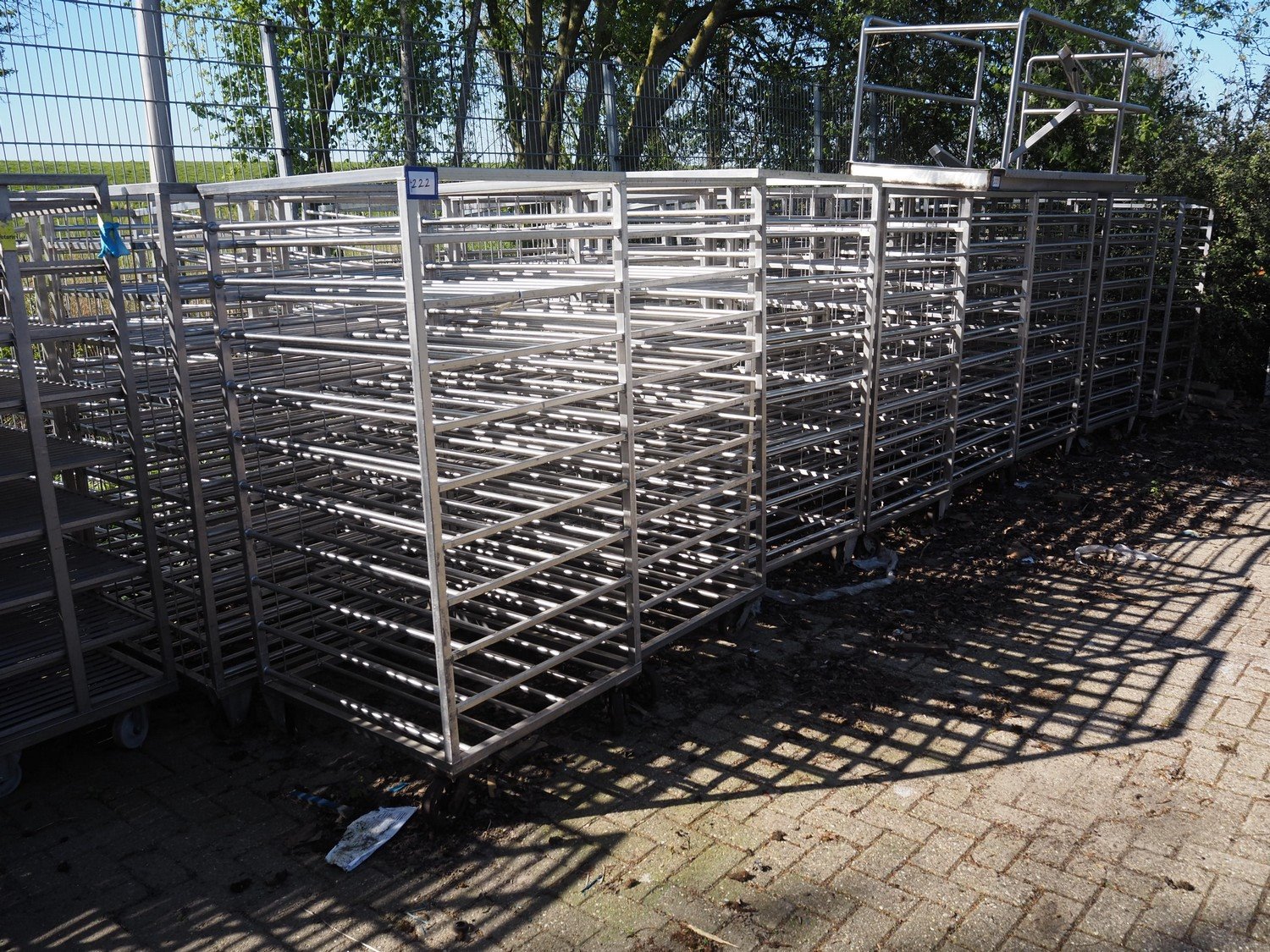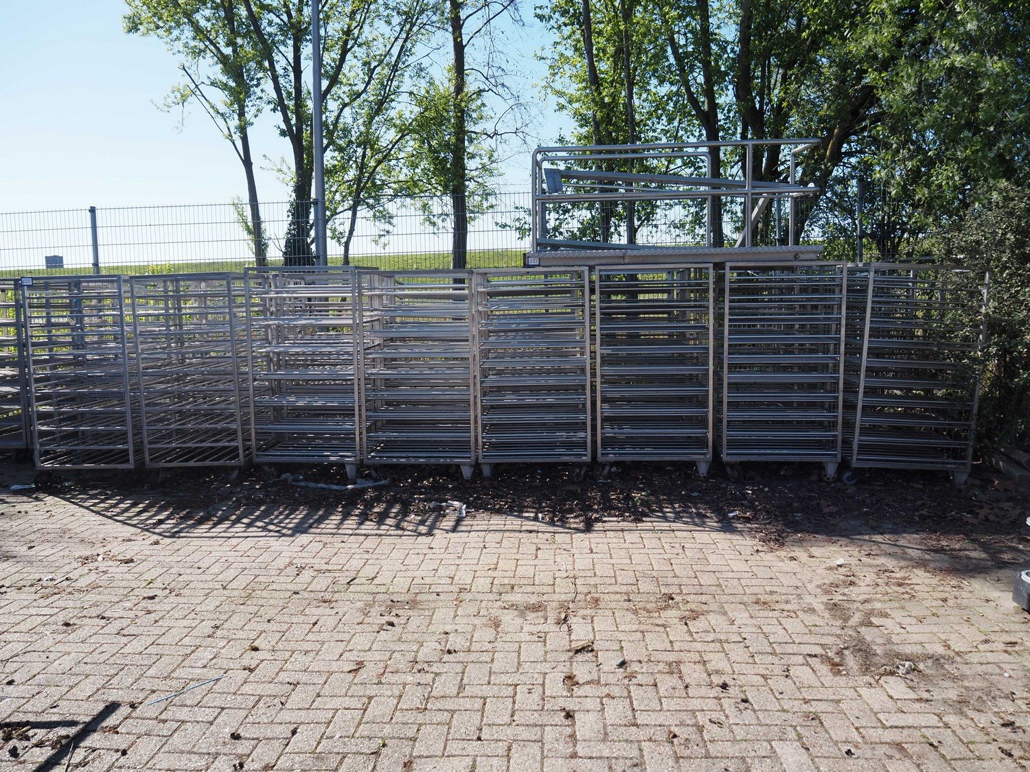 24 s/s trolleys, 10 floors, dimensions floors: (10x) 900 mm x 750 mm, total dimensions: (24x) 810 mm x 900 mm x 1700 mm. Kavel locatie: Bunsenstraat 79, 3316 GC Dordrecht, Nederland