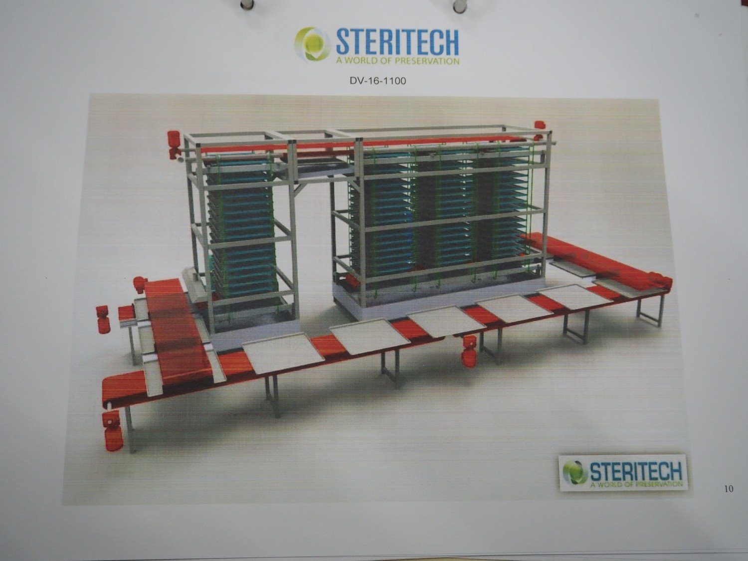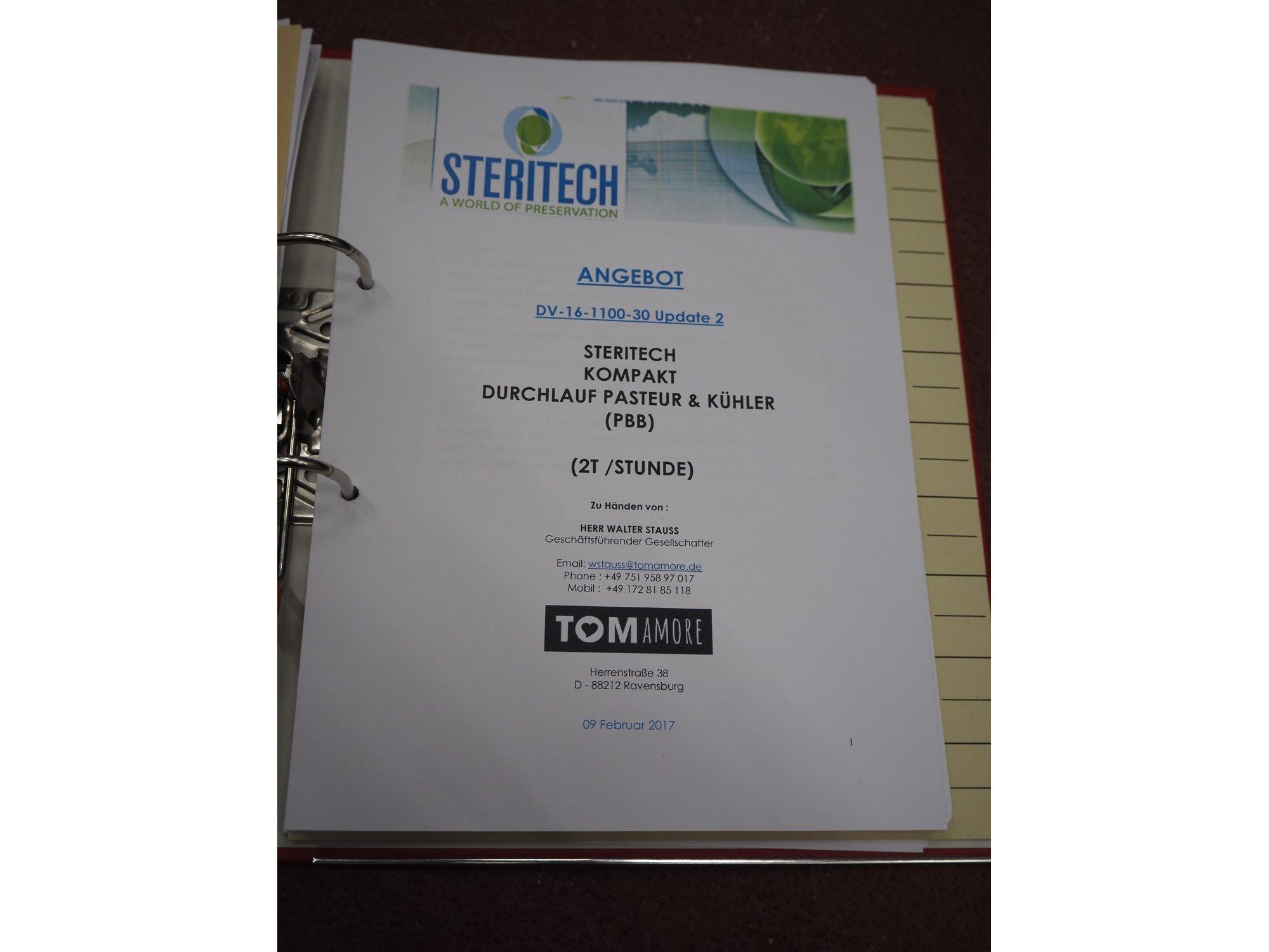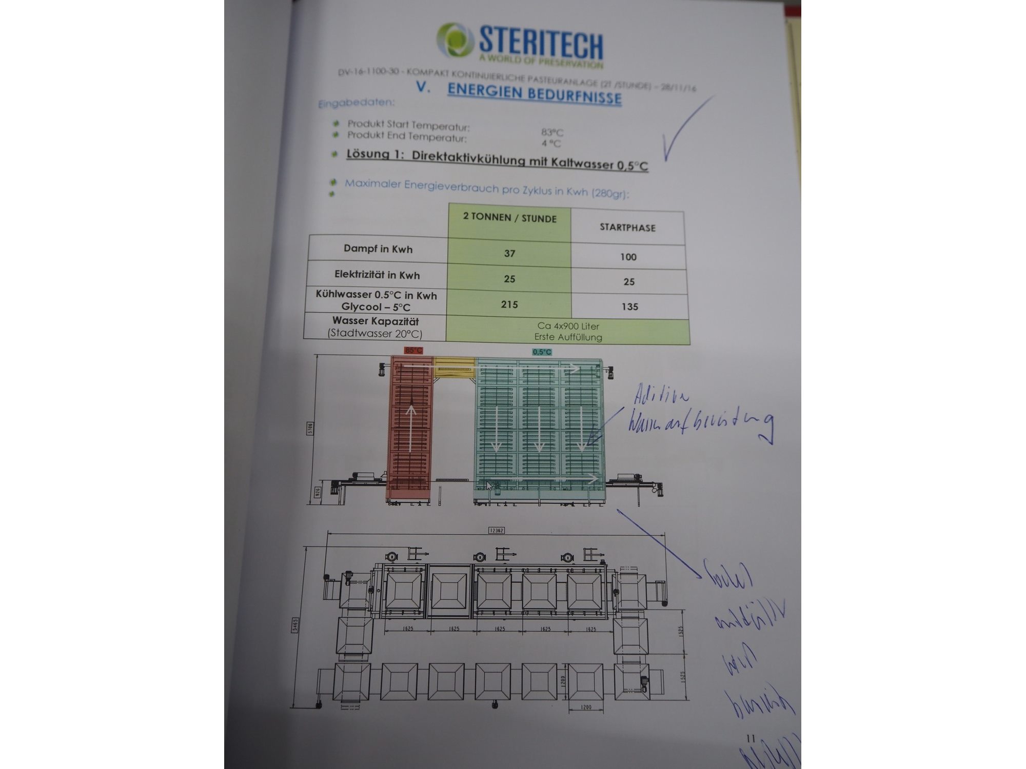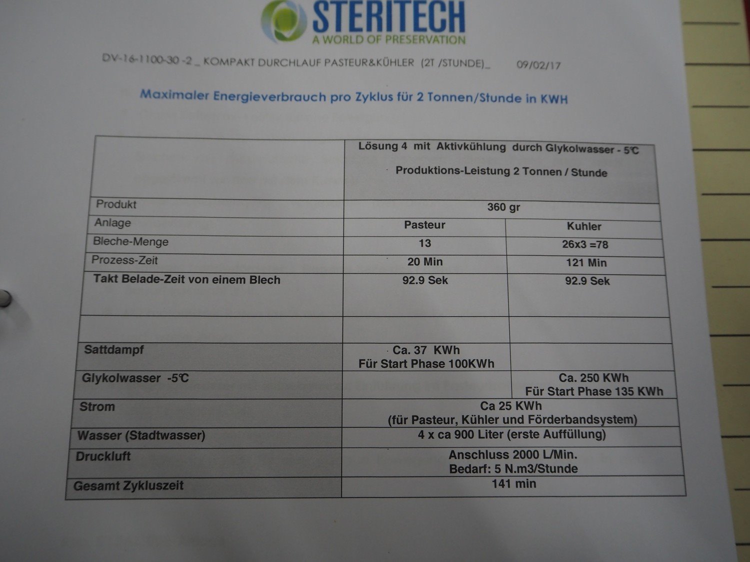 Steritech continuous pasteurizer with cooling tower consisting of: Steritech pasteurizing and cooling tower used for 360 gram cups, serial number: CV.17.0620, year of construction: 2017, consisting of 1 tower for pasteurizing and 3 towers for cooling, product: 360 gram, maximum product height: 130 mm, pasteurizing tower, 13 trays, process time: 20 minutes, full steam: ca 37 kWh, cooling towers, 26 x 3 trays = 78 pieces, process time: 121 minutes, glycol water -5°C, ca. 250 kWh, power: ca 25 kWh, water: 4 x ca. 900 liter, total cycle time: 141 minutes, capacity: 2000 kg per hour, pasteurizing tower with Tranter International AB heat exchanger, type: GCP-026PR, serial number: 246486-1, year of construction: 2017, volume: 7 & 8 liter, Wilo pump, type: BL50/140-7.5/2, cooling towers with Tranter International AB heat exchanger, type: GXD-042NR, serial number: 246486-2, year of construction: 2017, volume: (2x) 110.39 liter, Ramex SRL s/s hose reel, s/s trays for 12 x 12 cups per tray, dimensions trays: 1315 mm x 1220 mm x 50 mm, including infeed and outfeed belts for trays, total dimensions installation: 5900 mm x 13500 mm x 6000 mm Daikin screw compressor unit used for direct cooling of Steritech pasteurizing / cooling tower (294 kW/h), serial number: CH17L02196-KKKKXX, year of construction: 9/2017, 400 V, 3 Ph, 50 Hz, 227 A, weight: 2747 kg, refrigerant: R134a, consisting of 2 screw compressors, model: (2x) HSA197QS11YA, serial numbers: C-173681 and C-173680, year of construction: 09/2017, 400-460 V, 3 Ph, 50/60 Hz, total dimensions: 2700 mm x 900 mm x 2150 mm Pump installation consisting of Grundfos circulation pump, type: TPE 80-250/2 A-F-A-BQQE, model: A99113950P217380006, 90.4 m³ per hour, p/t: 16/120 bar / ˚C maximum, 2 Refairco universal liquid receivers, type: (2x) FBU-161, year of construction: 20-06-2017, volume: 160 liter, minimum temperature: -10 °C, maximum temperature: 120 °C, 37 bar, refrigerant: R134A, Reflex pressure vessel, type: Reflex N 400, serial number: 17 S 0119 90321, volume: 400 liter, minimum temperature: -10 °C, maximum temperature: 70 °C, 6 bar, Isolated storage tank, dimensions tank: 650 mm x 650 mm x 2200 mm. Thermofin GmbH roof condenser, model: X-TCH.3-091-26A-L-WE-BC-02, model: X-TCH.3-091-26A-L-WE-BC-02, unit number: 001, year of construction: 10/2017, 230 V, 5.64 kW, volume tube: 231.7 liter, empty weight: 2146 kg, 12 fans, , minimum temperature: -30 °C, maximum temperature: 120 °C, dimensions: 10200 mm x 2300 mm x 3000 mm This processing line is already dismantled by a proffesional company and stored for 4 years. Kavel locatie: Mikulášovická 552, 40778 Velký Šenov, Tsjechië