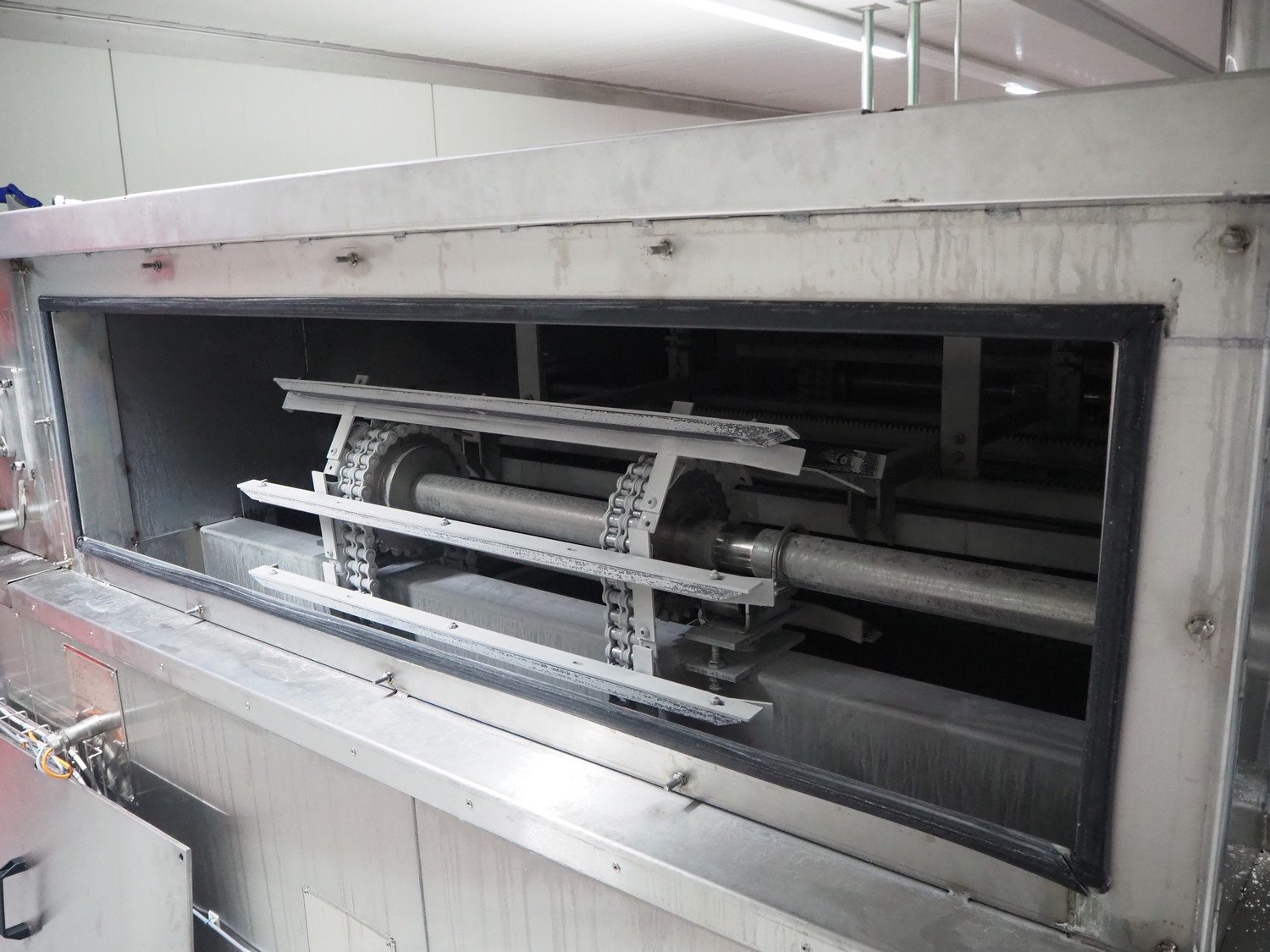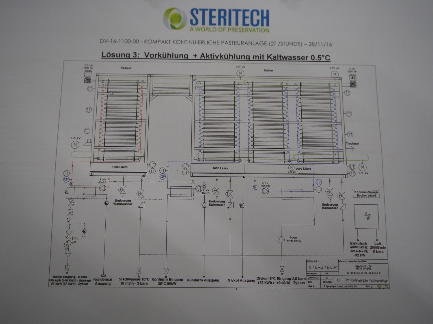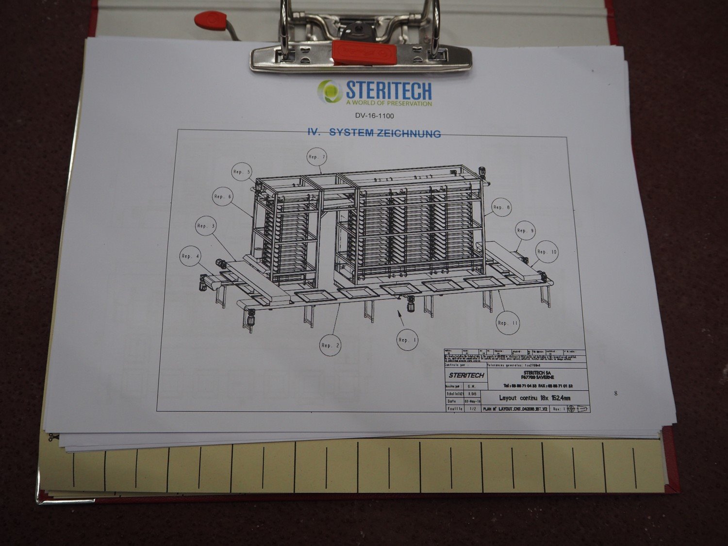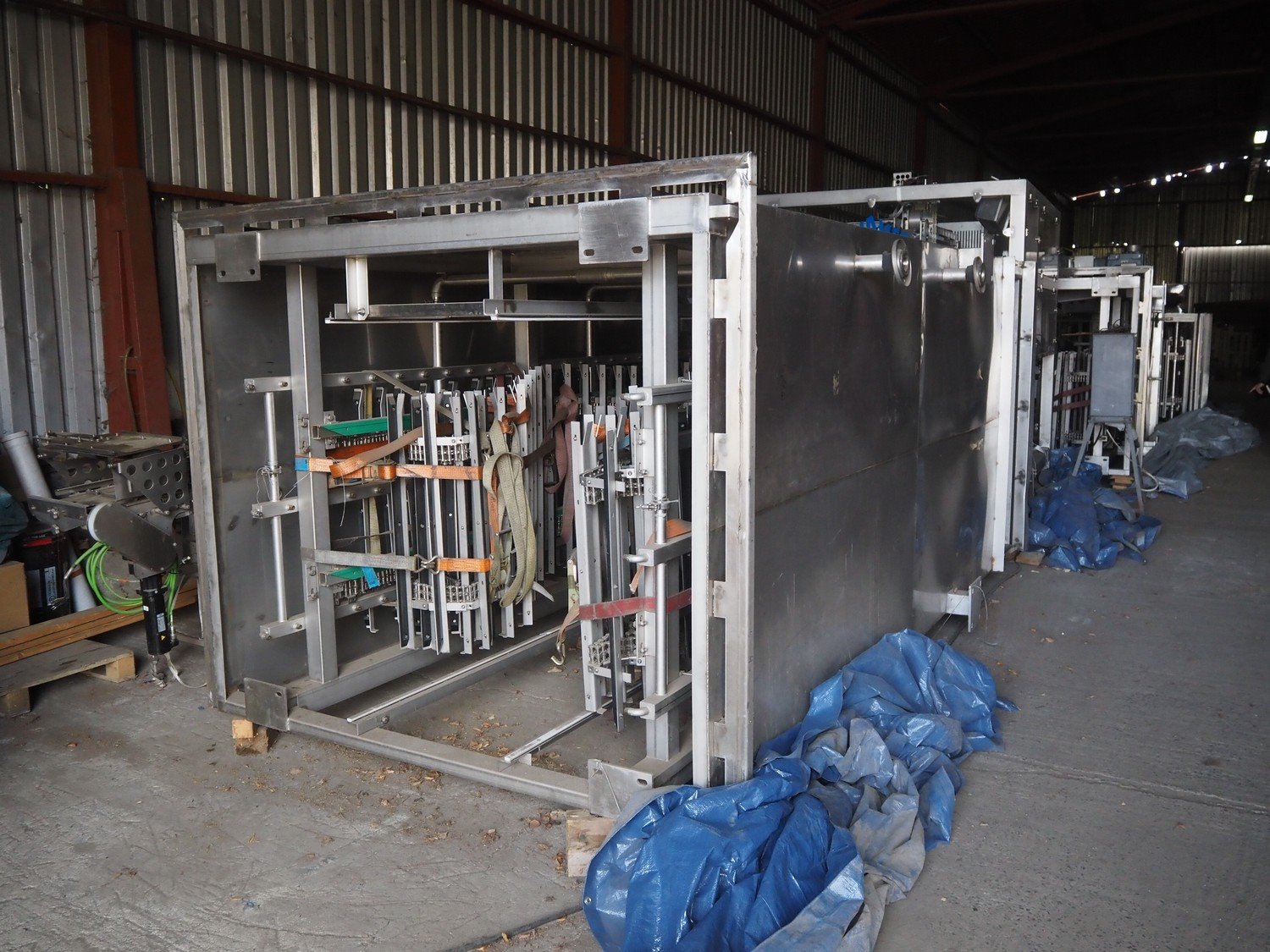Steritech continuous pasteurizer with cooling tower consisting of: Steritech pasteurizing and cooling tower used for 360 gram cups, serial number: CV.17.0620, year of construction: 2017, consisting of 1 tower for pasteurizing and 3 towers for cooling, product: 360 gram, maximum product height: 130 mm, pasteurizing tower, 13 trays, process time: 20 minutes, full steam: ca 37 kWh, cooling towers, 26 x 3 trays = 78 pieces, process time: 121 minutes, glycol water -5°C, ca. 250 kWh, power: ca 25 kWh, water: 4 x ca. 900 liter, total cycle time: 141 minutes, capacity: 2000 kg per hour, pasteurizing tower with Tranter International AB heat exchanger, type: GCP-026PR, serial number: 246486-1, year of construction: 2017, volume: 7 & 8 liter, Wilo pump, type: BL50/140-7.5/2, cooling towers with Tranter International AB heat exchanger, type: GXD-042NR, serial number: 246486-2, year of construction: 2017, volume: (2x) 110.39 liter, Ramex SRL s/s hose reel, s/s trays for 12 x 12 cups per tray, dimensions trays: 1315 mm x 1220 mm x 50 mm, including infeed and outfeed belts for trays, total dimensions installation: 5900 mm x 13500 mm x 6000 mm Daikin screw compressor unit used for direct cooling of Steritech pasteurizing / cooling tower (294 kW/h), serial number: CH17L02196-KKKKXX, year of construction: 9/2017, 400 V, 3 Ph, 50 Hz, 227 A, weight: 2747 kg, refrigerant: R134a, consisting of 2 screw compressors, model: (2x) HSA197QS11YA, serial numbers: C-173681 and C-173680, year of construction: 09/2017, 400-460 V, 3 Ph, 50/60 Hz, total dimensions: 2700 mm x 900 mm x 2150 mm Pump installation consisting of Grundfos circulation pump, type: TPE 80-250/2 A-F-A-BQQE, model: A99113950P217380006, 90.4 m³ per hour, p/t: 16/120 bar / ˚C maximum, 2 Refairco universal liquid receivers, type: (2x) FBU-161, year of construction: 20-06-2017, volume: 160 liter, minimum temperature: -10 °C, maximum temperature: 120 °C, 37 bar, refrigerant: R134A, Reflex pressure vessel, type: Reflex N 400, serial number: 17 S 0119 90321, volume: 400 liter, minimum temperature: -10 °C, maximum temperature: 70 °C, 6 bar, Isolated storage tank, dimensions tank: 650 mm x 650 mm x 2200 mm. Thermofin GmbH roof condenser, model: X-TCH.3-091-26A-L-WE-BC-02, model: X-TCH.3-091-26A-L-WE-BC-02, unit number: 001, year of construction: 10/2017, 230 V, 5.64 kW, volume tube: 231.7 liter, empty weight: 2146 kg, 12 fans, , minimum temperature: -30 °C, maximum temperature: 120 °C, dimensions: 10200 mm x 2300 mm x 3000 mm This processing line is already dismantled by a proffesional company and stored for 4 years. Kavel locatie: Mikulášovická 552, 40778 Velký Šenov, Tsjechië