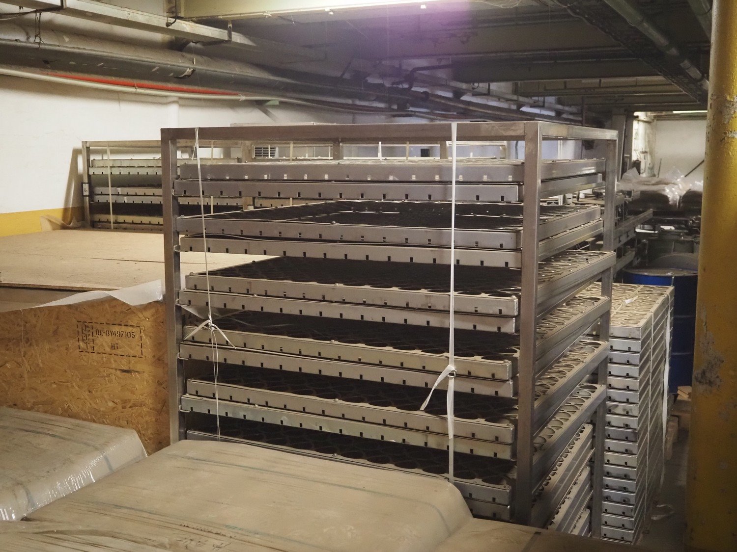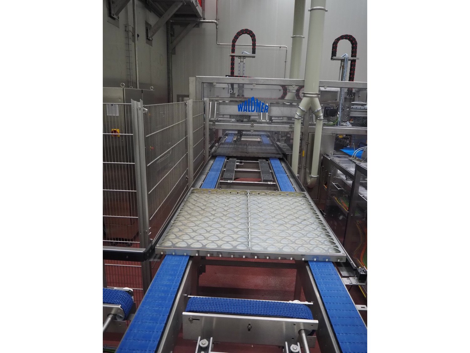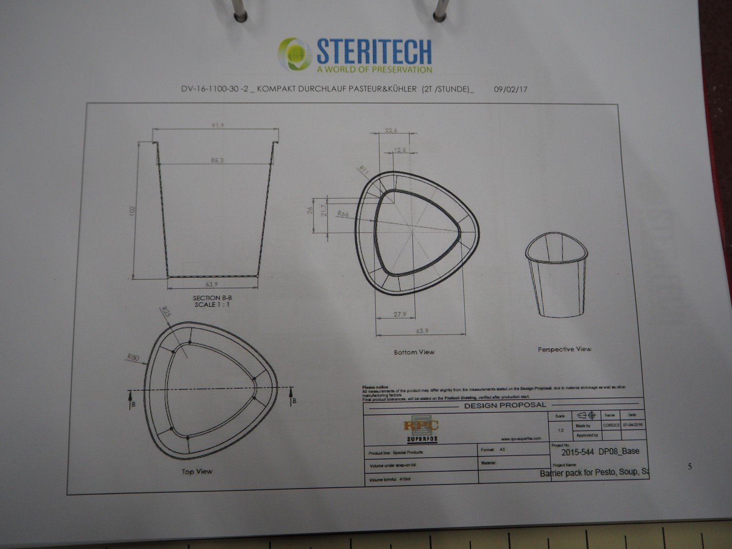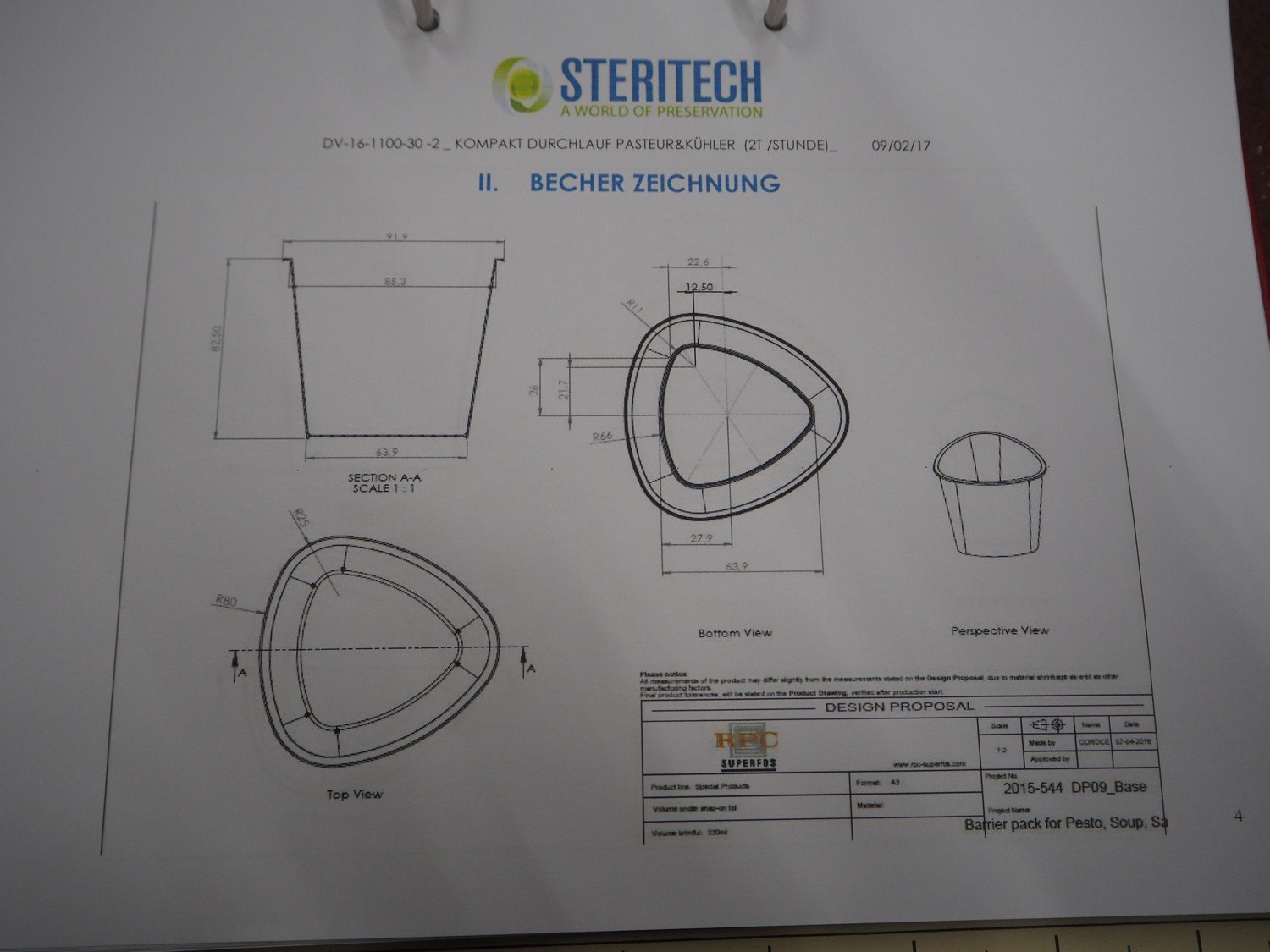 Steritech continuous pasteurizer with cooling tower consisting of: Steritech pasteurizing and cooling tower used for 360 gram cups, serial number: CV.17.0620, year of construction: 2017, consisting of 1 tower for pasteurizing and 3 towers for cooling, product: 360 gram, maximum product height: 130 mm, pasteurizing tower, 13 trays, process time: 20 minutes, full steam: ca 37 kWh, cooling towers, 26 x 3 trays = 78 pieces, process time: 121 minutes, glycol water -5°C, ca. 250 kWh, power: ca 25 kWh, water: 4 x ca. 900 liter, total cycle time: 141 minutes, capacity: 2000 kg per hour, pasteurizing tower with Tranter International AB heat exchanger, type: GCP-026PR, serial number: 246486-1, year of construction: 2017, volume: 7 & 8 liter, Wilo pump, type: BL50/140-7.5/2, cooling towers with Tranter International AB heat exchanger, type: GXD-042NR, serial number: 246486-2, year of construction: 2017, volume: (2x) 110.39 liter, Ramex SRL s/s hose reel, s/s trays for 12 x 12 cups per tray, dimensions trays: 1315 mm x 1220 mm x 50 mm, including infeed and outfeed belts for trays, total dimensions installation: 5900 mm x 13500 mm x 6000 mm Daikin screw compressor unit used for direct cooling of Steritech pasteurizing / cooling tower (294 kW/h), serial number: CH17L02196-KKKKXX, year of construction: 9/2017, 400 V, 3 Ph, 50 Hz, 227 A, weight: 2747 kg, refrigerant: R134a, consisting of 2 screw compressors, model: (2x) HSA197QS11YA, serial numbers: C-173681 and C-173680, year of construction: 09/2017, 400-460 V, 3 Ph, 50/60 Hz, total dimensions: 2700 mm x 900 mm x 2150 mm Pump installation consisting of Grundfos circulation pump, type: TPE 80-250/2 A-F-A-BQQE, model: A99113950P217380006, 90.4 m³ per hour, p/t: 16/120 bar / ˚C maximum, 2 Refairco universal liquid receivers, type: (2x) FBU-161, year of construction: 20-06-2017, volume: 160 liter, minimum temperature: -10 °C, maximum temperature: 120 °C, 37 bar, refrigerant: R134A, Reflex pressure vessel, type: Reflex N 400, serial number: 17 S 0119 90321, volume: 400 liter, minimum temperature: -10 °C, maximum temperature: 70 °C, 6 bar, Isolated storage tank, dimensions tank: 650 mm x 650 mm x 2200 mm. Thermofin GmbH roof condenser, model: X-TCH.3-091-26A-L-WE-BC-02, model: X-TCH.3-091-26A-L-WE-BC-02, unit number: 001, year of construction: 10/2017, 230 V, 5.64 kW, volume tube: 231.7 liter, empty weight: 2146 kg, 12 fans, , minimum temperature: -30 °C, maximum temperature: 120 °C, dimensions: 10200 mm x 2300 mm x 3000 mm This processing line is already dismantled by a proffesional company and stored for 4 years. Kavel locatie: Mikulášovická 552, 40778 Velký Šenov, Tsjechië