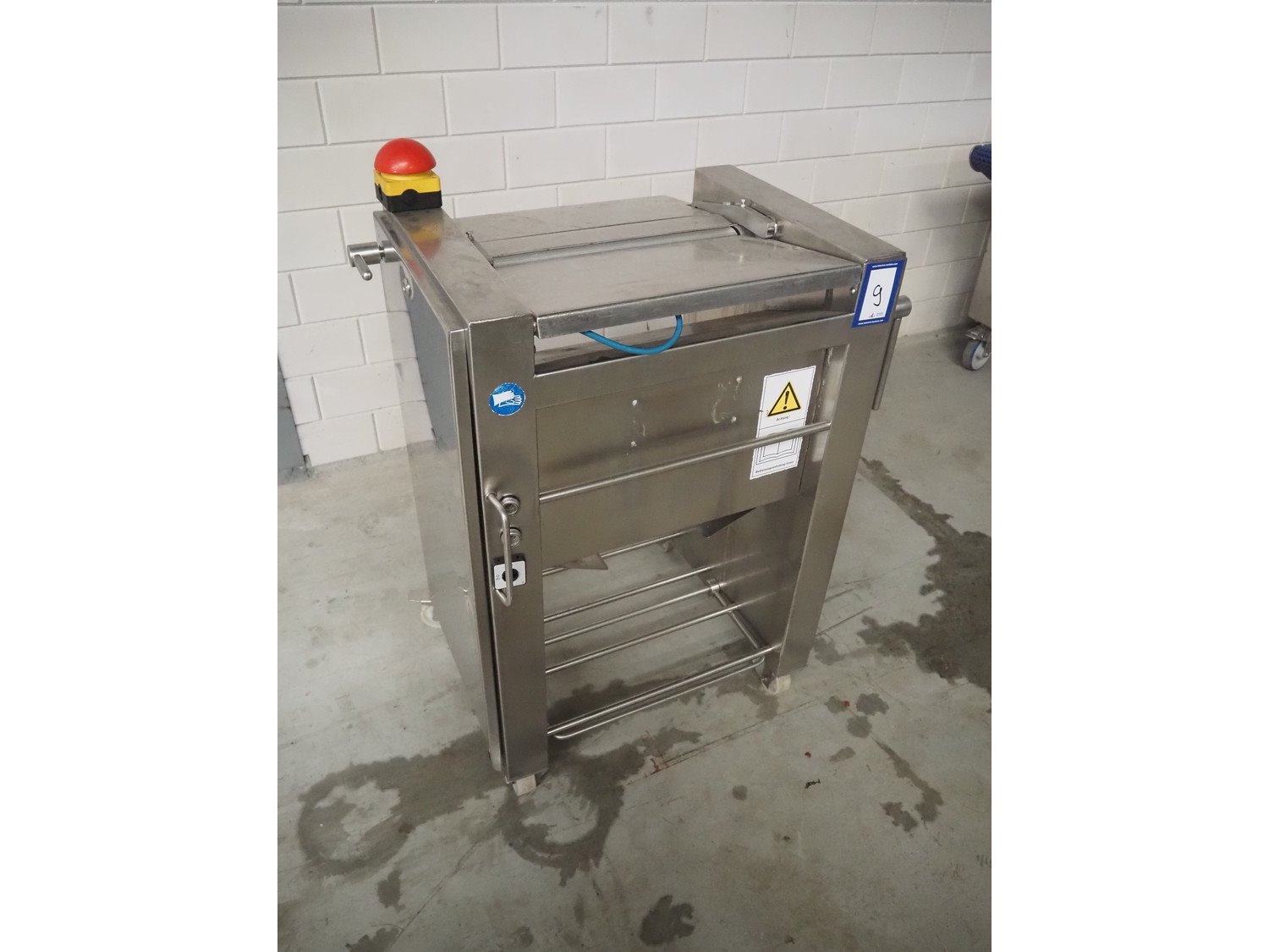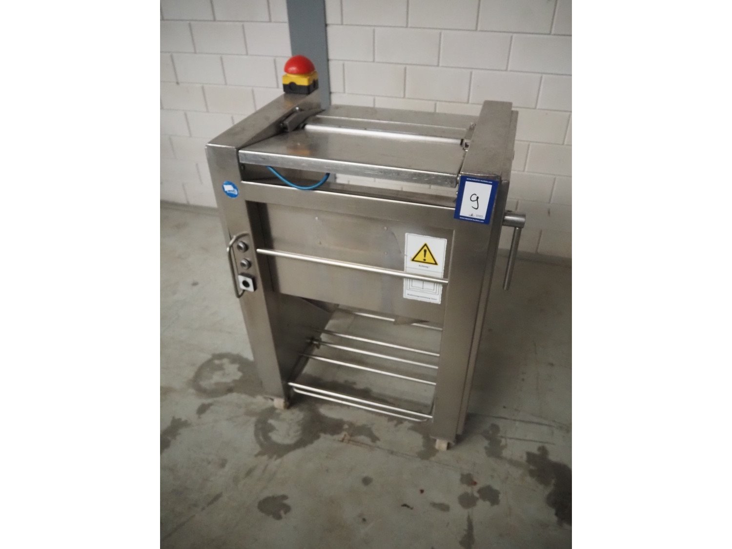 S/s skinning machine, working width: 430 mm, total dimensions: 750 mm x 620 mm x 1120 mm. Kavel locatie: Makkummerwaard 3, 8321 WV Urk, Nederland