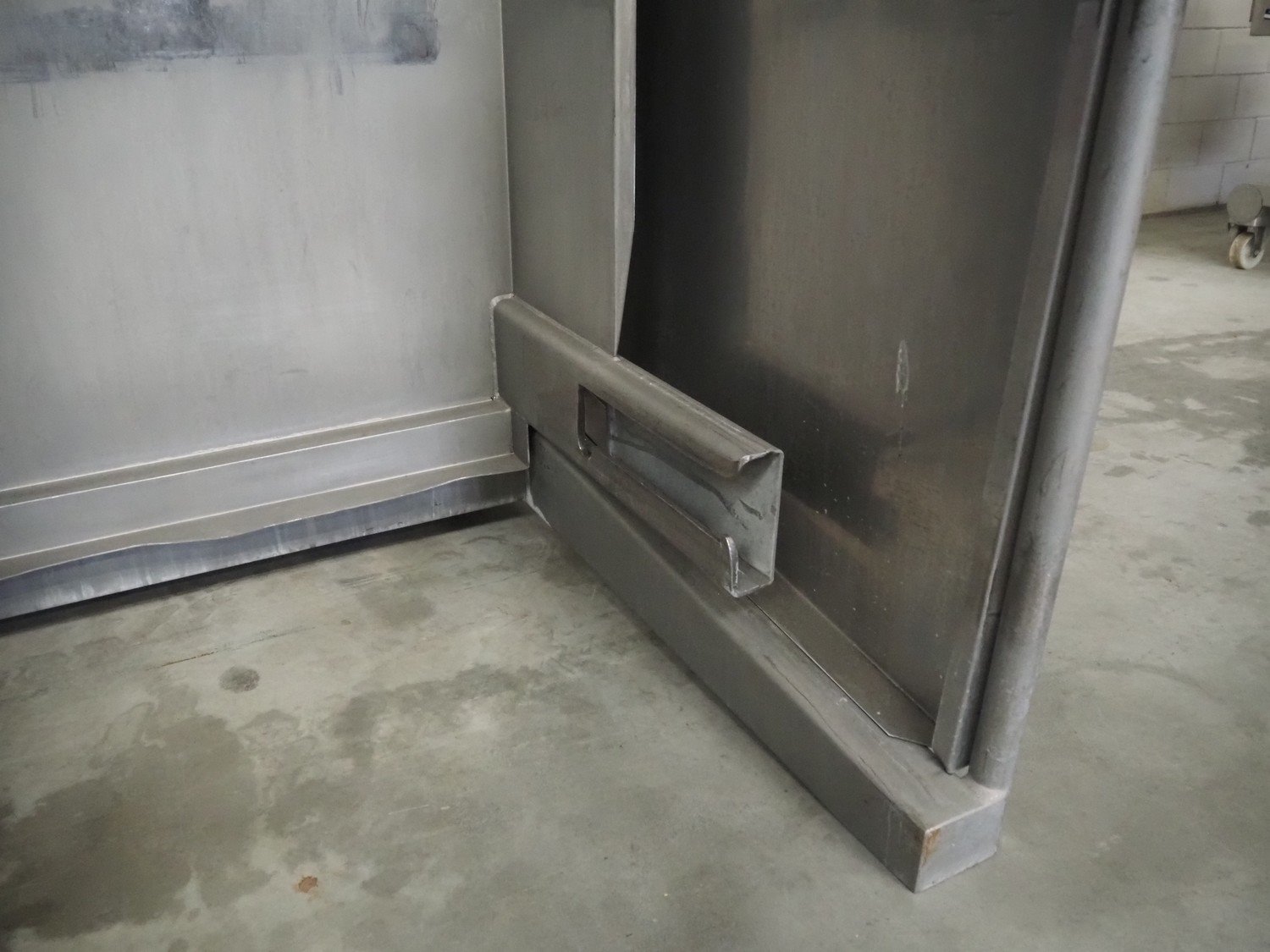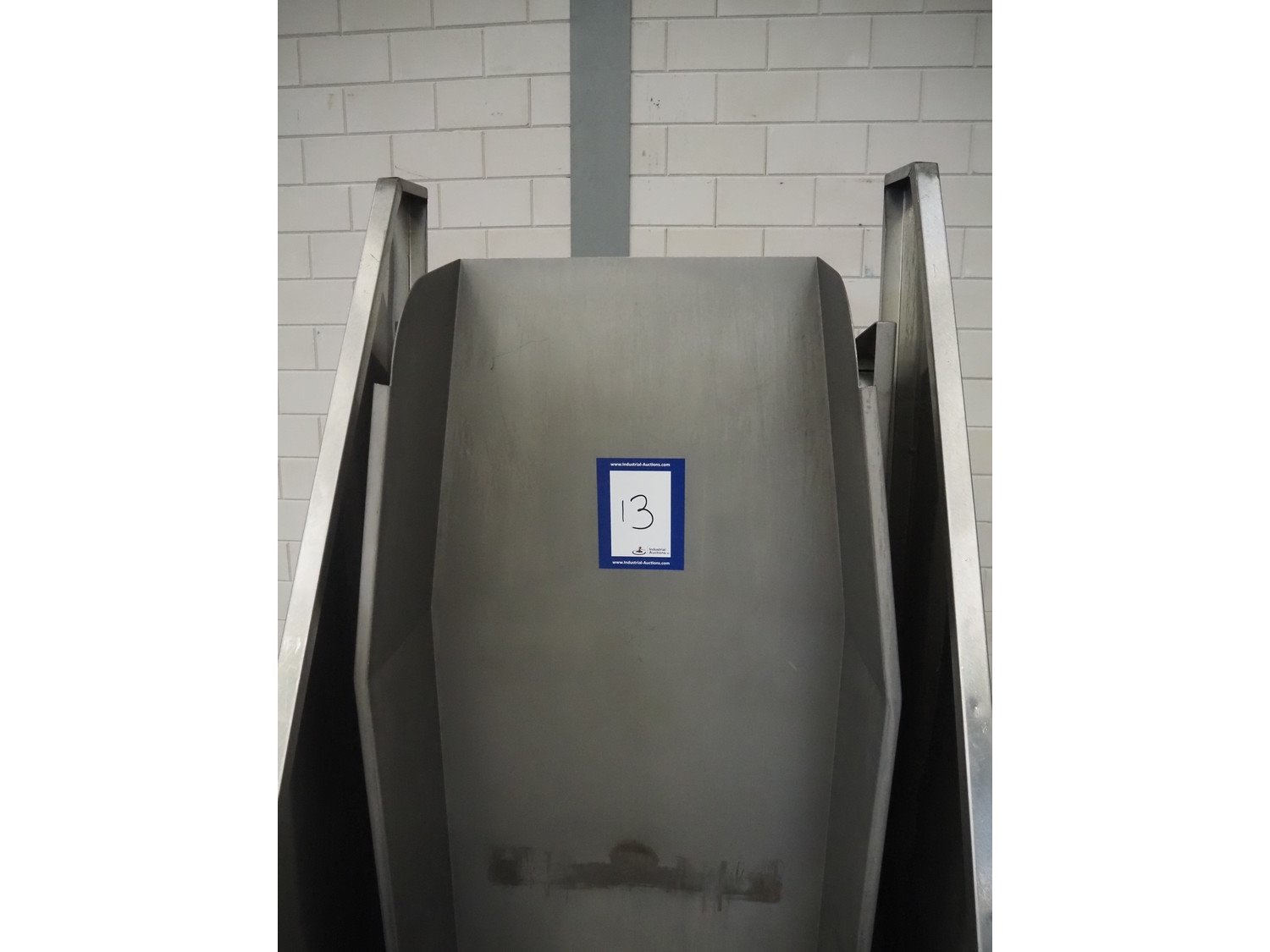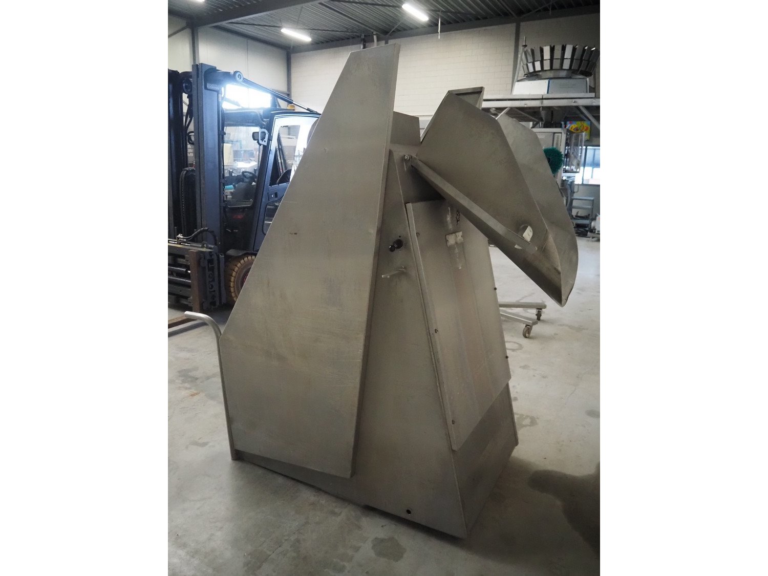 Mobile s/s tilting device for 200 liter meat bins, dimensions: 1800 mm x 1000 mm x 1950 mm. Kavel locatie: Makkummerwaard 3, 8321 WV Urk, Nederland