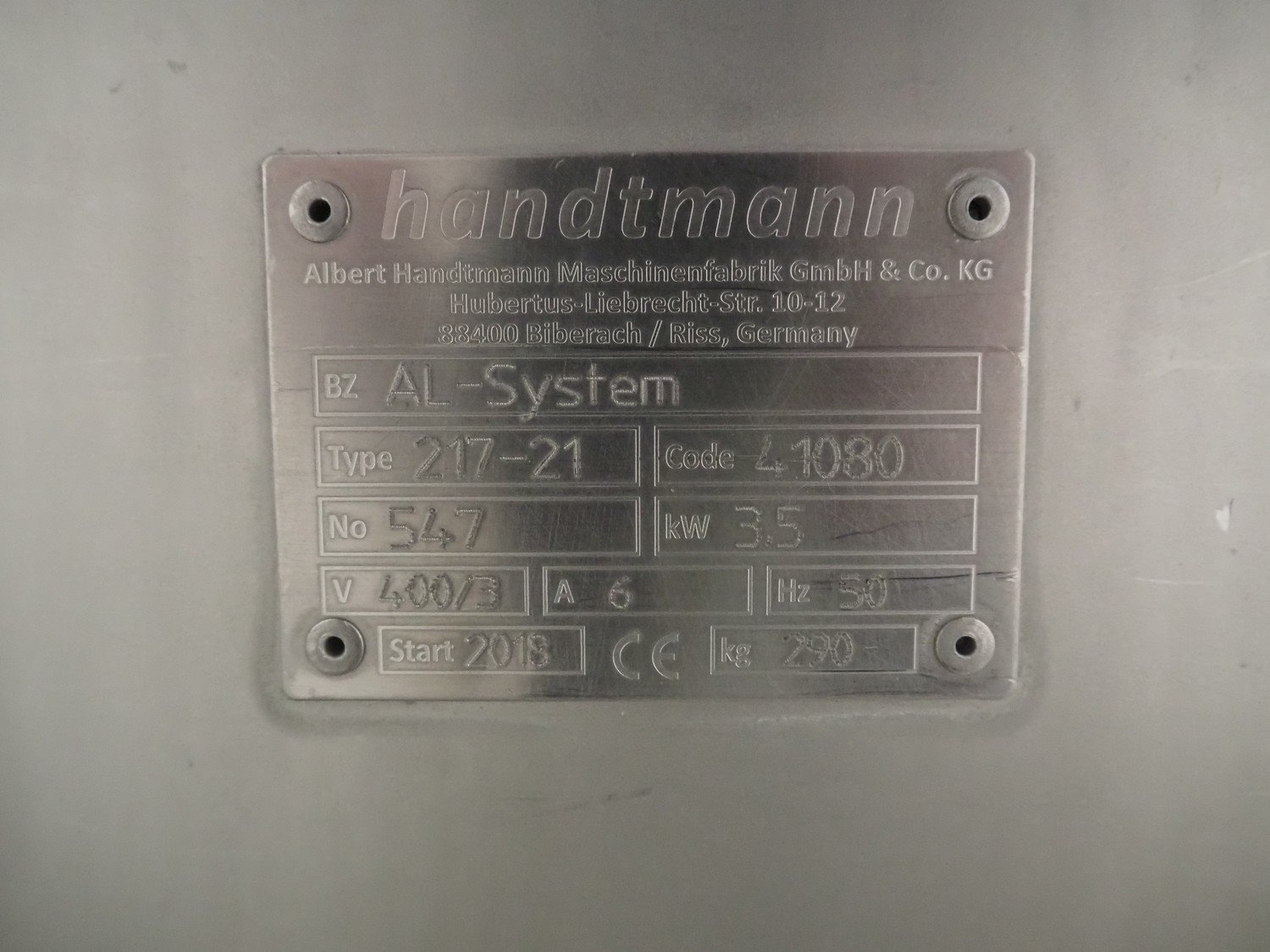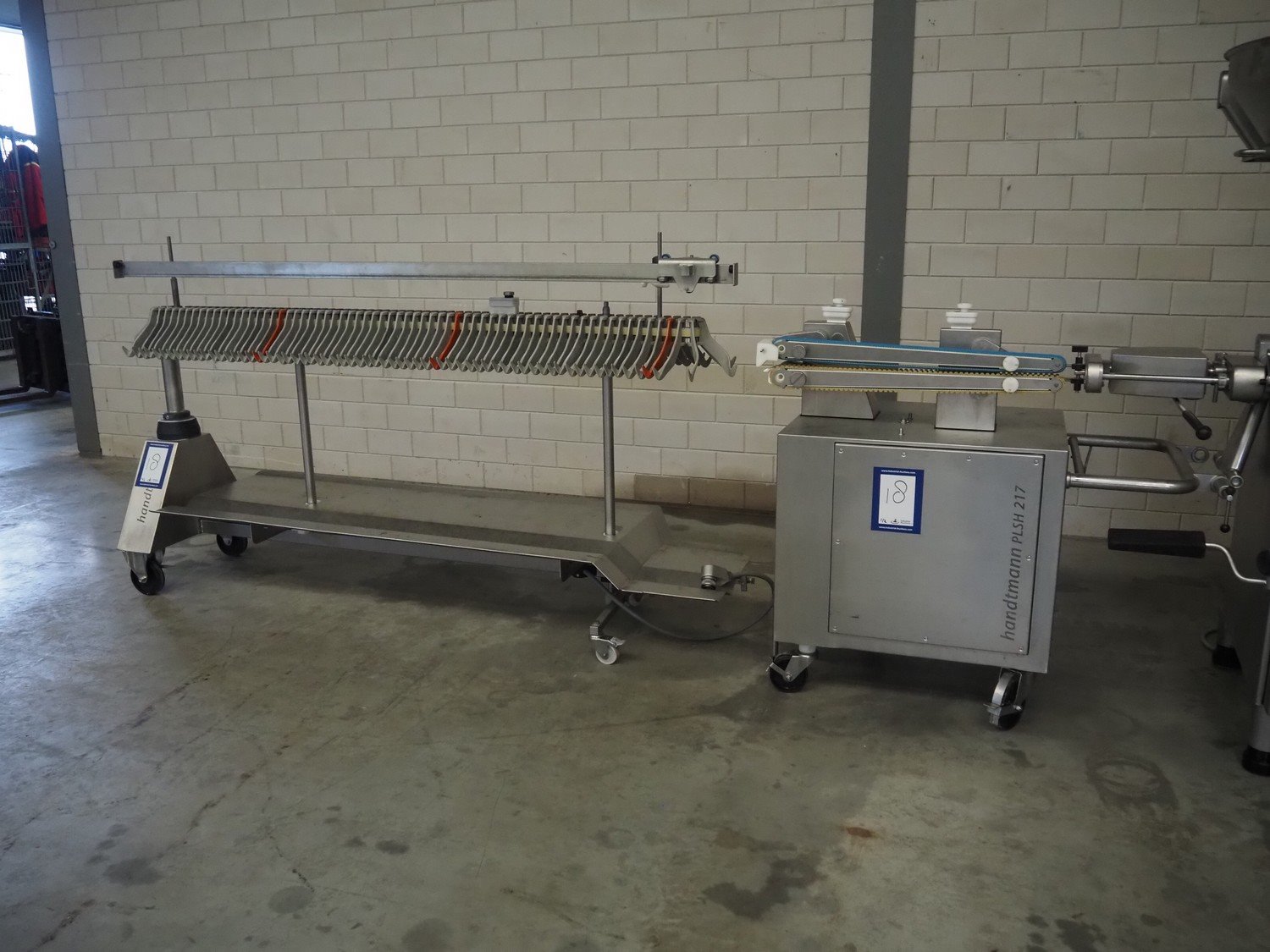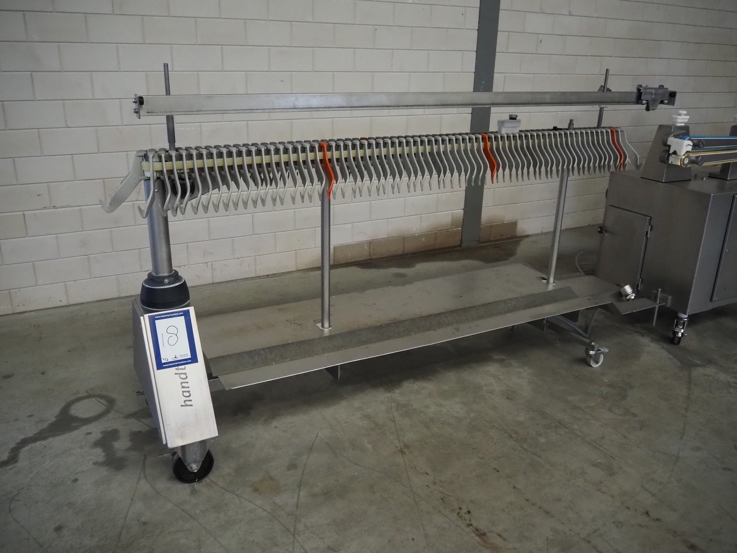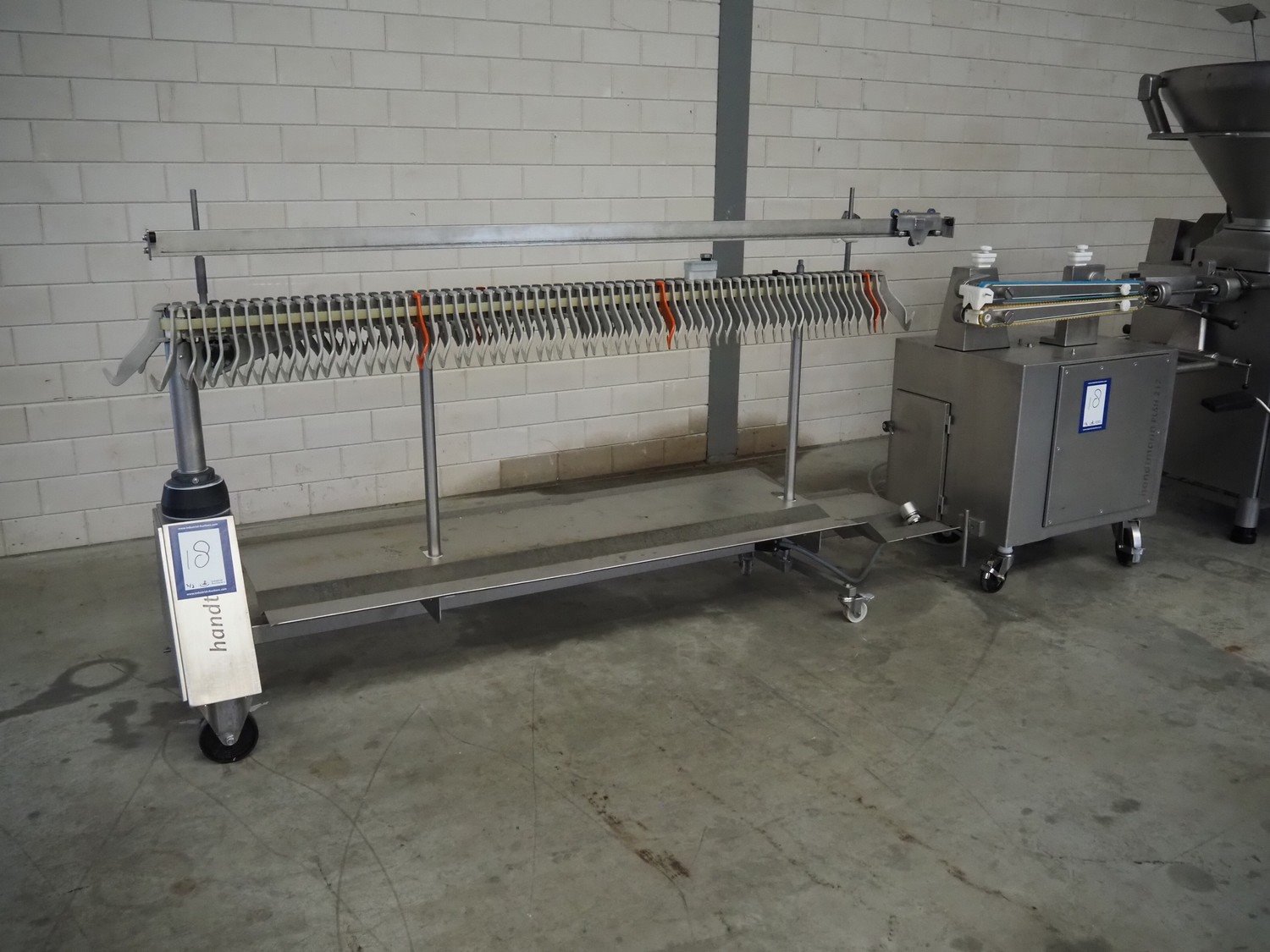 Handtmann mobile linking and hanging line, type linking machine: 217-21, number: 547, year of construction: 2018, 400 V, 3 Ph, 50 Hz, 6 A, 3.5 kW, weight: 290 kg, dimensions: 1300 mm x 700 mm x 1200 mm, type hanging line: 242-16, number: 10903516, year of construction: 2018, weight: 210 kg, dimensions: 2550 mm x 720 mm x 1400 mm. Including extra parts. Kavel locatie: Makkummerwaard 3, 8321 WV Urk, Nederland