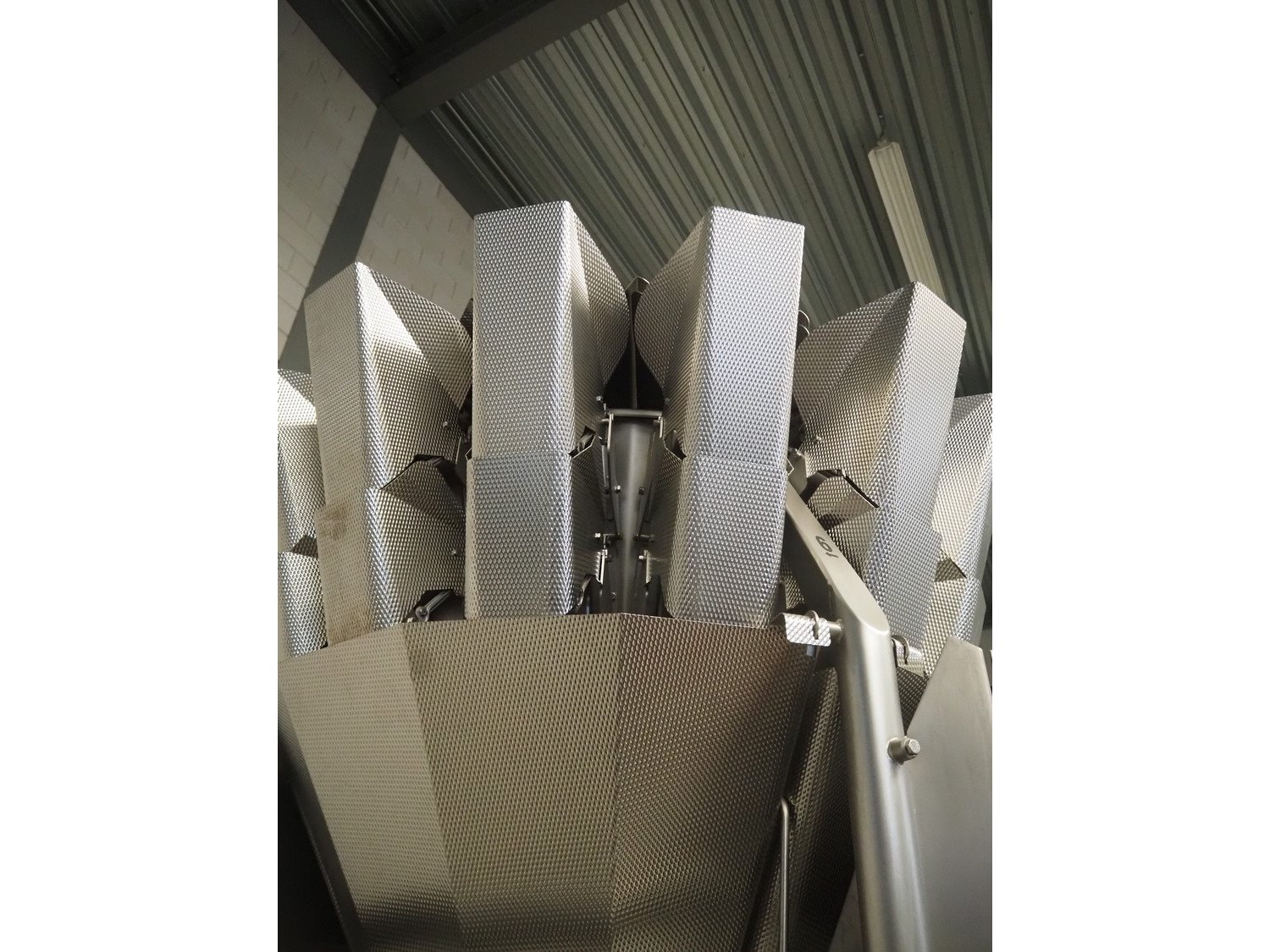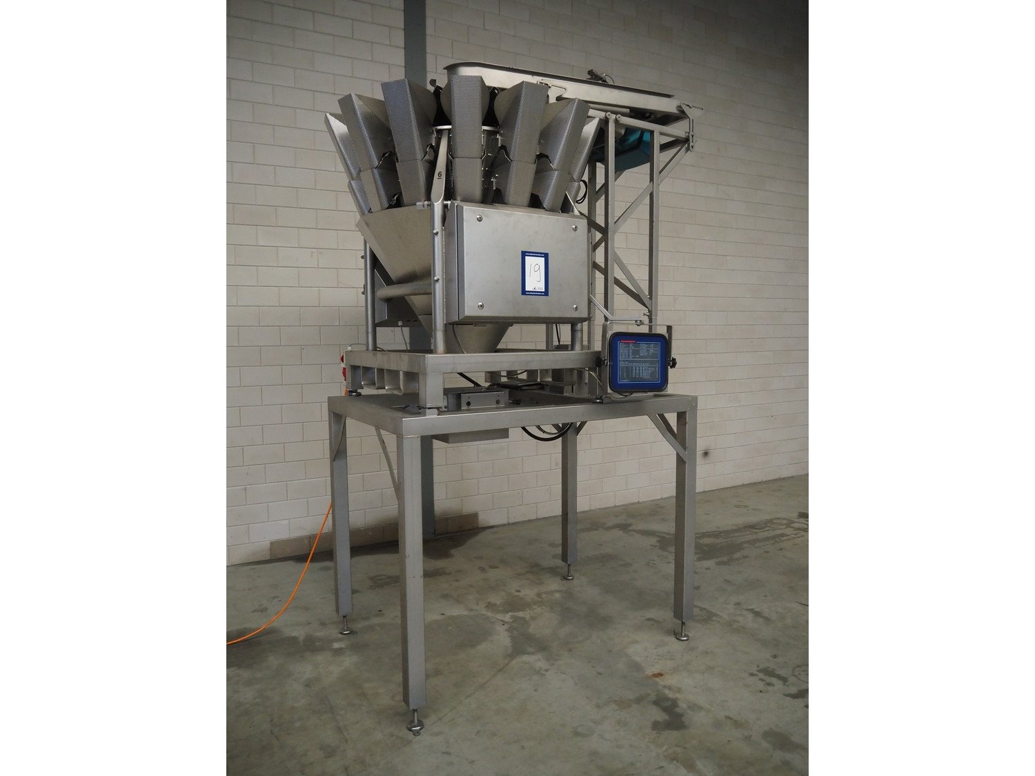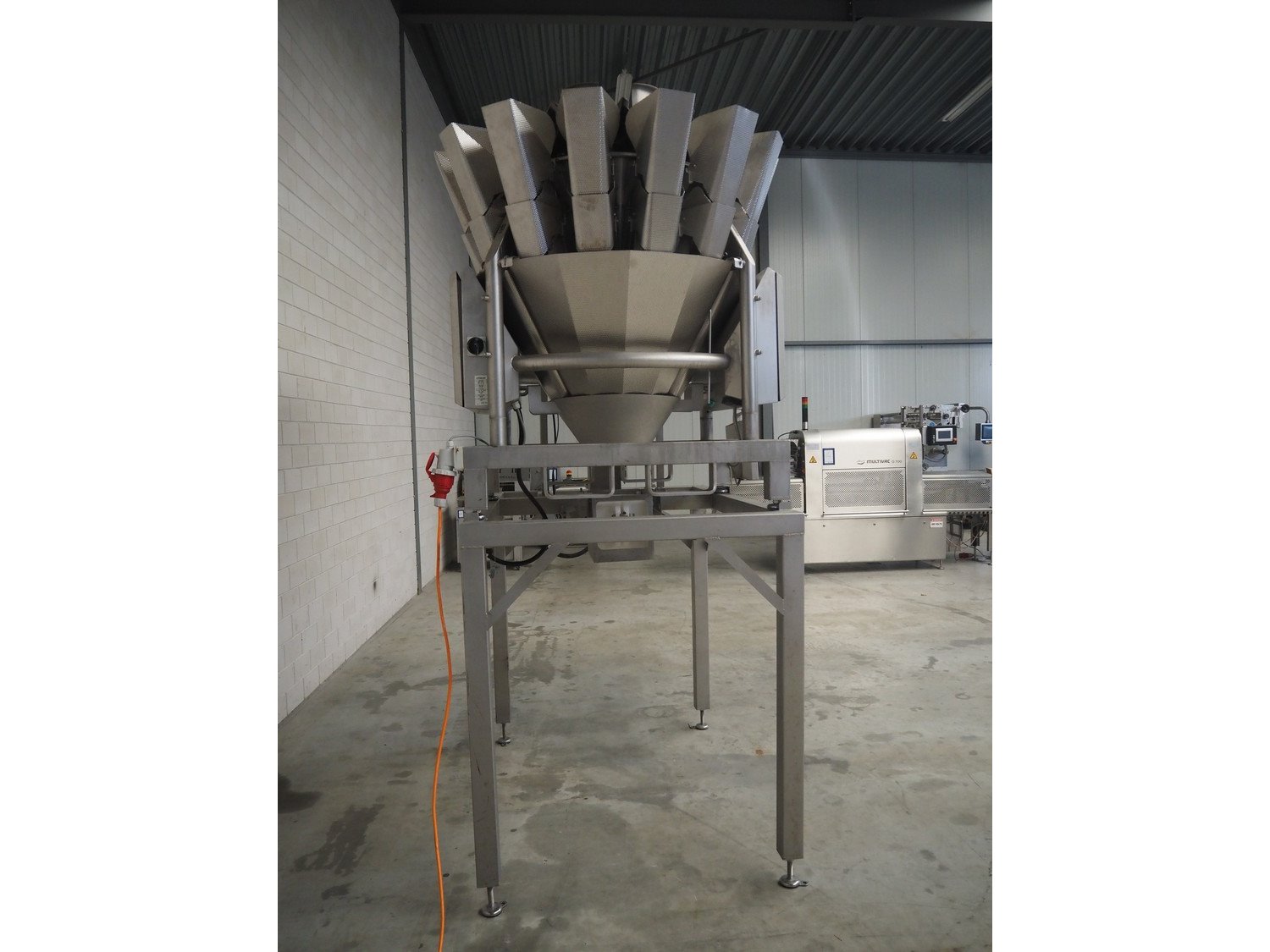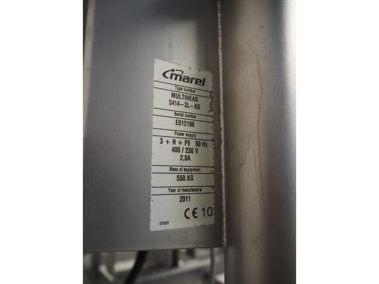 Marel 14 heads multihead weigher with vibrating gutter, type: Multihead 5414-2L-AD, serial number: E012196, year of construction: 2011, 400/230 V, 3 Ph, 50 Hz, 2.0 A, weight: 550 kg, gutter width: 400 mm, total dimensions: 1300 mm x 1700 mm x 3050 mm. Kavel locatie: Makkummerwaard 3, 8321 WV Urk, Nederland