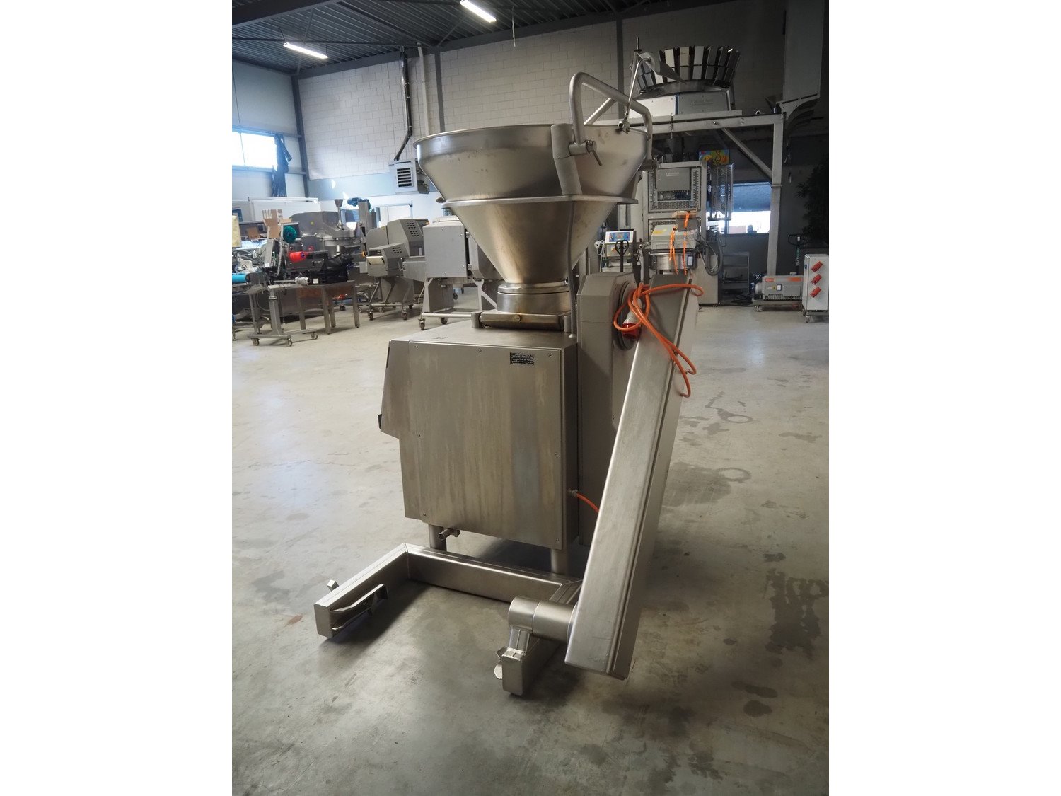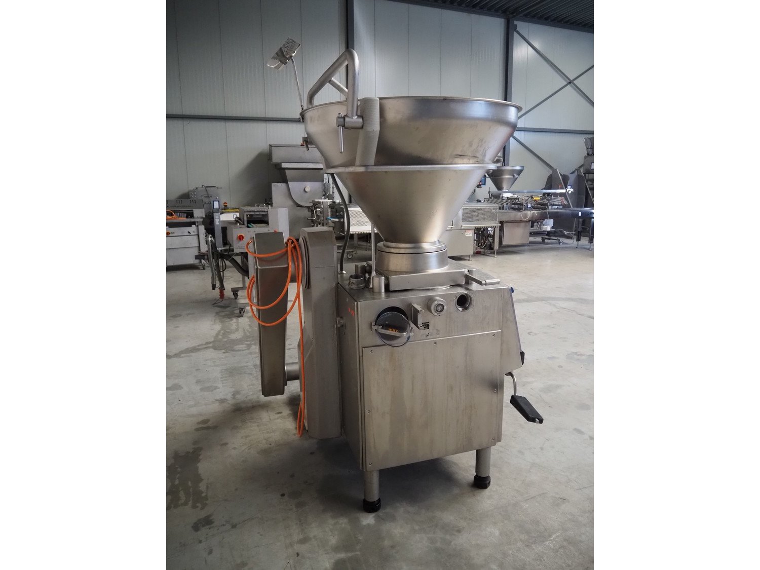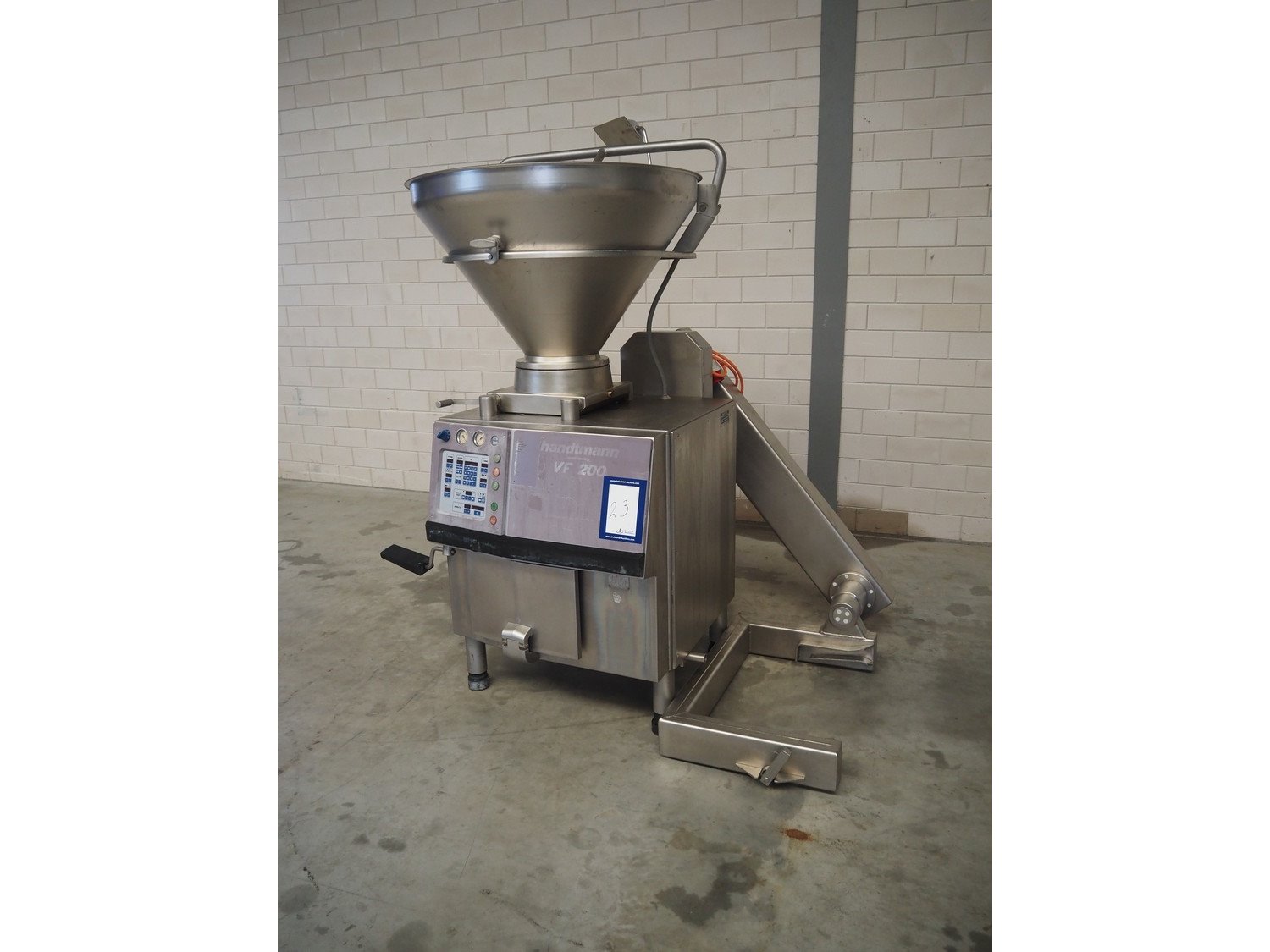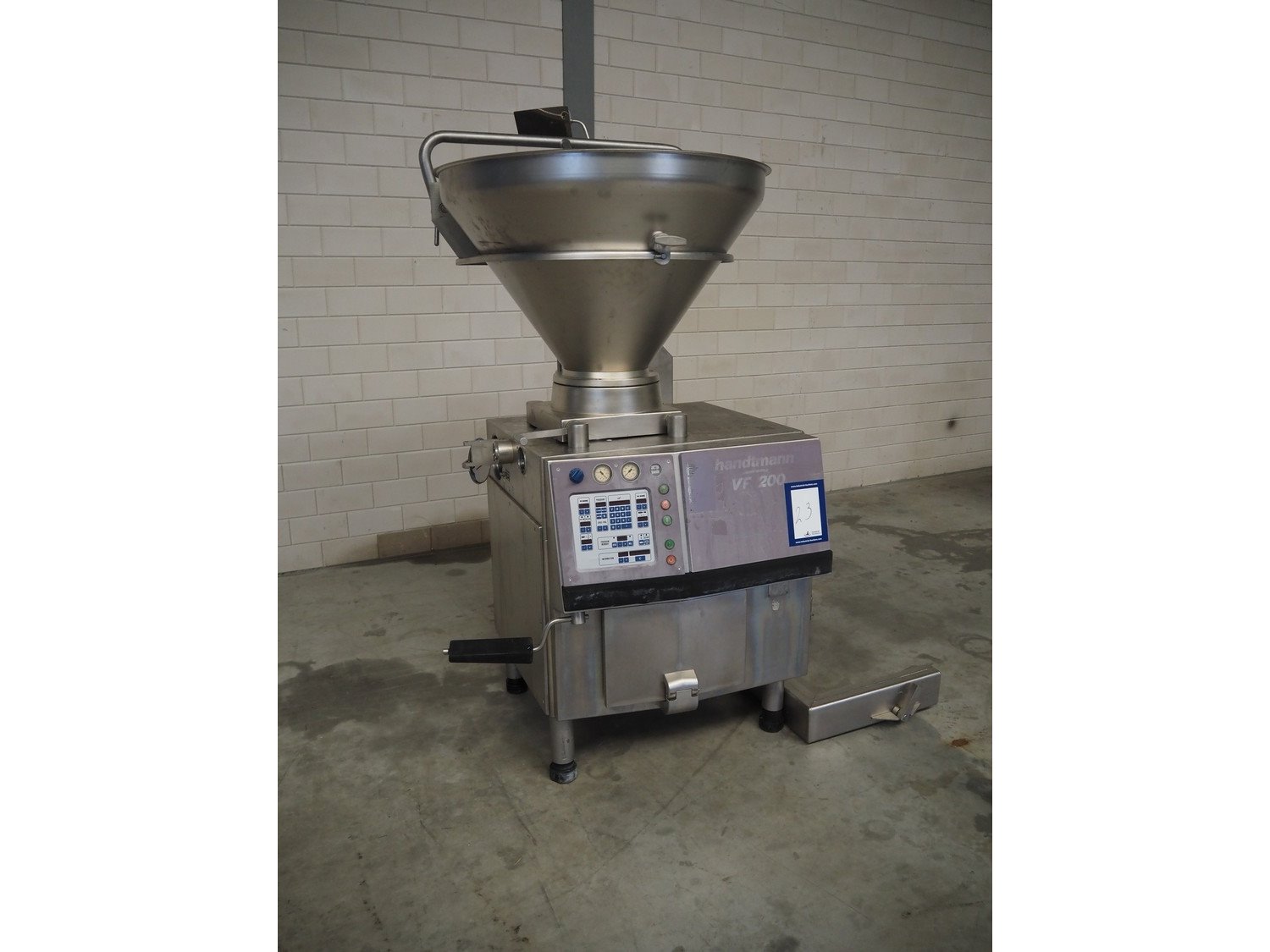 Handtmann vacuum filling machine with lifter for 200 liter meat bins, type: VF200B, number: 2697, 220 V, 50 Hz, 32.8 A, 6.5 kW, dimensions: 1850 mm x 1300 mm x 2200 mm. Kavel locatie: Makkummerwaard 3, 8321 WV Urk, Nederland