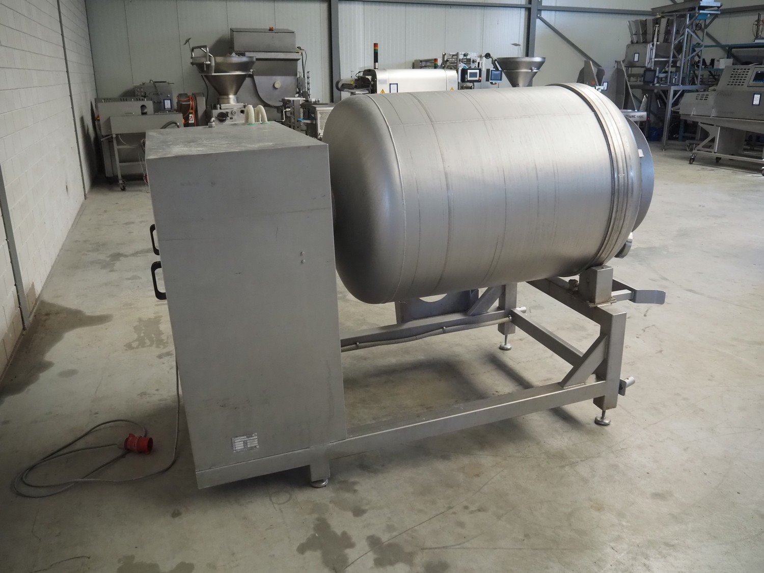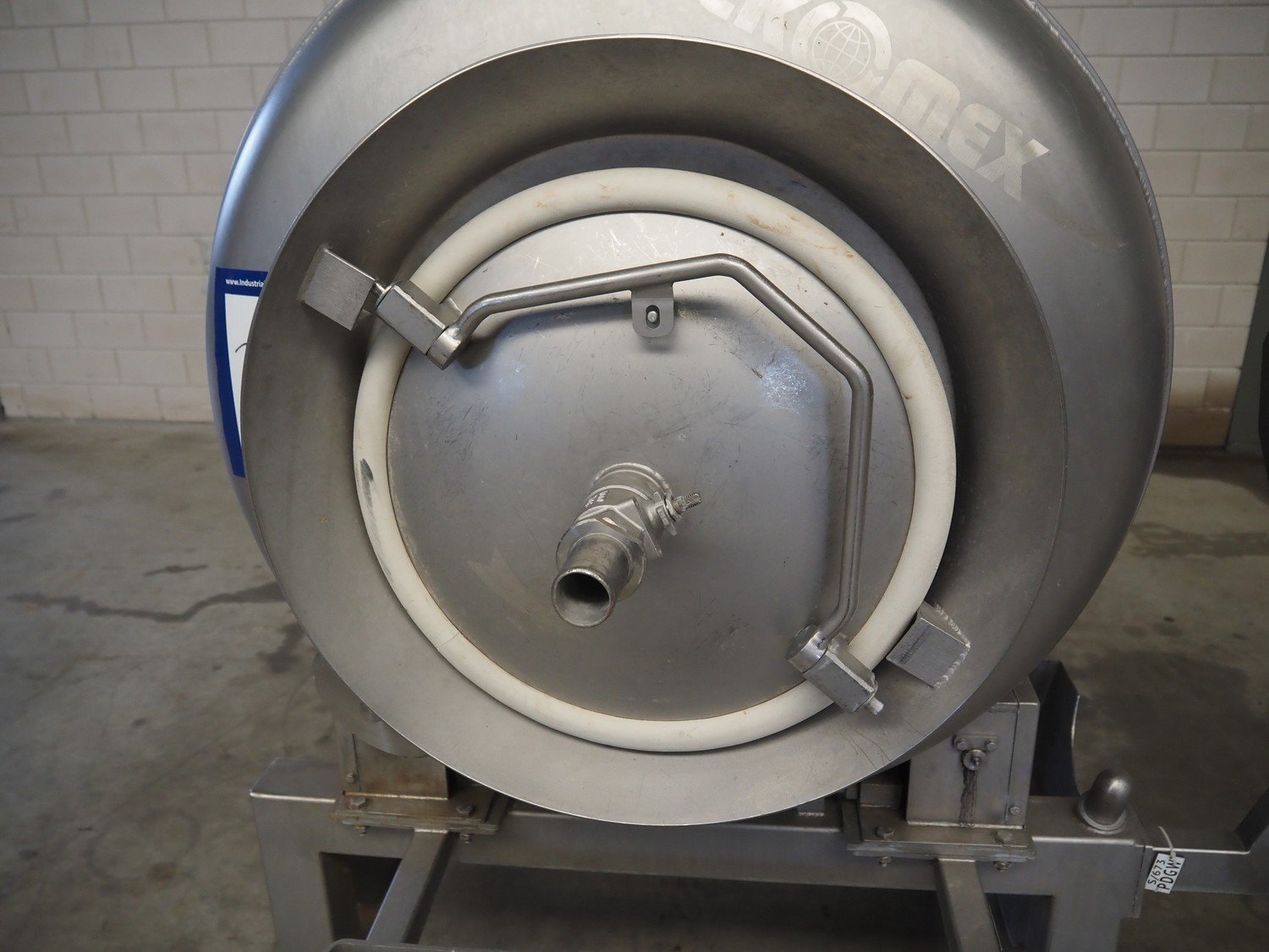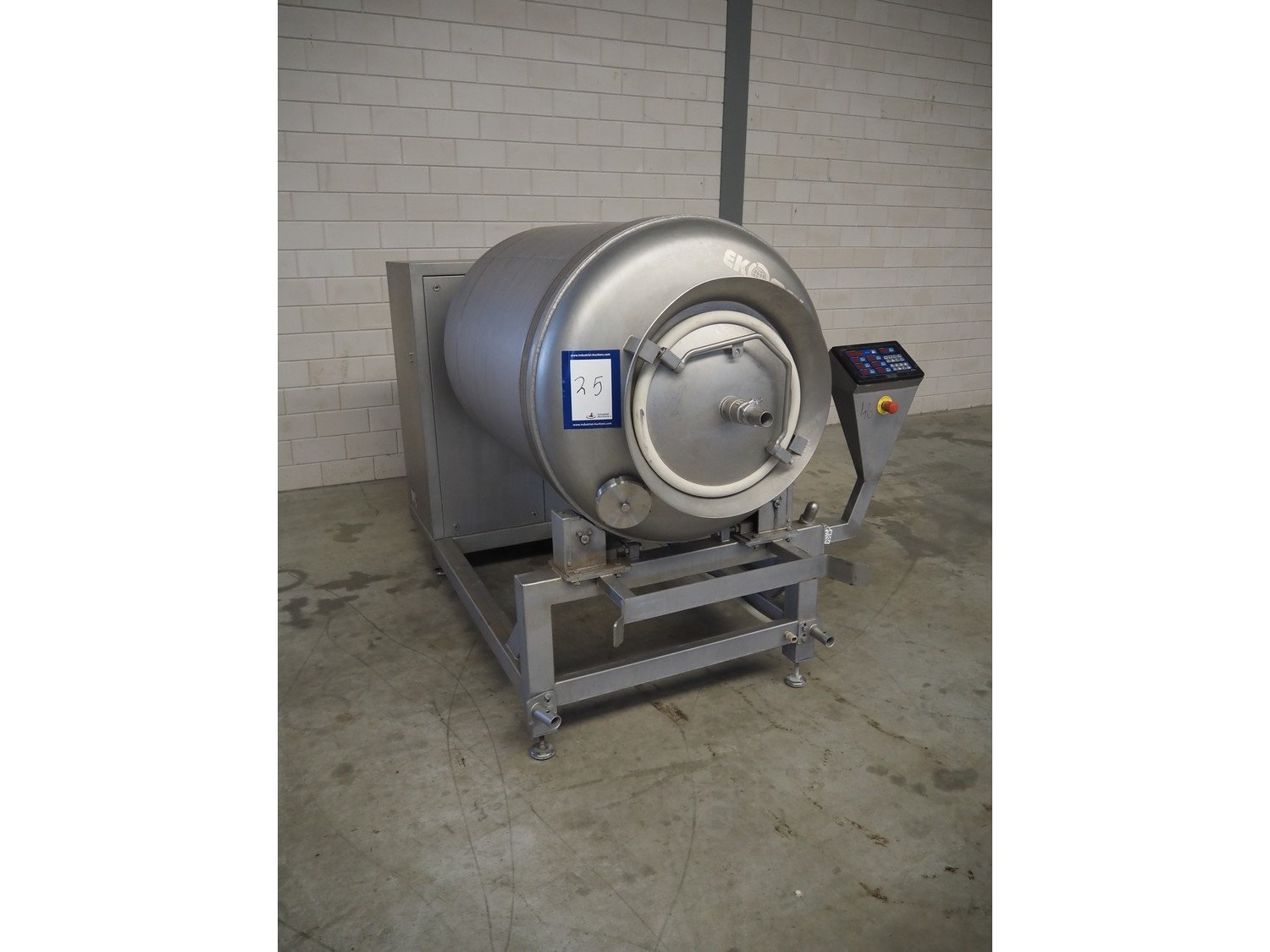 Ekomex vacuum tumbler, type: MV 800, machine number: 4311030005, year of construction: 2011, 400 V, 50 Hz, 3.5 kW, weight: 700 kg, volume: 800 liter, Busch vacuum pump, type: RA 0040 F 503, capacity: 40 m³ per hour, dimensions: 2250 mm x 1400 mm x 1600 mm. Kavel locatie: Makkummerwaard 3, 8321 WV Urk, Nederland