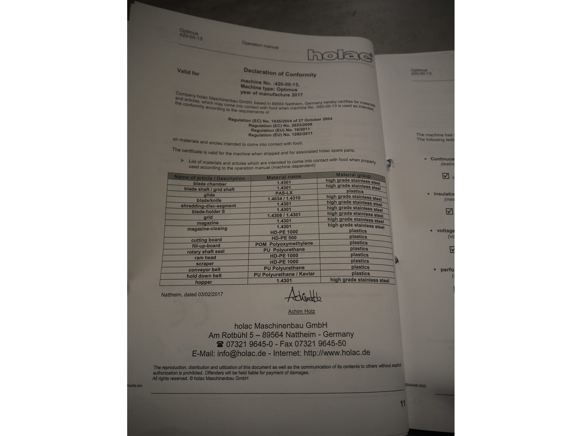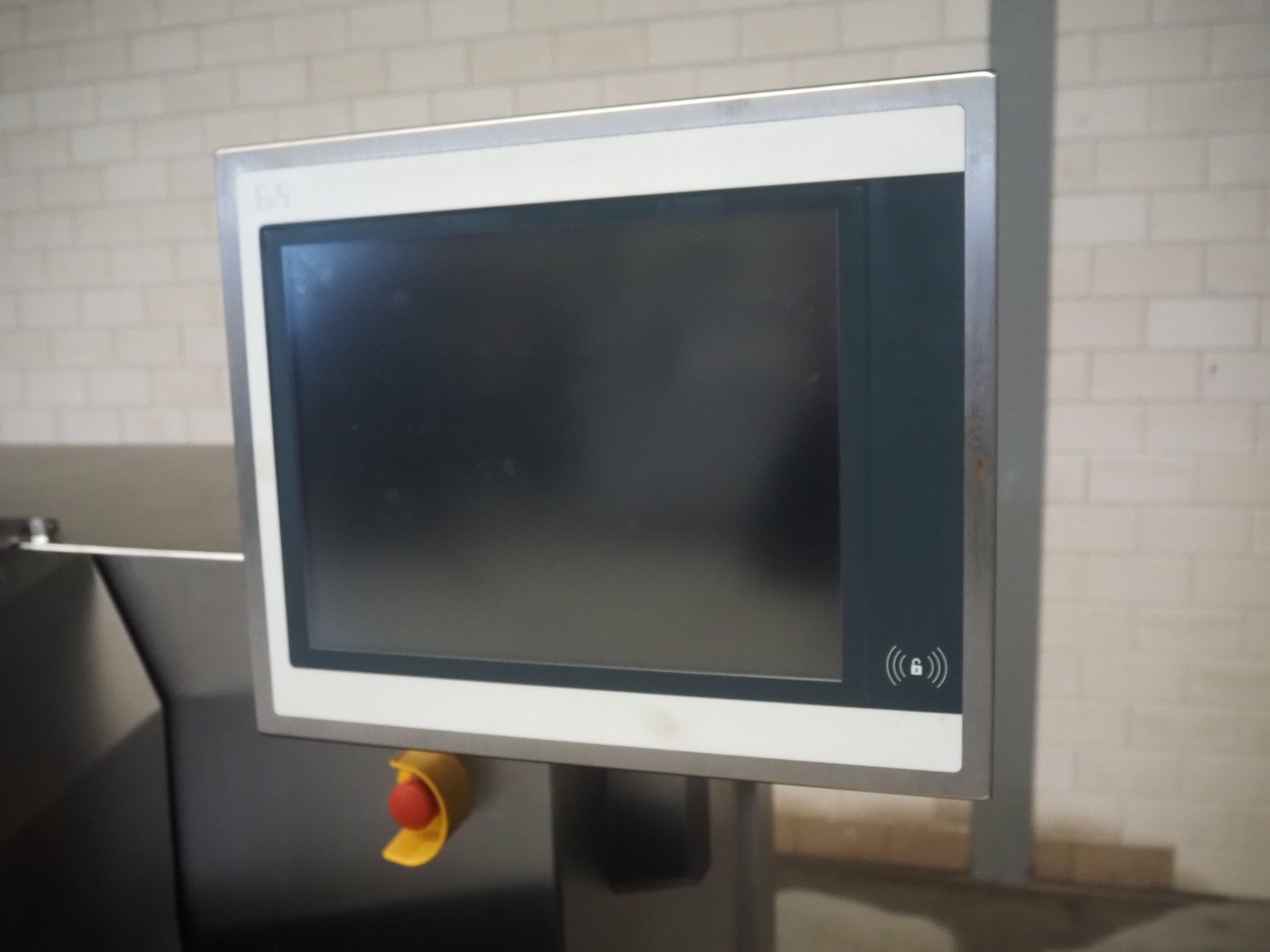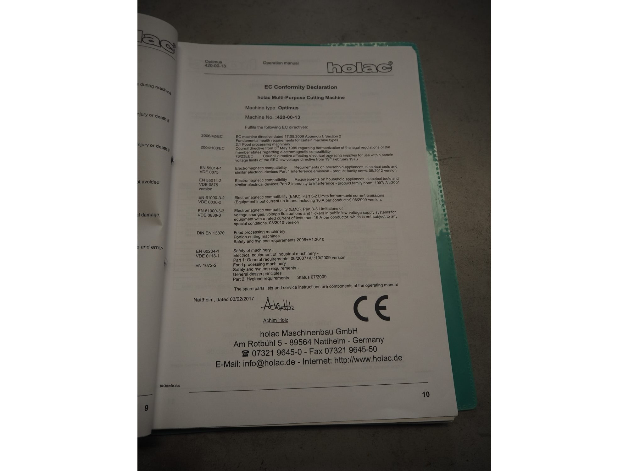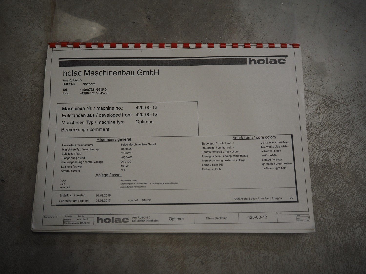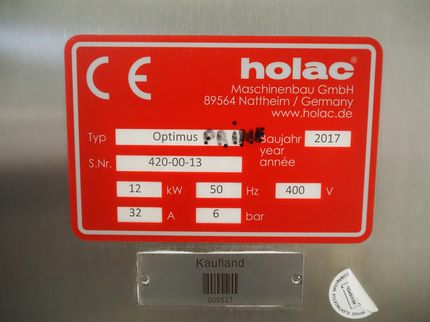 Holac Maschinenbau GmbH slicer, type: Optimus, serial number: 420-00-13, year of construction: 2017, 400 V, 50 Hz, 32 A, 12 kW, 6 bar, plastic belts, belt width: 270 mm and 300 mm, total dimensions: 4900 mm x 1500 mm x 1700 mm. Kavel locatie: Makkummerwaard 3, 8321 WV Urk, Nederland