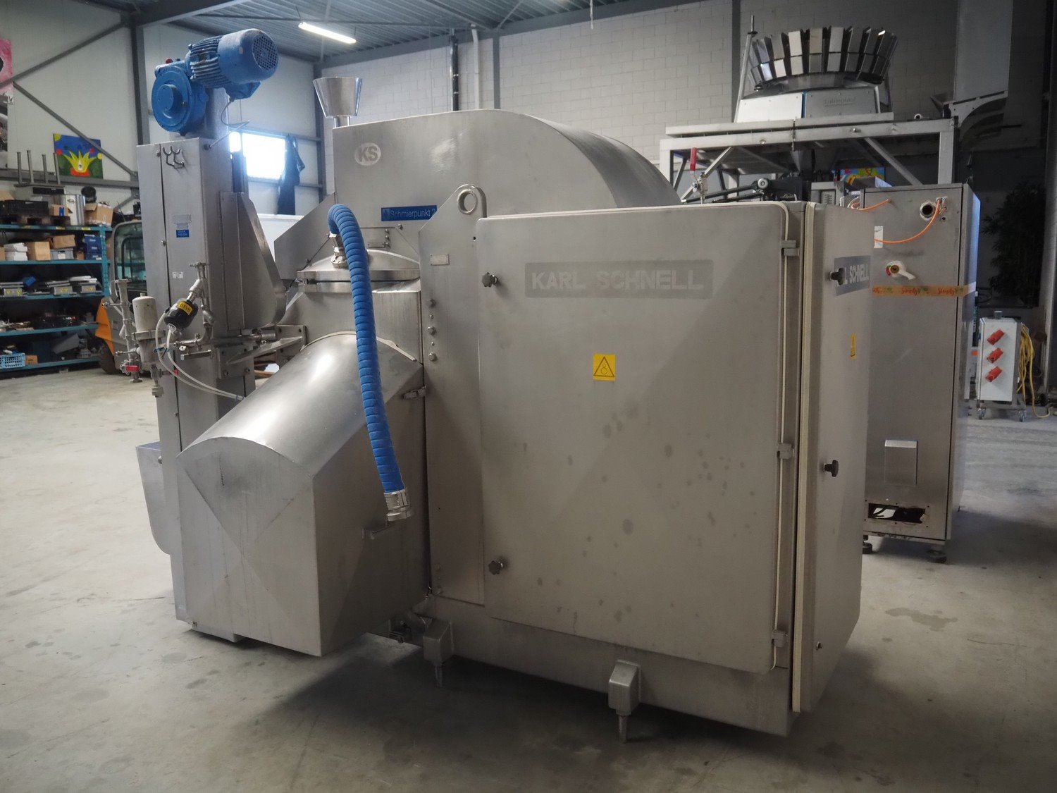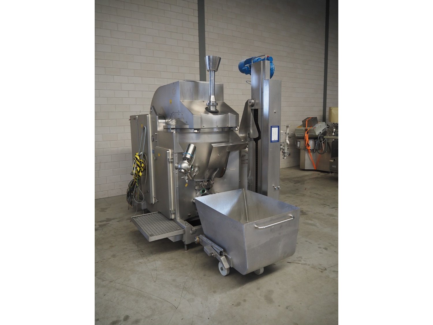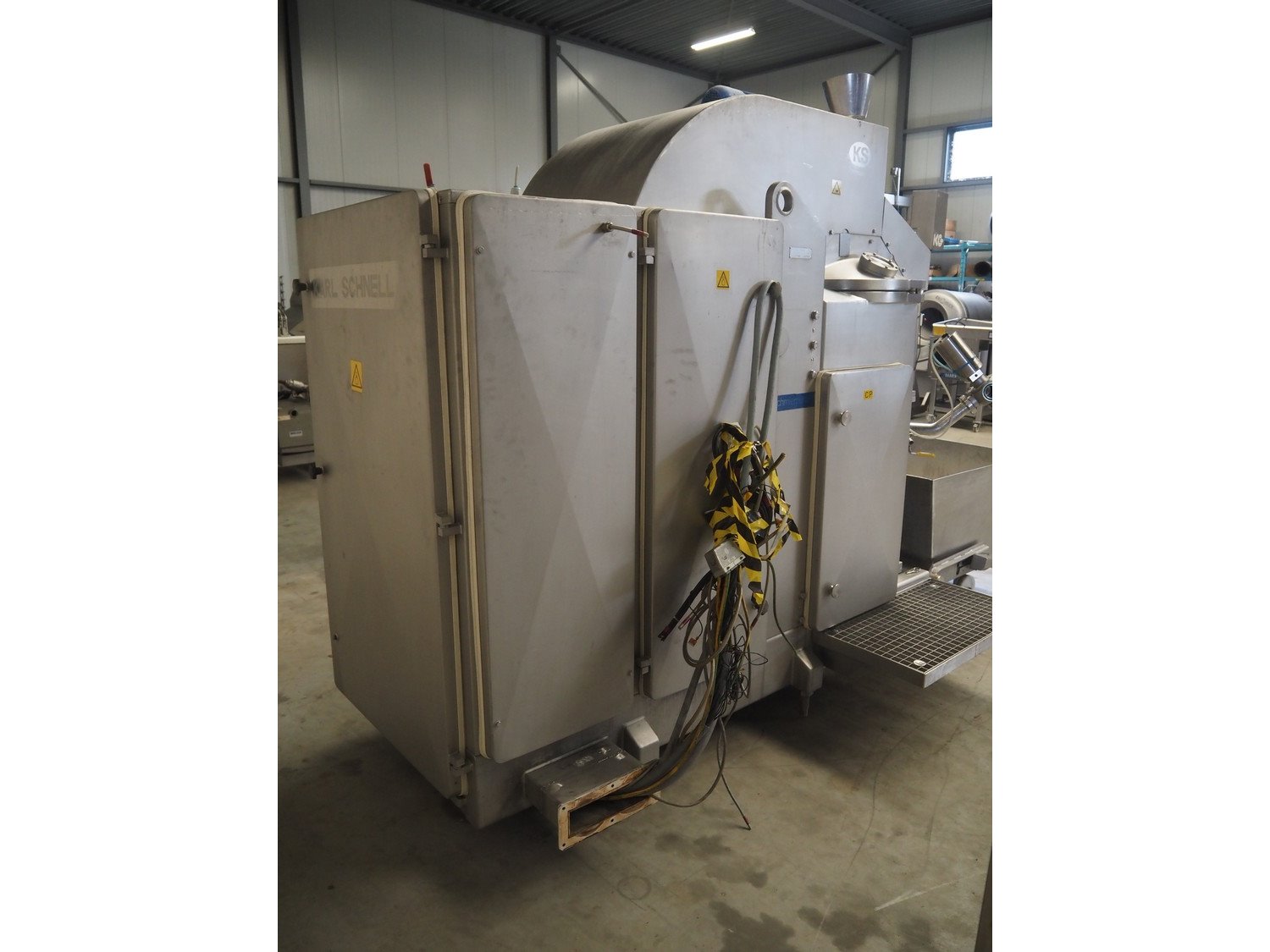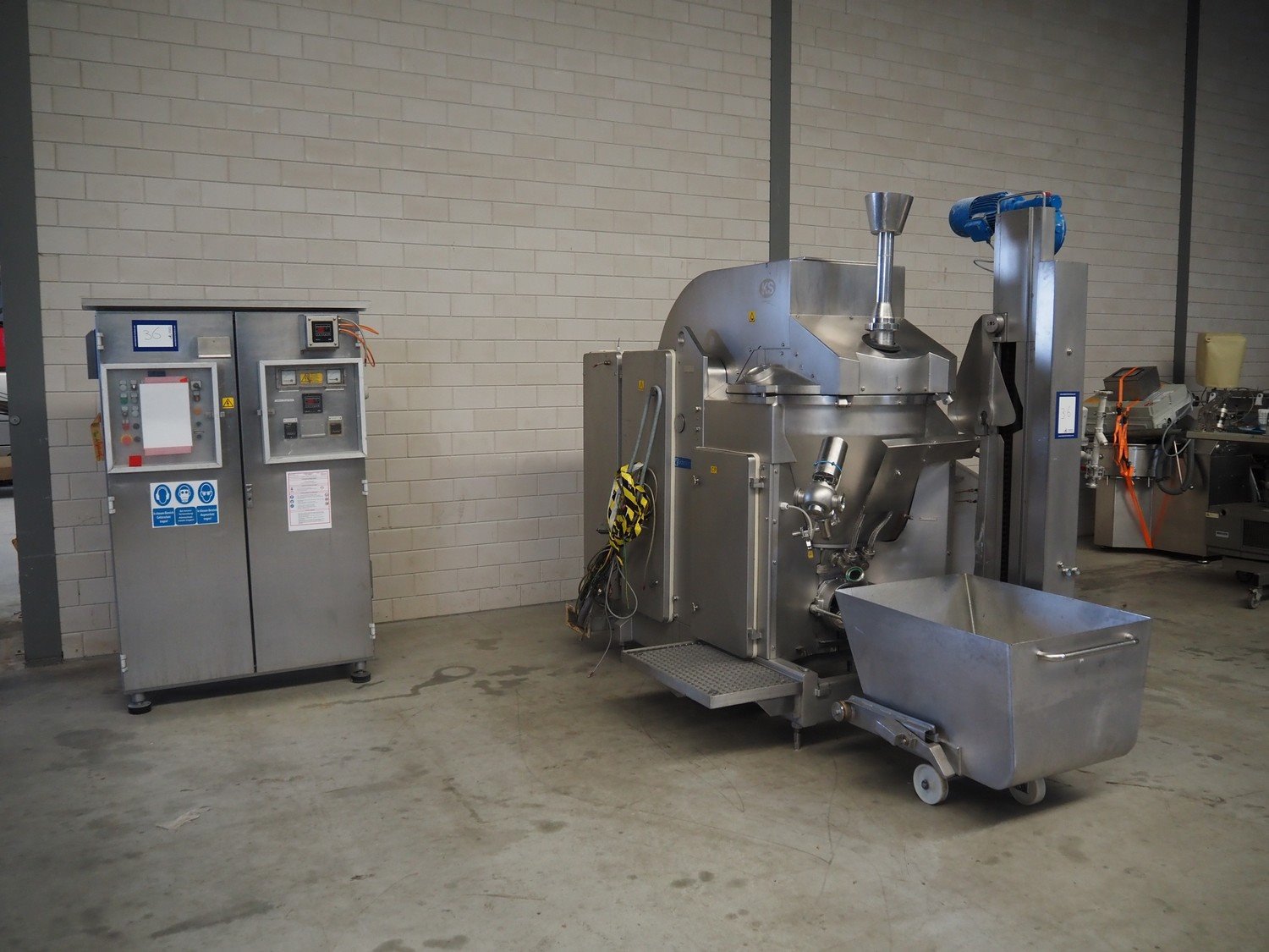 Karl Schnell emulsifier with lifter for 200 liter meat bins, model: FD3K, machine number: 31350, year of construction: 1992, 380 V, 3 Ph, 50 Hz, 84/125 A, 38.5 kW, weight: 3000 kg, batch capacity: 310 liter, total dimensions: 2250 mm x 1800 mm x 2100 mm. Dimensions switch cabinet: 1200 mm x 500 mm x 2100 mm. Including pallet with parts, dimensions: 1200 mm x 800 mm x 400 mm. Kavel locatie: Makkummerwaard 3, 8321 WV Urk, Nederland