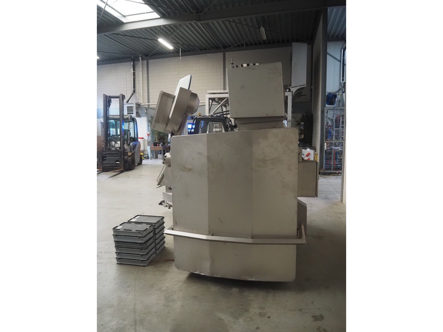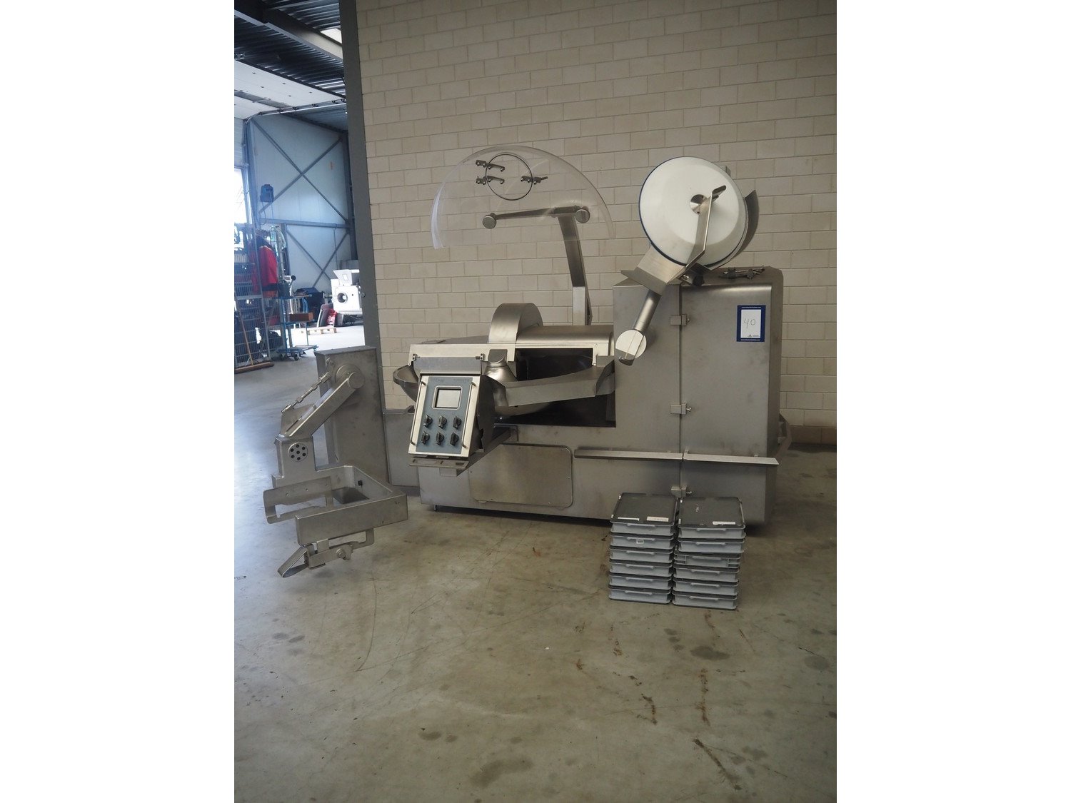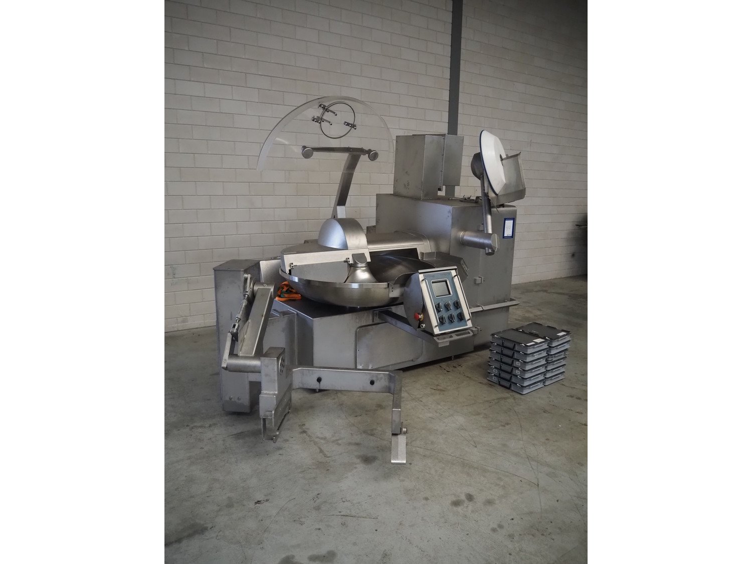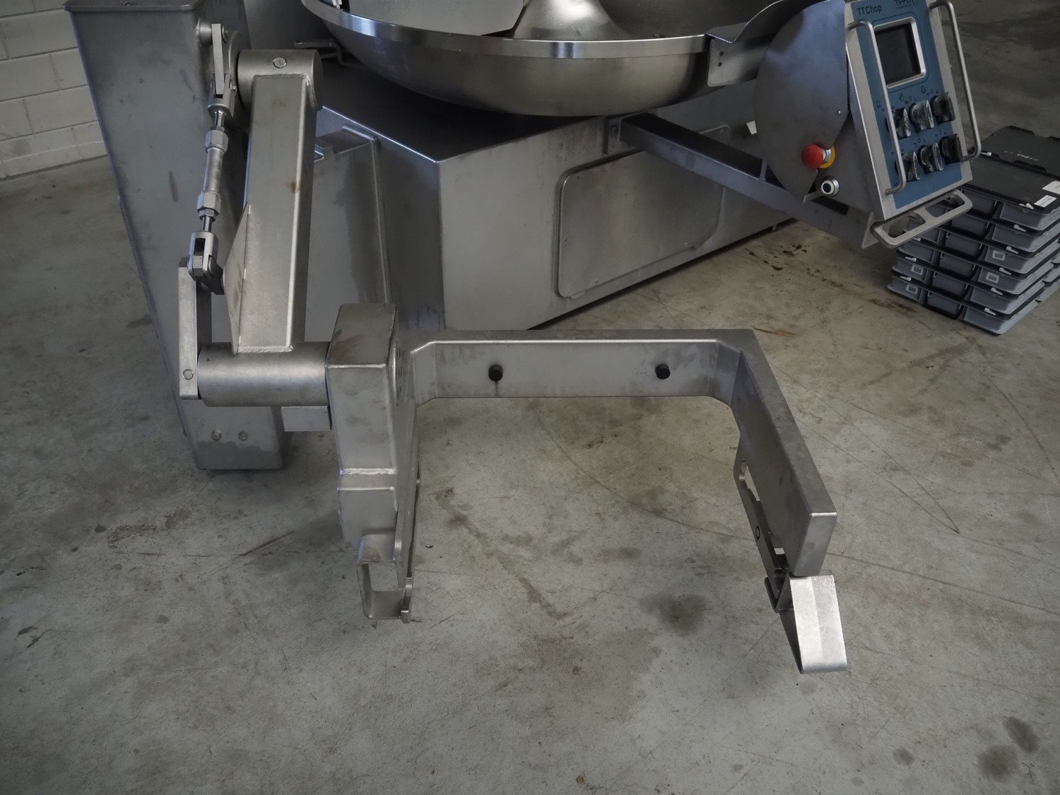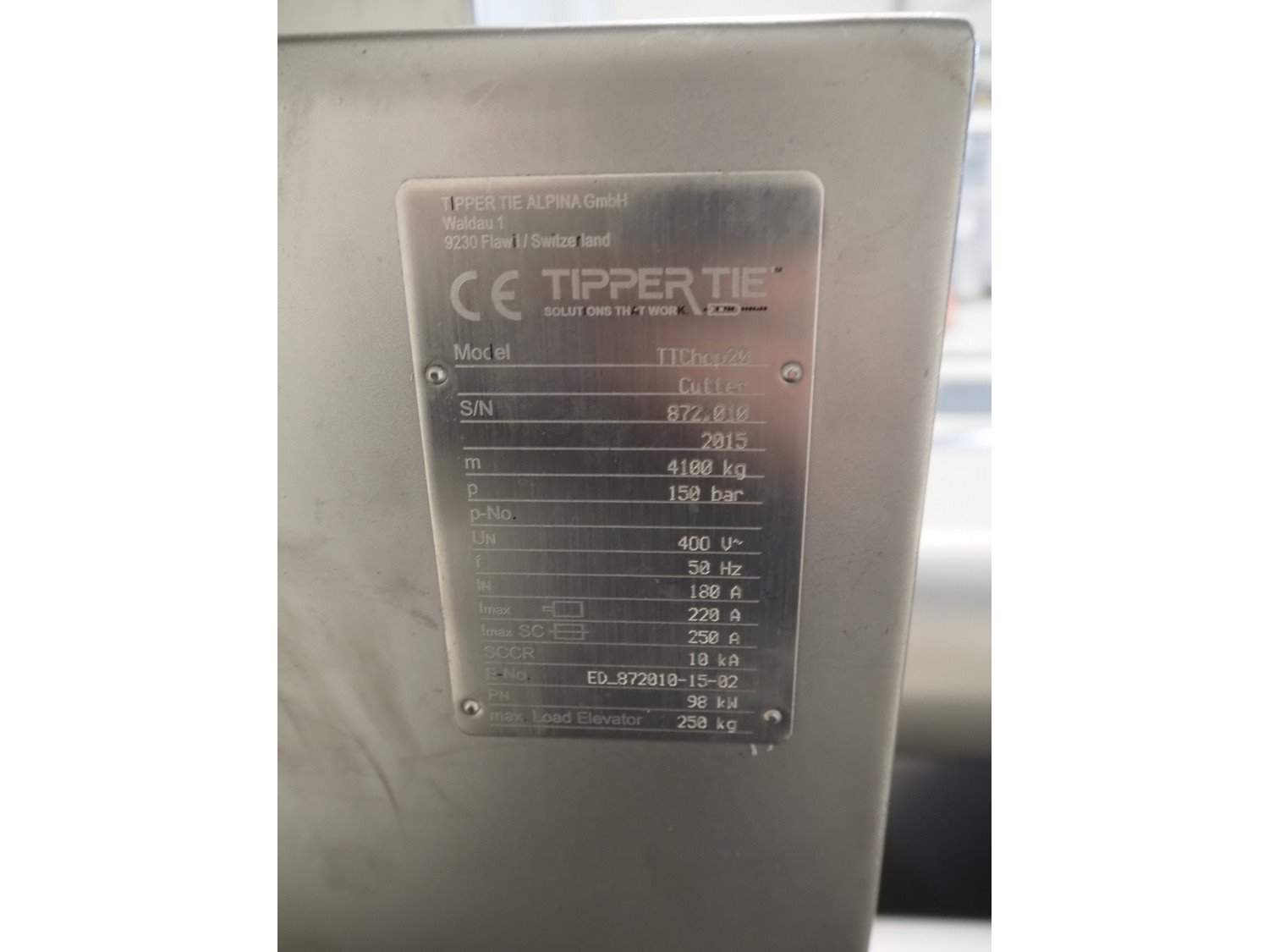 Tipper Tie Alpina GmbH cutter with lifter for 200 liter meat bins and ejector, model: TTChop20, serial number: 872.010, year of construction: 2015, 400 V, 3 Ph, 50 Hz, 180/220/250, 98 kW, weight: 4100 kg, s/s bowl, volume: 200 liter, dimensions: 3250 mm x 2600 mm x 2200 mm. Including 12 extra knife sets. Kavel locatie: Makkummerwaard 3, 8321 WV Urk, Nederland