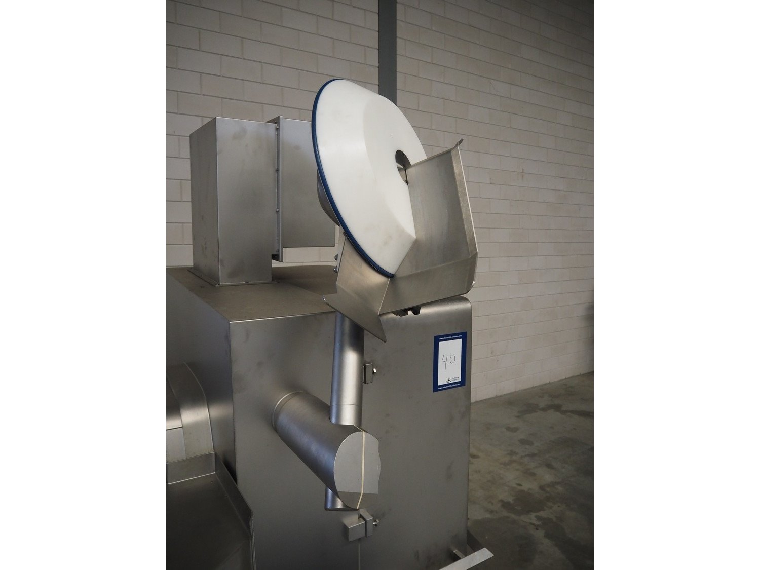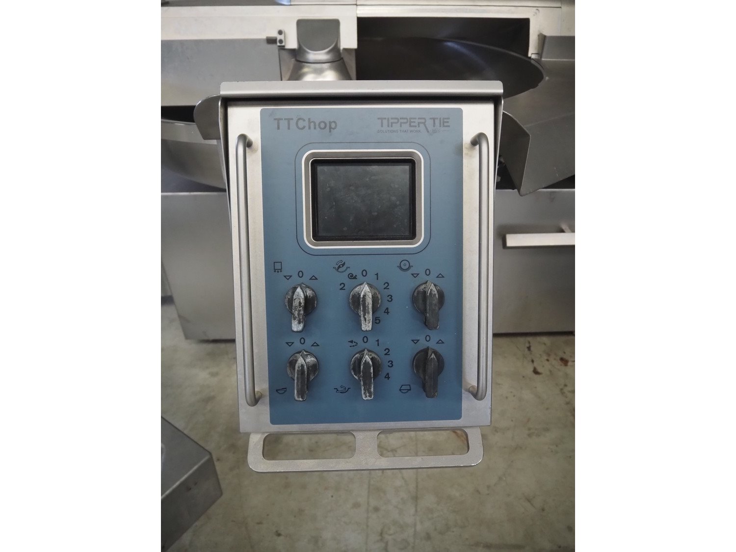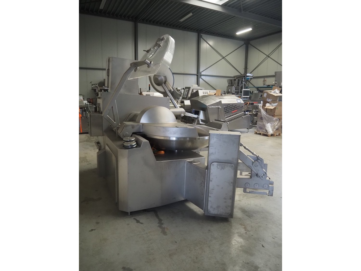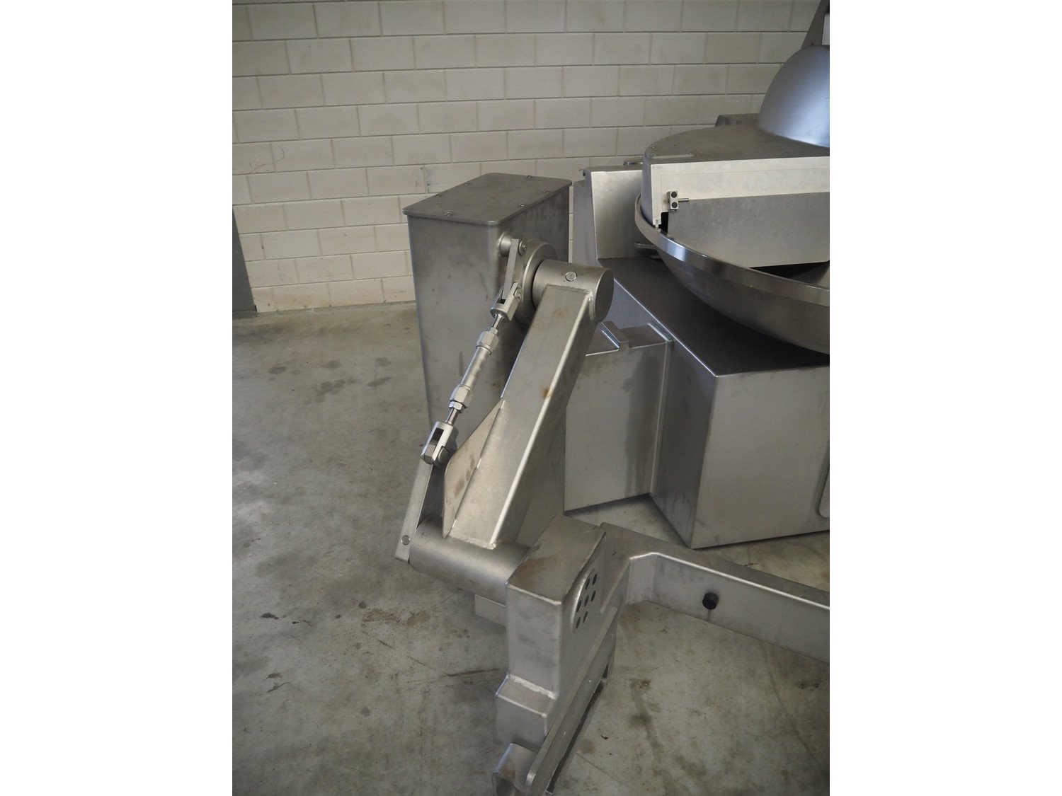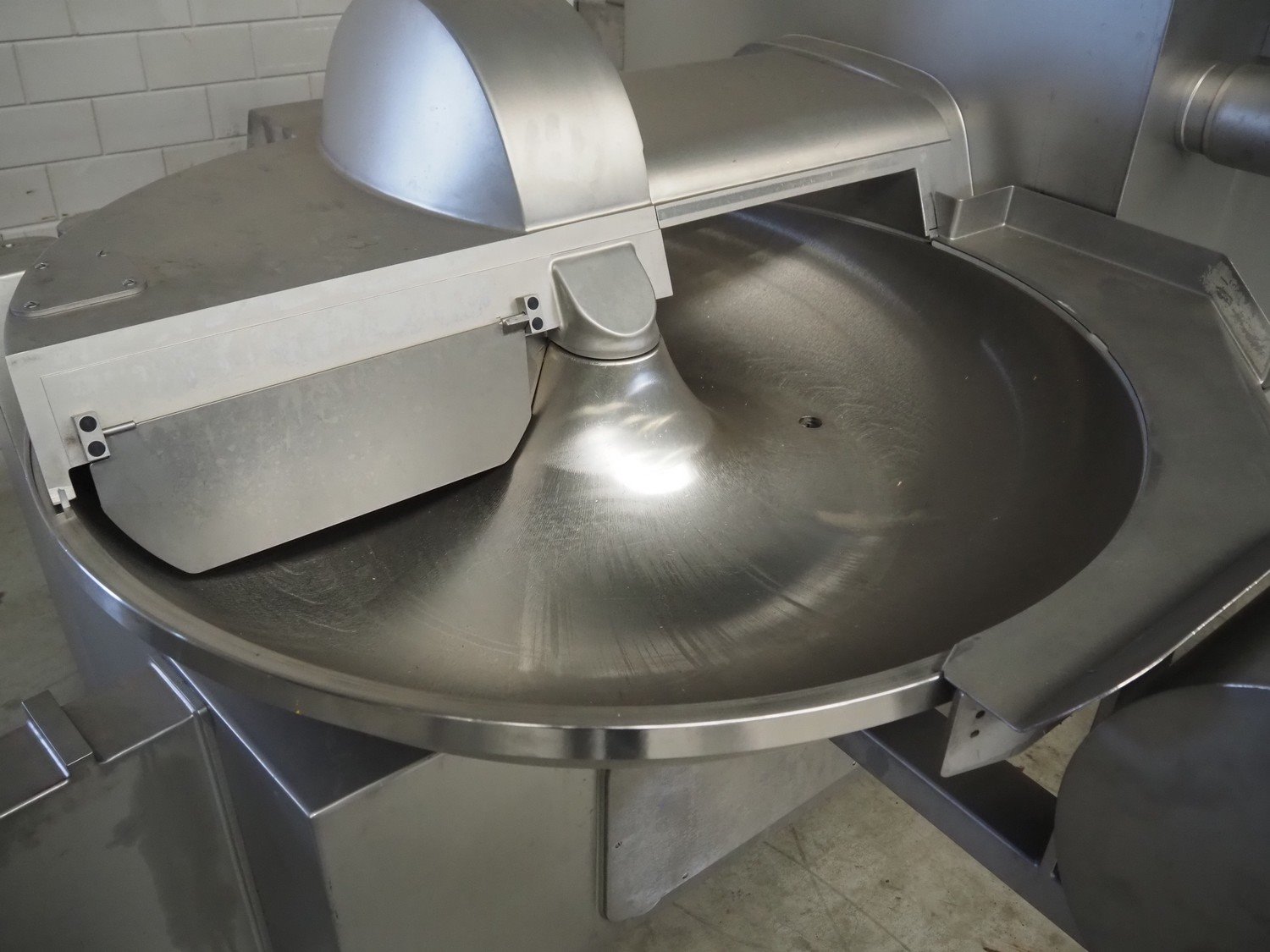 Tipper Tie Alpina GmbH cutter with lifter for 200 liter meat bins and ejector, model: TTChop20, serial number: 872.010, year of construction: 2015, 400 V, 3 Ph, 50 Hz, 180/220/250, 98 kW, weight: 4100 kg, s/s bowl, volume: 200 liter, dimensions: 3250 mm x 2600 mm x 2200 mm. Including 12 extra knife sets. Kavel locatie: Makkummerwaard 3, 8321 WV Urk, Nederland