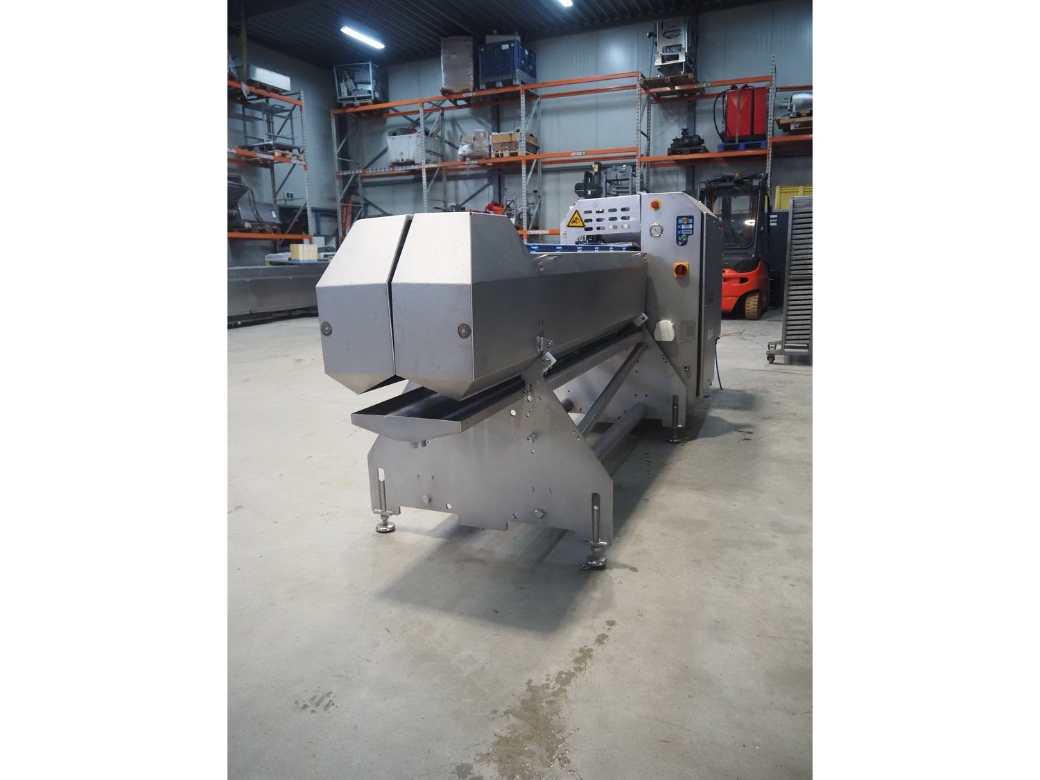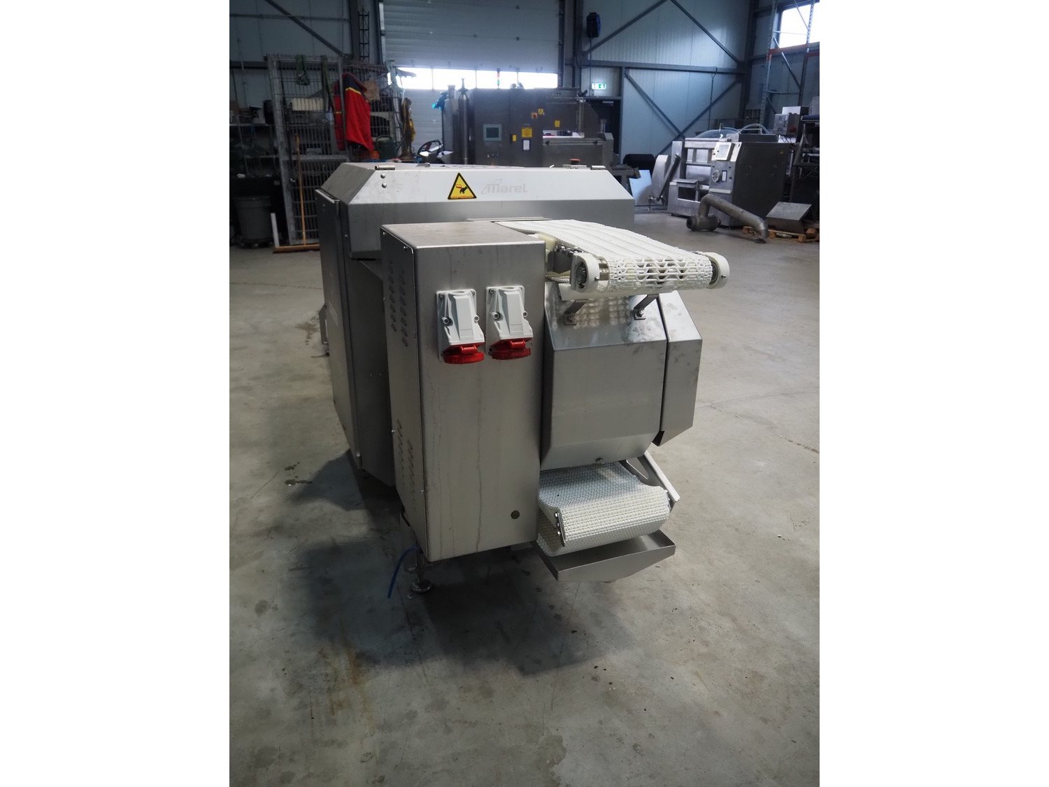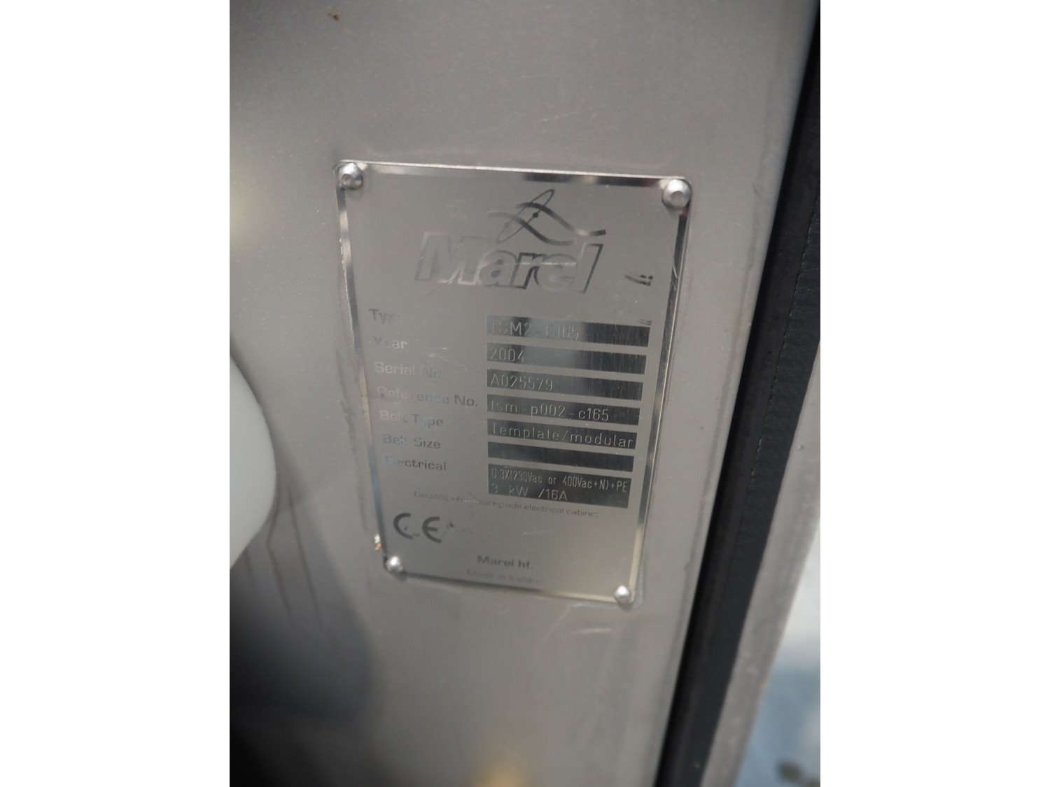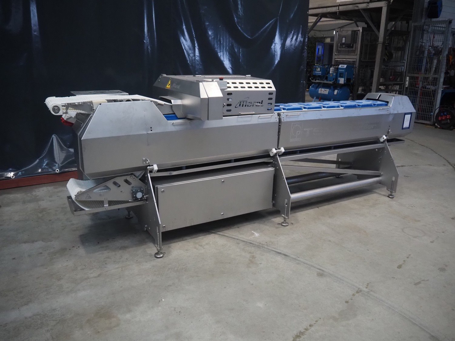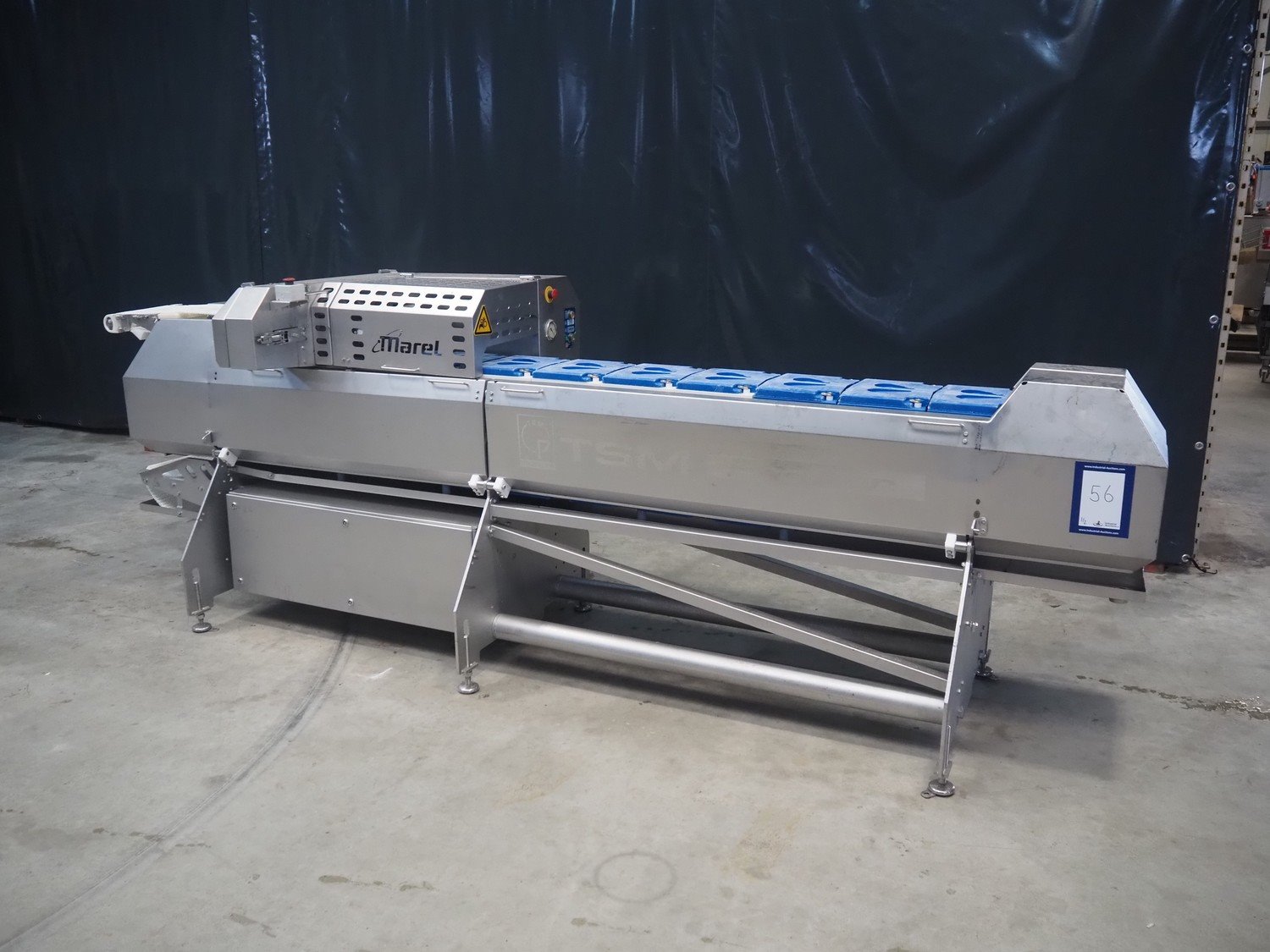 Marel template slicer, type: TSM2 C165, serial number: A025579, year of construction: 2004, 230/400 V, 3 Ph, 16 A, 3 kW, plastic mesh belts, belt width: 250 mm, Busch vacuum pump, type: LC 0060 A, capacity: 55 m³ per hour, total dimensions: 3900 mm x 920 mm x 1340 mm. Including trolley with extra plates, dimensions: 740 mm x 530 mm x 1500 mm. Kavel locatie: Makkummerwaard 3, 8321 WV Urk, Nederland