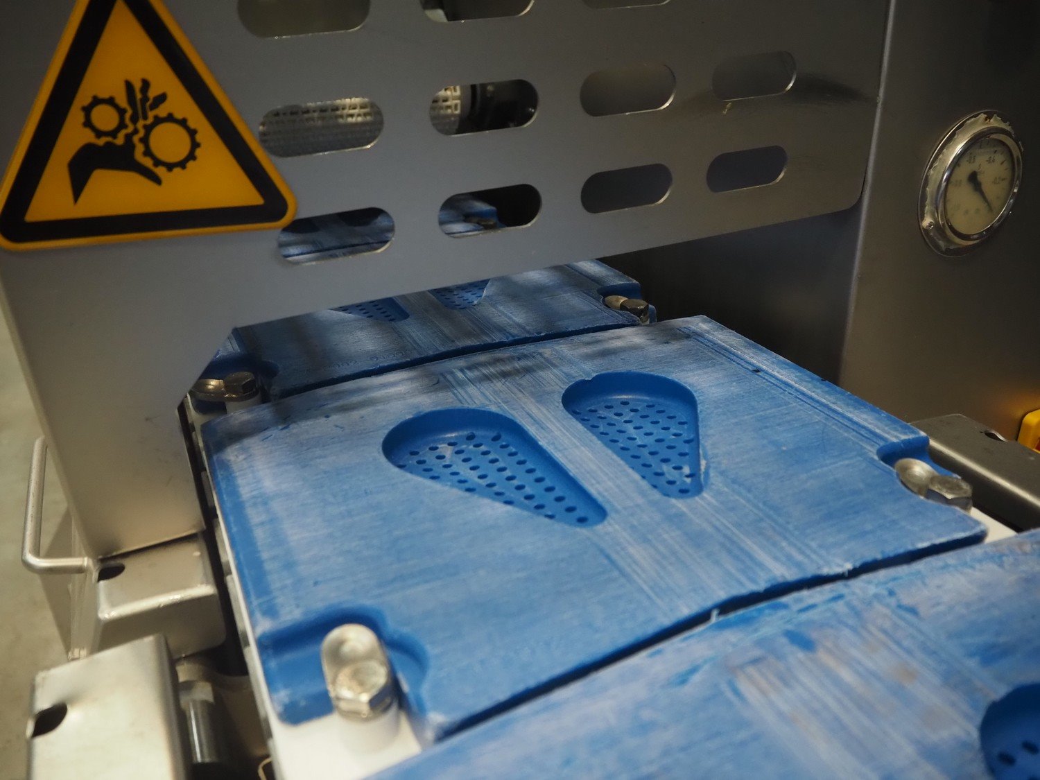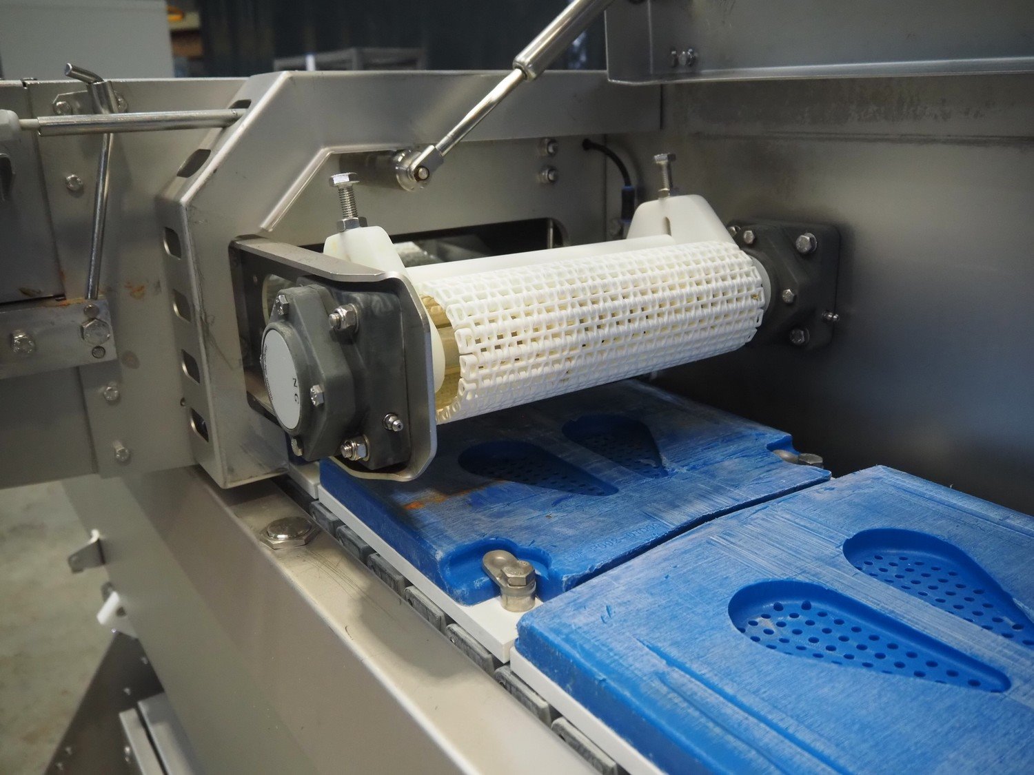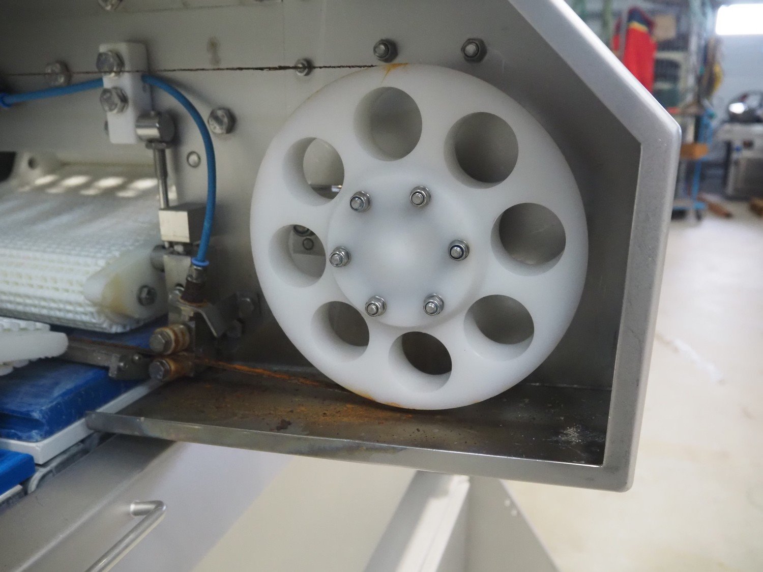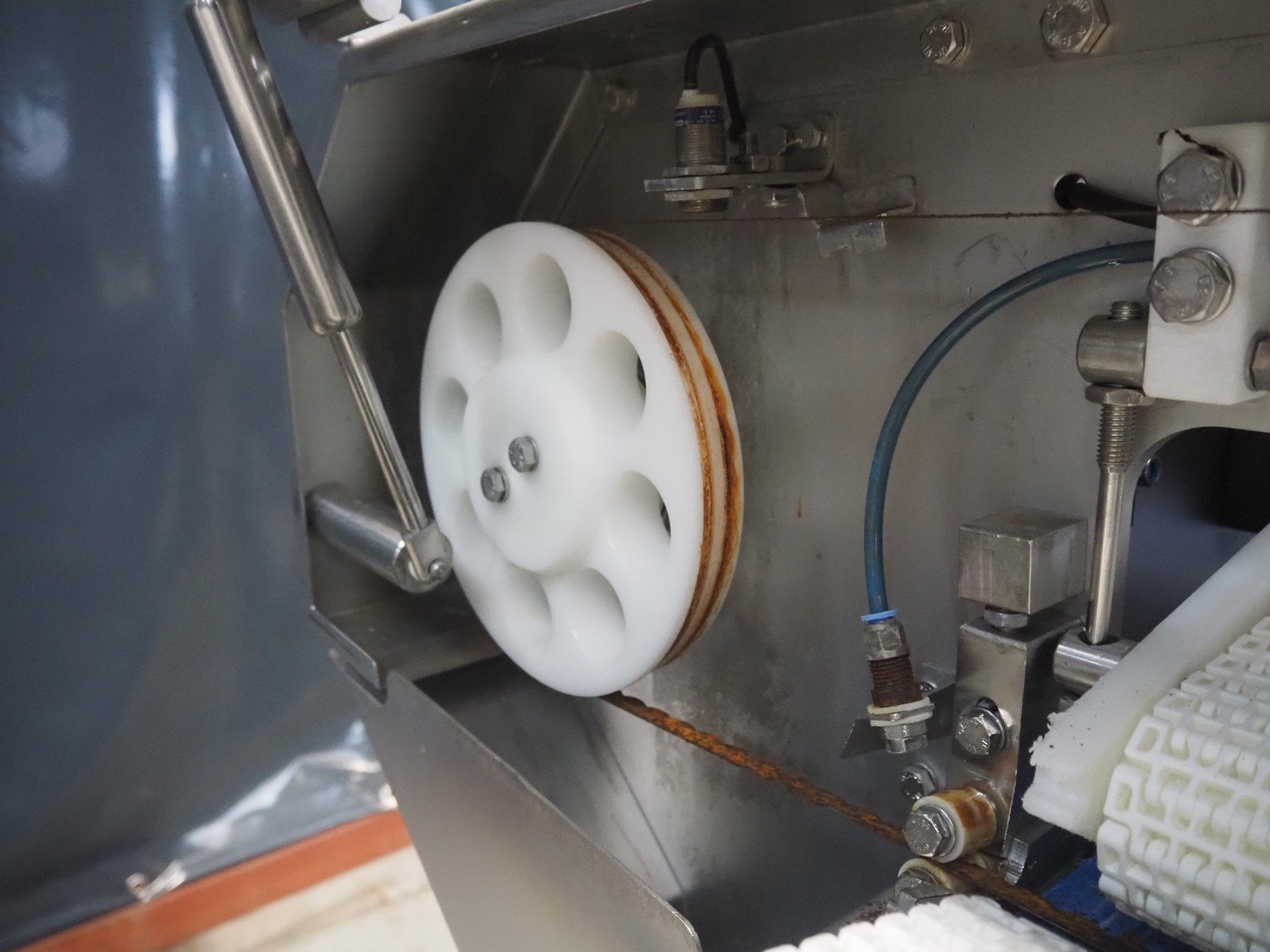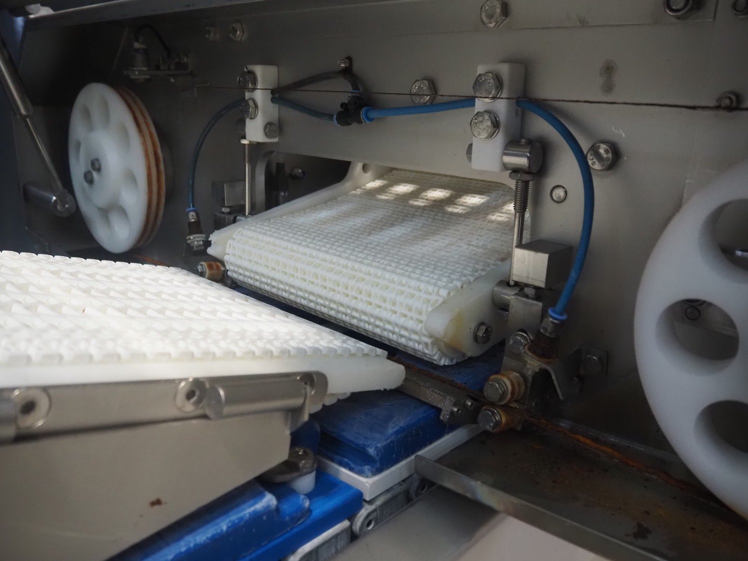 Marel template slicer, type: TSM2 C165, serial number: A025579, year of construction: 2004, 230/400 V, 3 Ph, 16 A, 3 kW, plastic mesh belts, belt width: 250 mm, Busch vacuum pump, type: LC 0060 A, capacity: 55 m³ per hour, total dimensions: 3900 mm x 920 mm x 1340 mm. Including trolley with extra plates, dimensions: 740 mm x 530 mm x 1500 mm. Kavel locatie: Makkummerwaard 3, 8321 WV Urk, Nederland