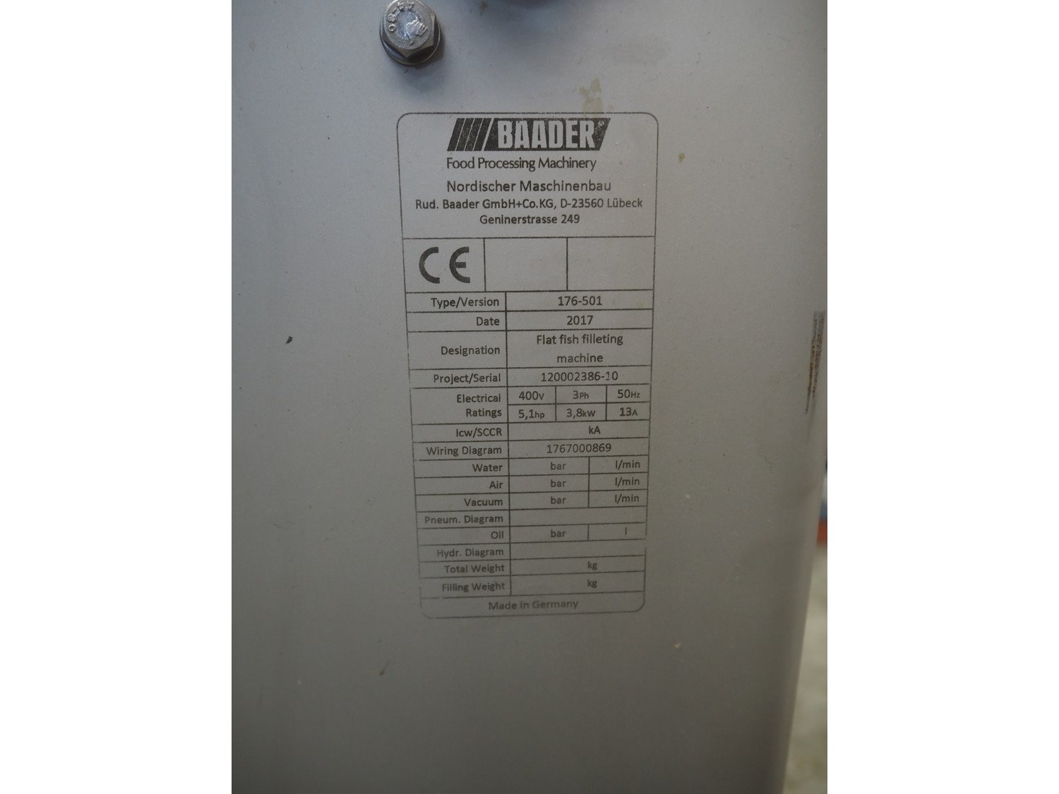 Baader flat fish filleting machine, type: 176-501, serial number: 120002386-10, year of construction: 2017, 400 V, 3 Ph, 50 Hz, 13 A, 3,8 kW, dimensions: 2350 mm x 2100 mm x 1900 mm. Kavel locatie: Makkummerwaard 3, 8321 WV Urk, Nederland