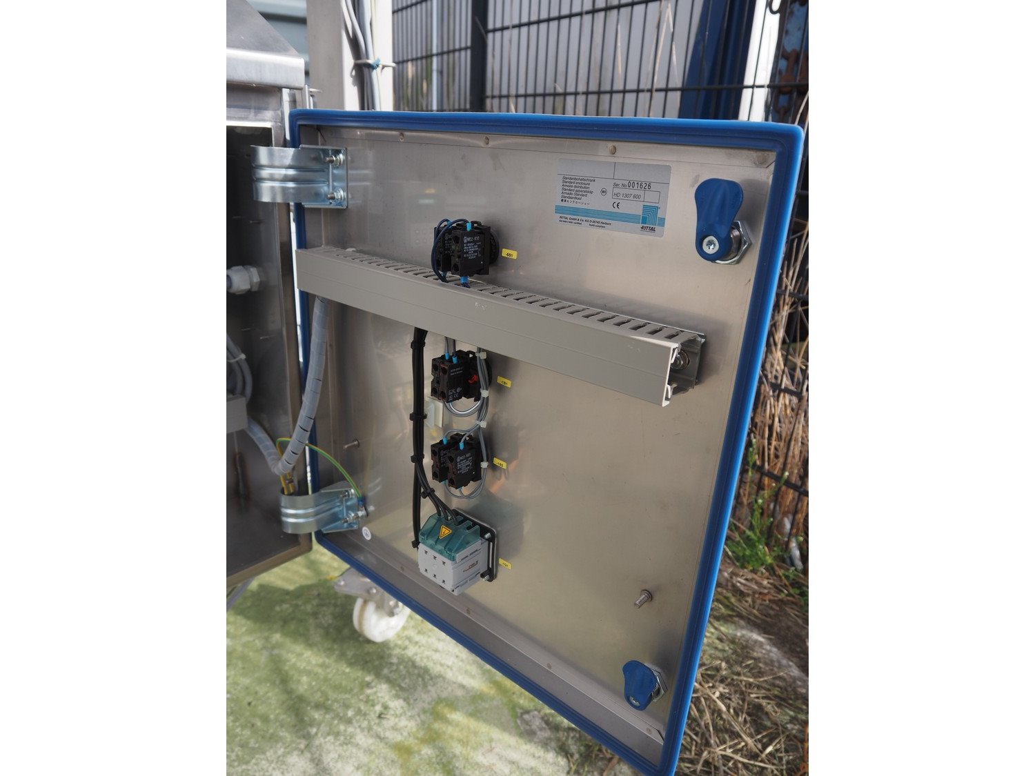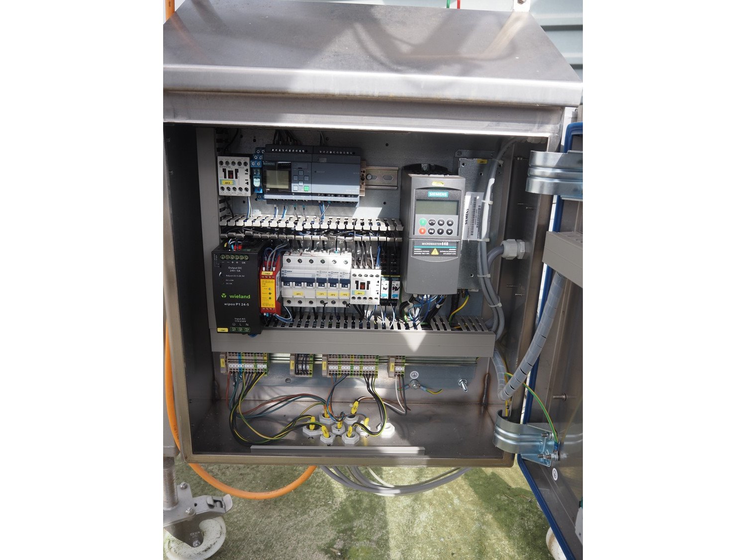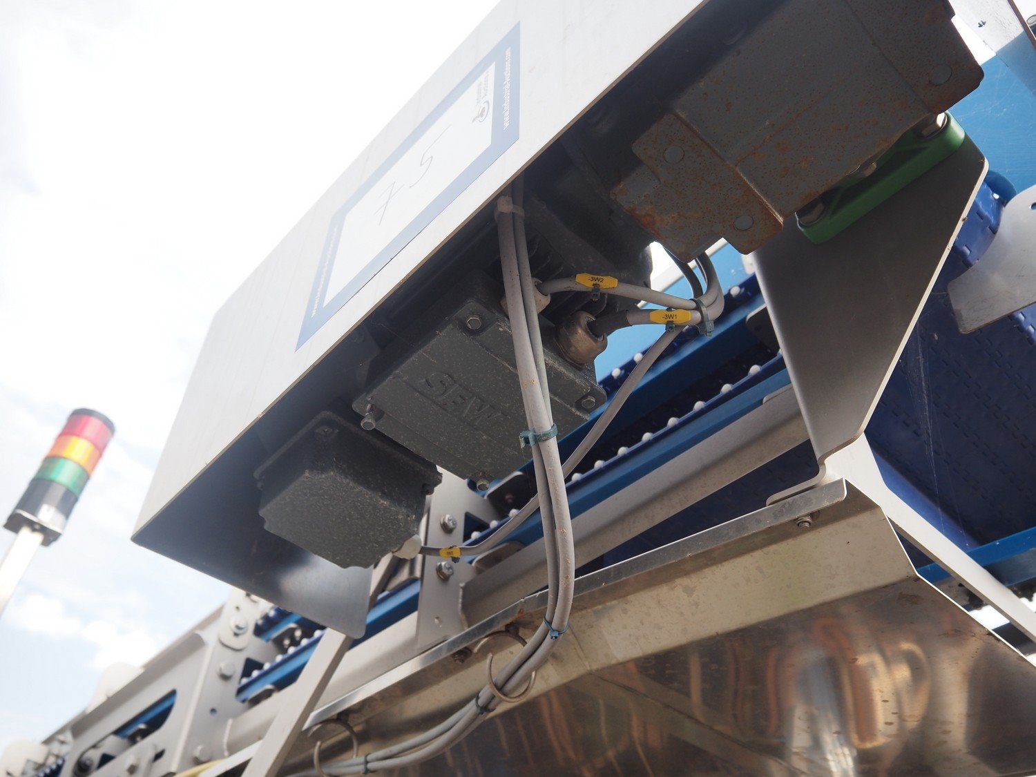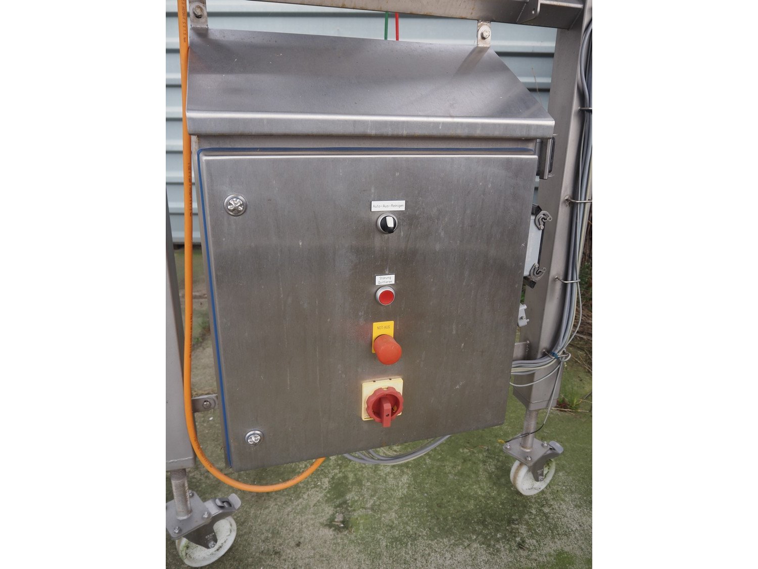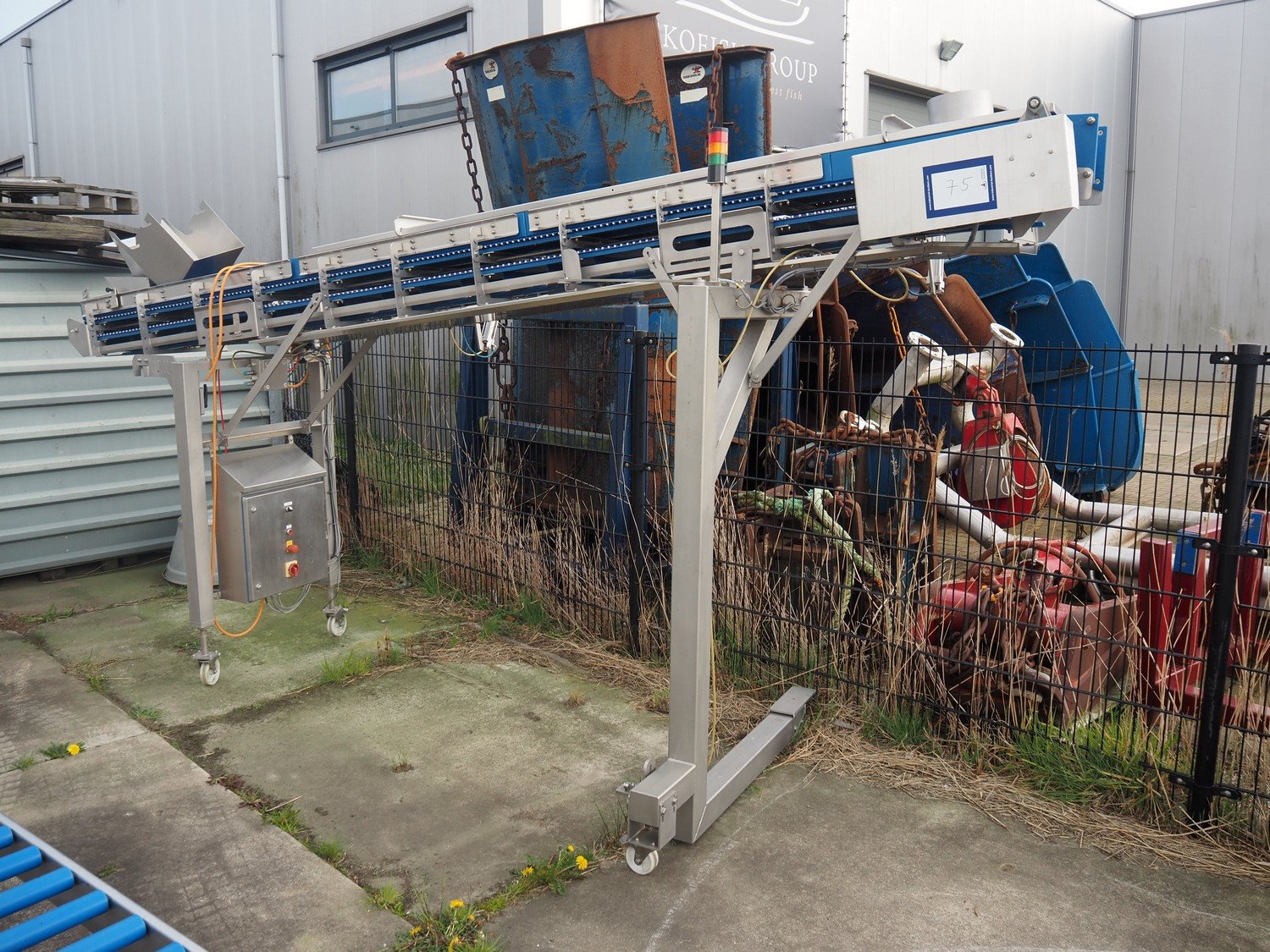 Mobile elevating belt, s/s frame, plastic belt with dividers, belt width: 300 mm, divider height: 80 mm, distance between dividers: 240 mm, elevating height: 1700 mm, total dimensions: 4500 mm x 1650 mm x 1800 mm. Kavel locatie: Makkummerwaard 3, 8321 WV Urk, Nederland