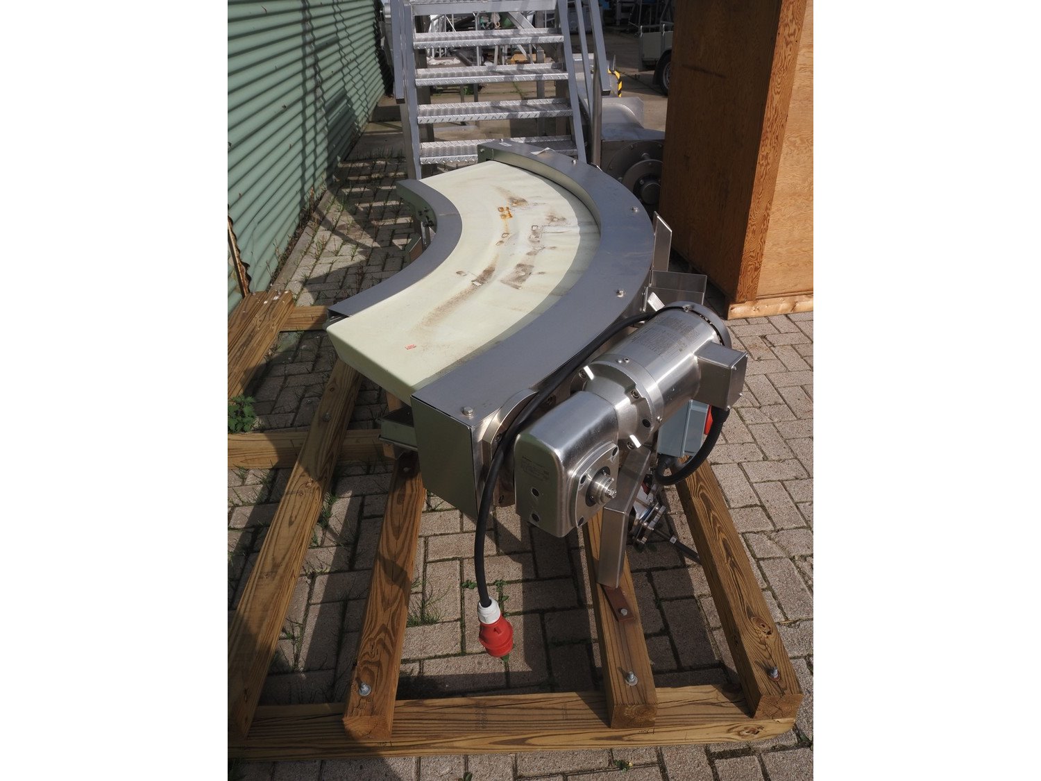 Benchmark 90° curve conveyor, model: N154, number: 2018.06-6, year of construction: 2018, 480 V, 3 Ph, 60 Hz, 1.5 A, plastic belt, belt width: 420 mm, total dimensions: 2250 mm x 950 mm x 700 mm. Kavel locatie: Makkummerwaard 3, 8321 WV Urk, Nederland