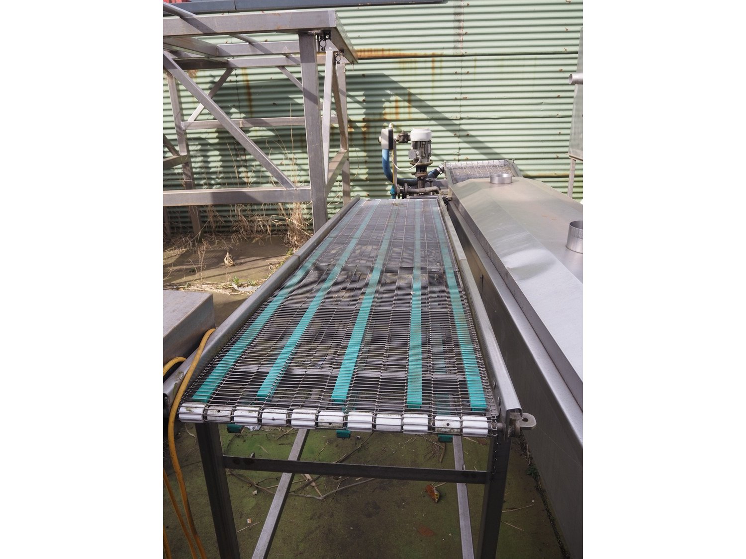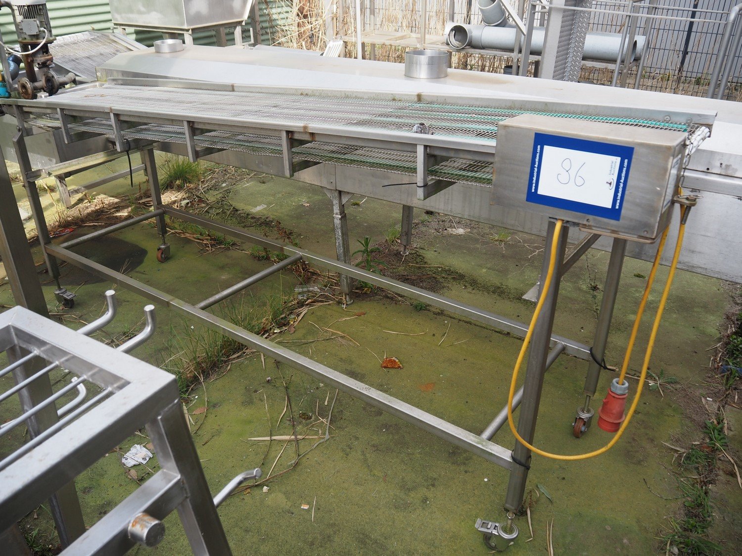 Mobile s/s mesh belt, belt width: 600 mm, total dimensions: 3000 mm x 890 mm x 1400 mm. Kavel locatie: Makkummerwaard 3, 8321 WV Urk, Nederland