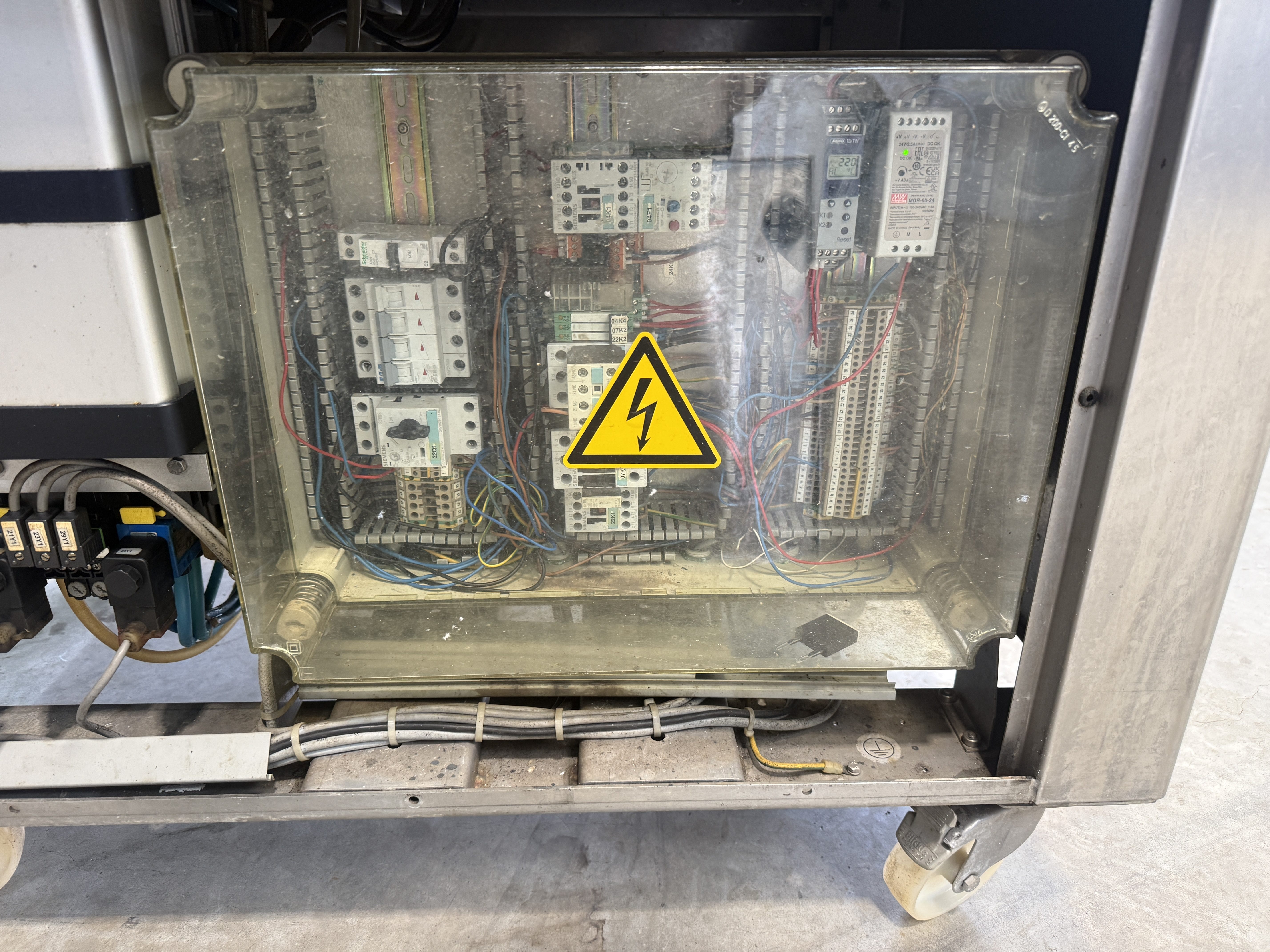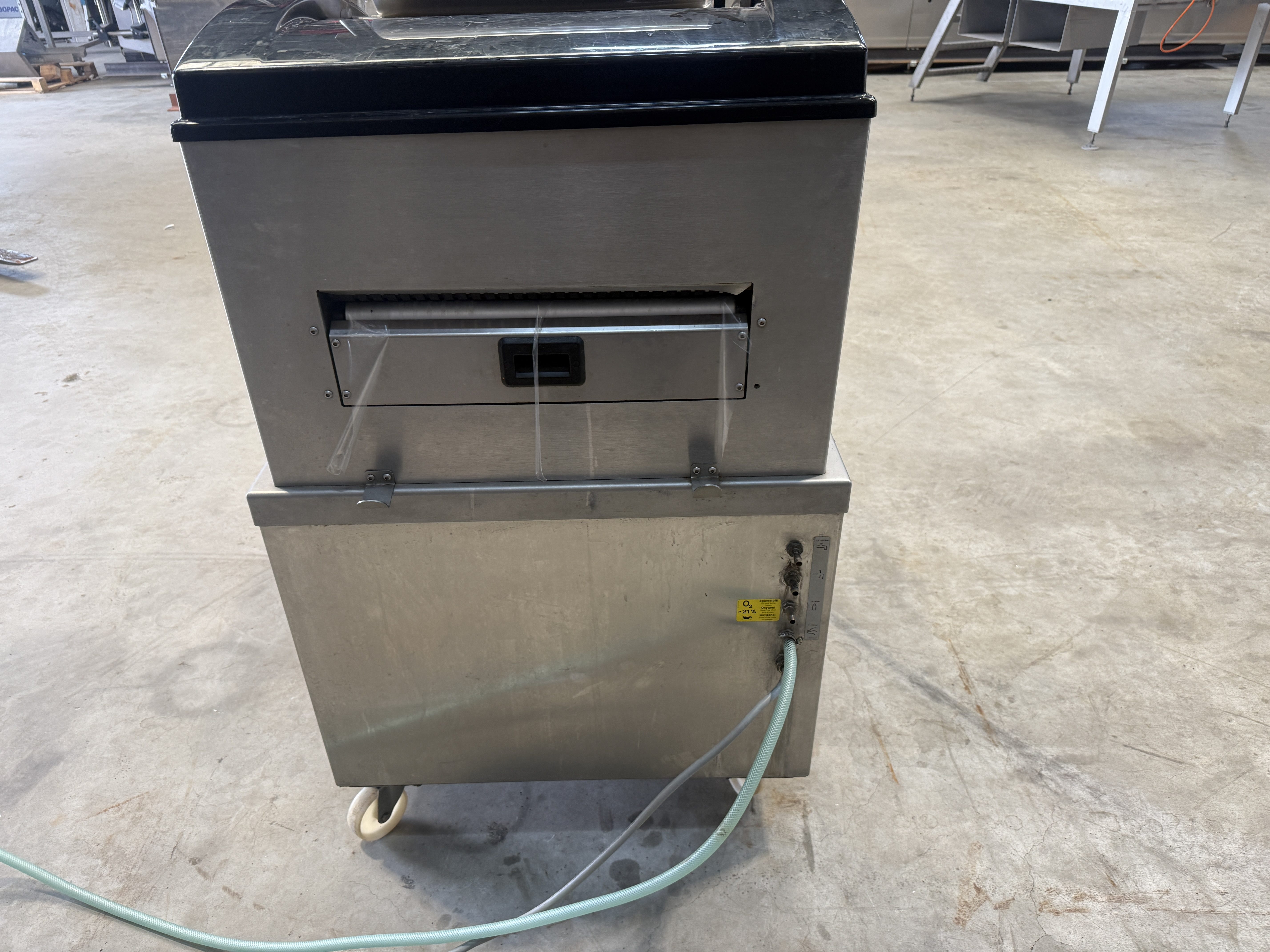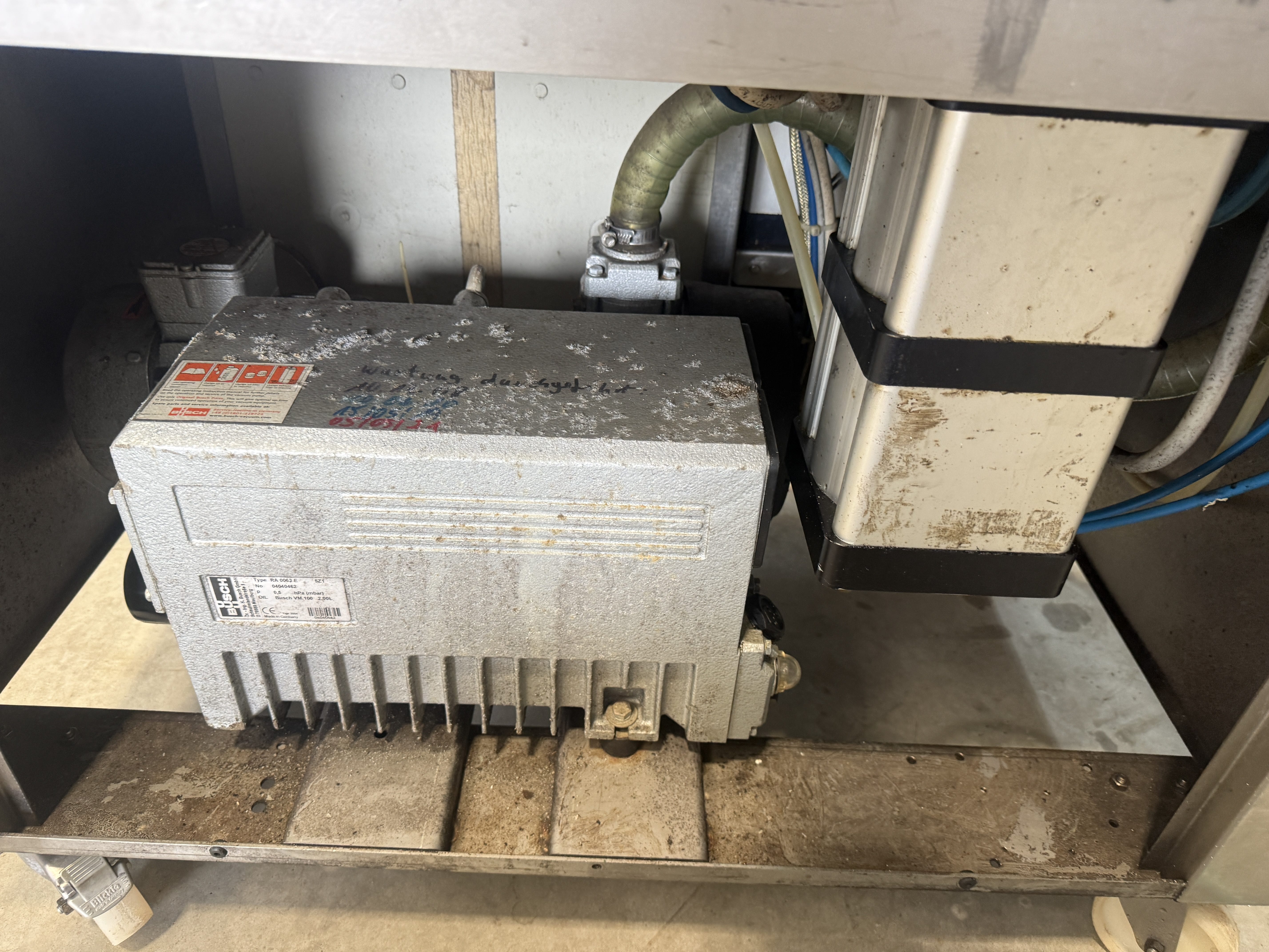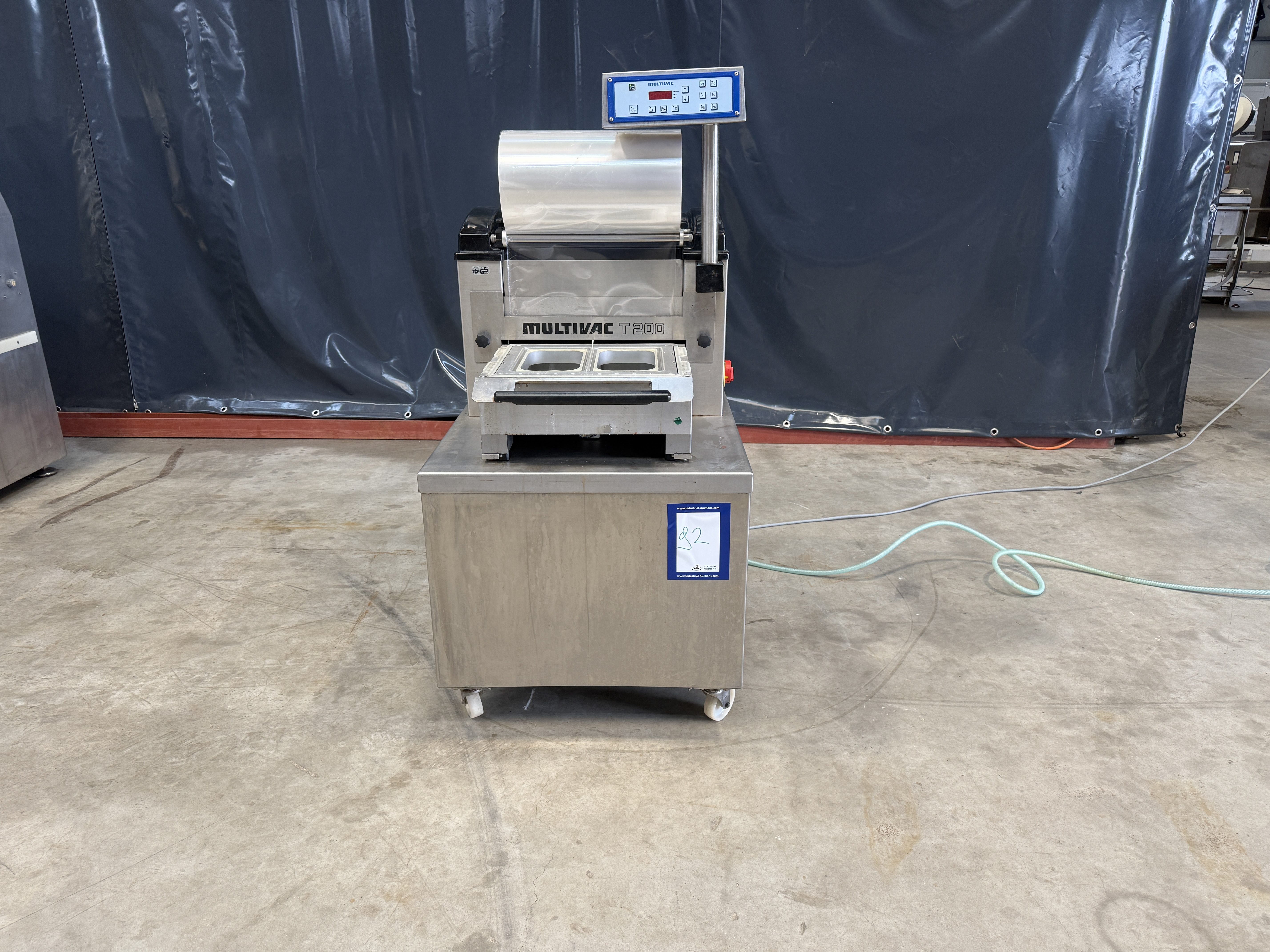 Multivac mobile traysealer, model: T 200, machine number: 264, year of construction: 2004, 400 V, 3 Ph, 50 Hz, 11 A, 4.5 kW, weight: 300 kg, dye: (2x) 270 mm x 170 mm, Busch vacuum pump, type: RA 0063 E 5Z1, total dimensions: 1520 mm x 800 mm x 1620 mm. Kavel locatie: Makkummerwaard 3, 8321 WV Urk, Nederland