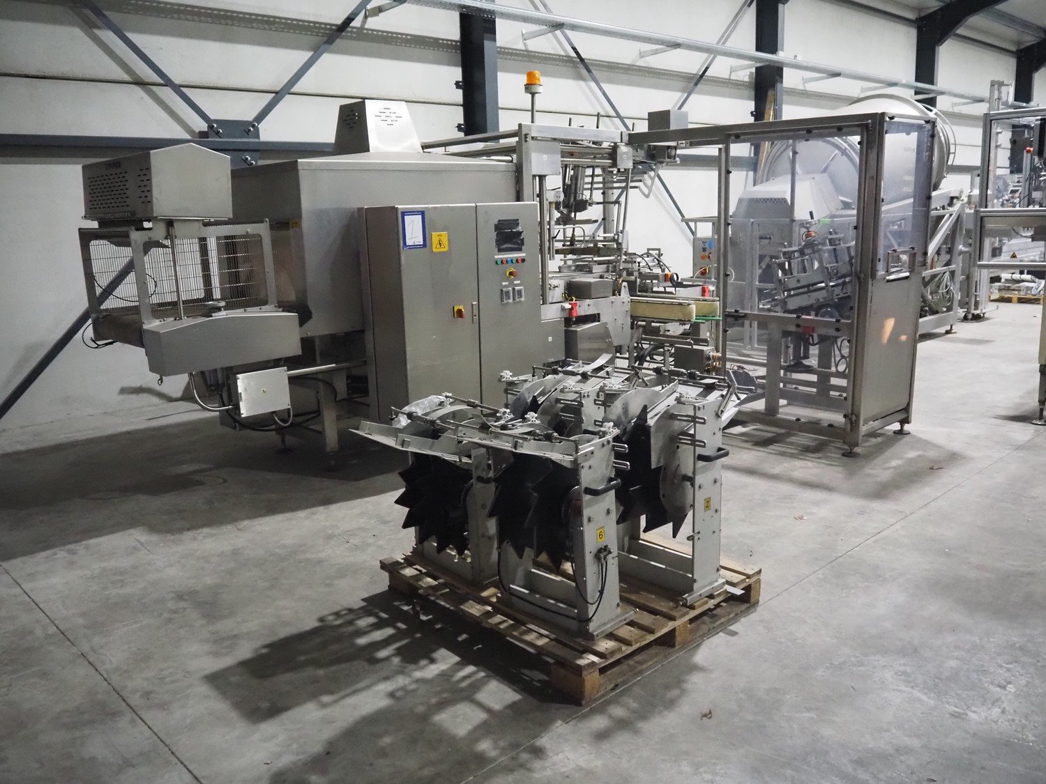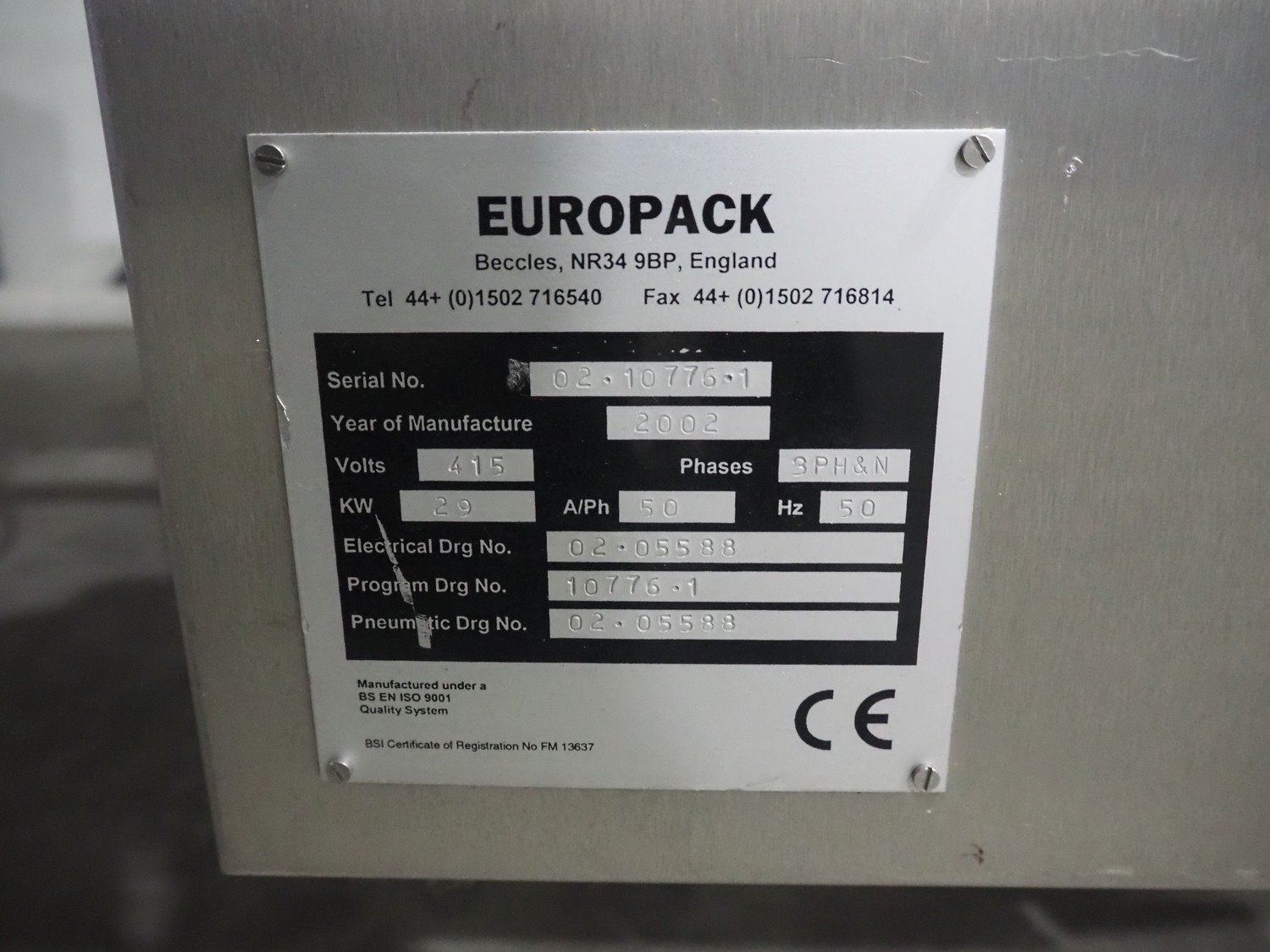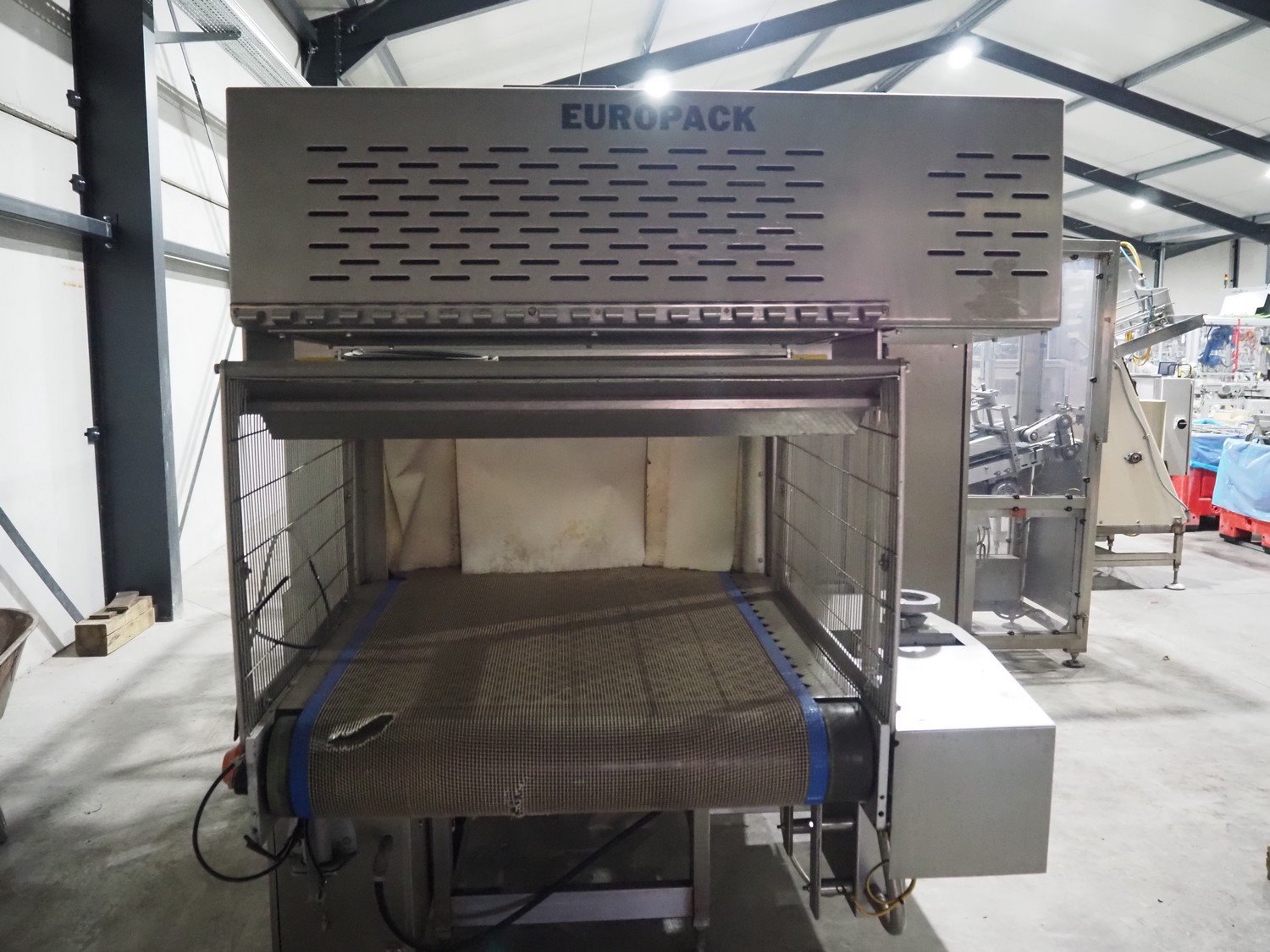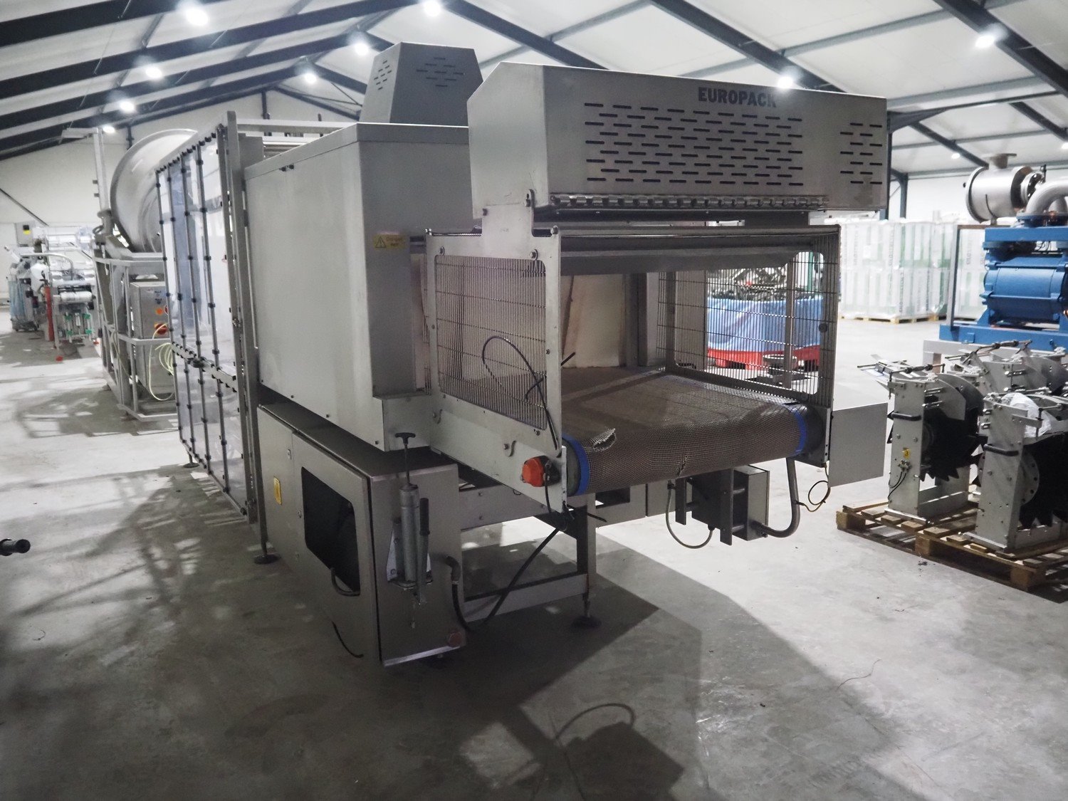 Europack wrapping and shrinking line, serial number: 02.10775.1, year of construction: 2002, 415 V, 3 Ph, 50 Hz, 29 kW, clearance infeed: 340 mm x 120 mm, film width: 780 mm, s/s belt, belt width: 660 mm, clearance shrink tunnel: 750 mm x 420 mm, outfeed belt width: 750 mm, total dimensions: 4650 mm x 3200 mm x 2000 mm. Including extra infeed wheels. Missing control panel. Kavel locatie: Langereijt 29A, 5091 JP Middelbeers, Nederland