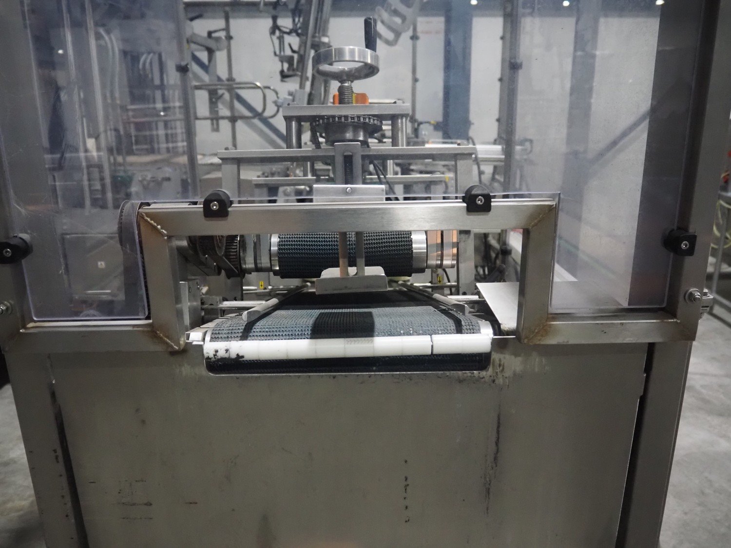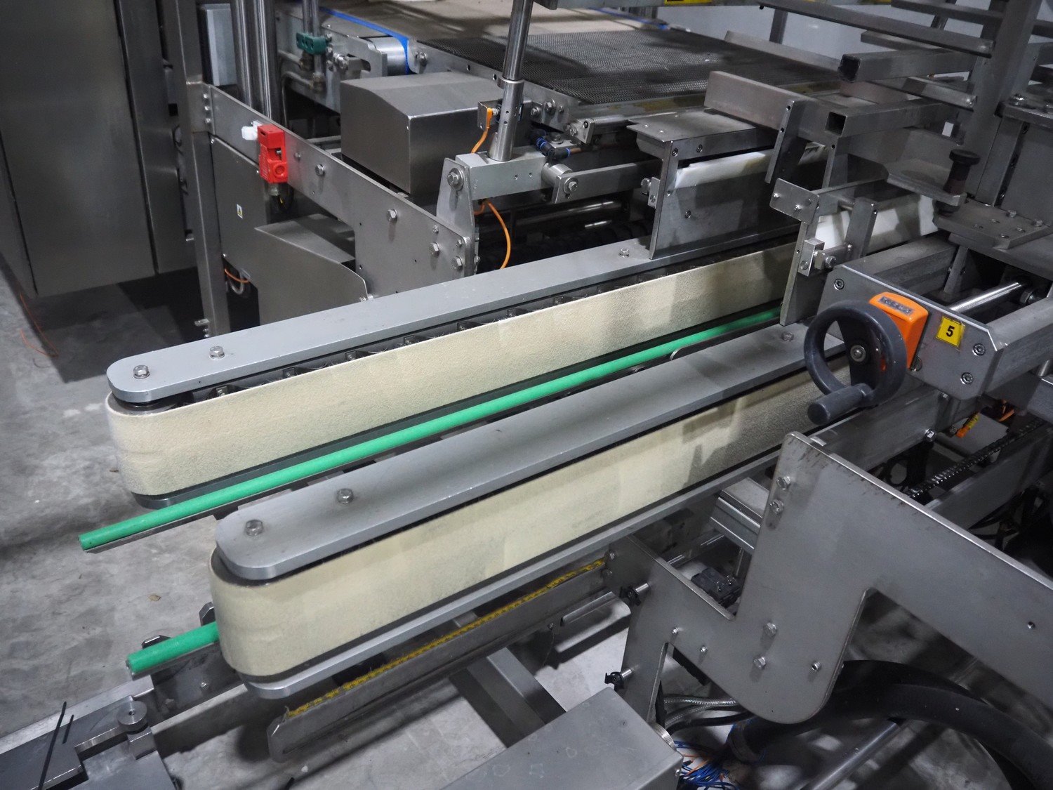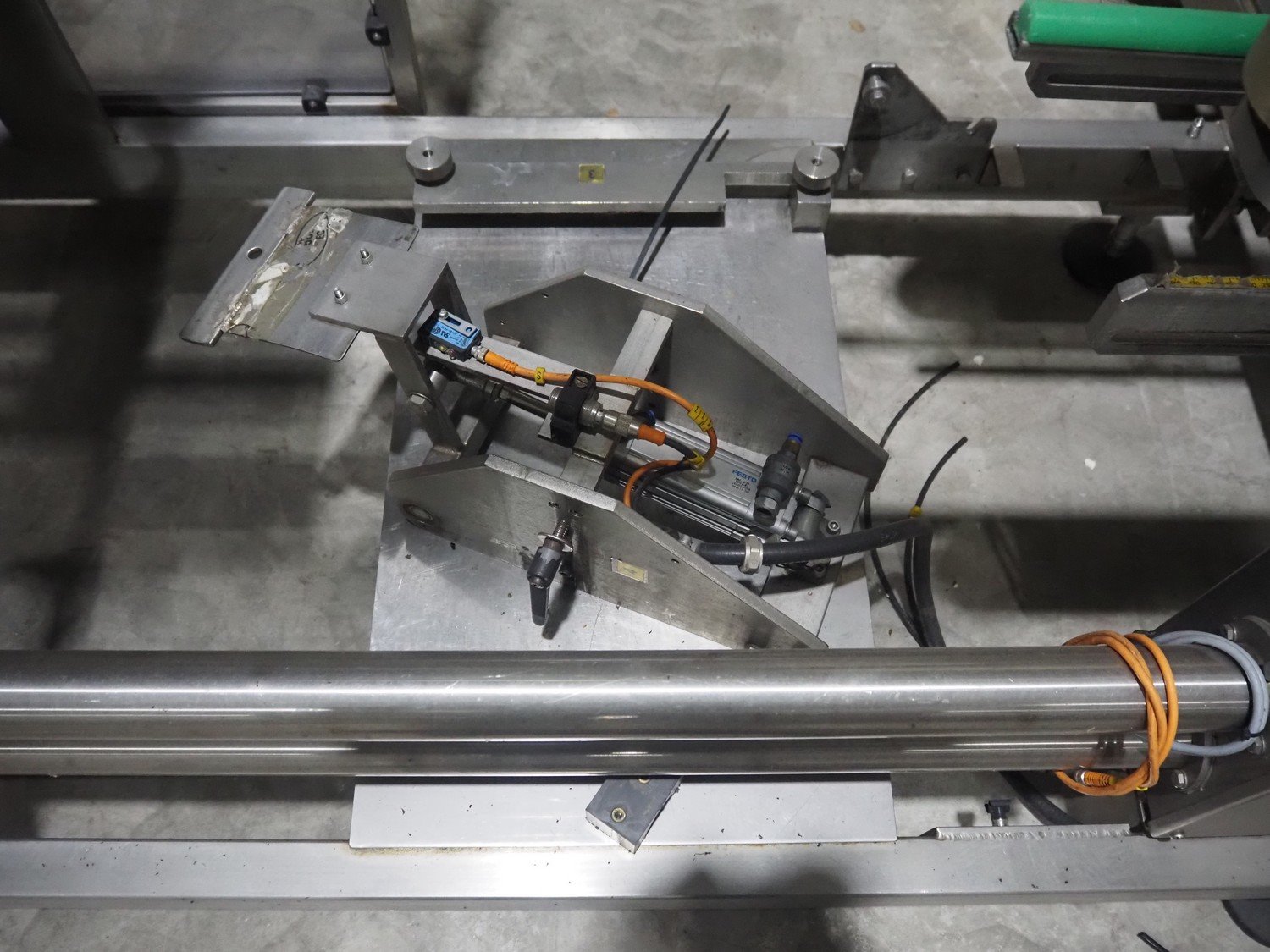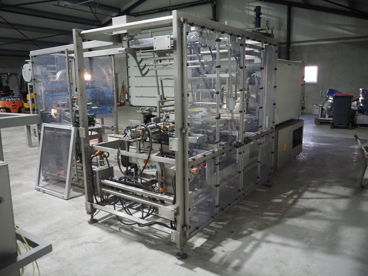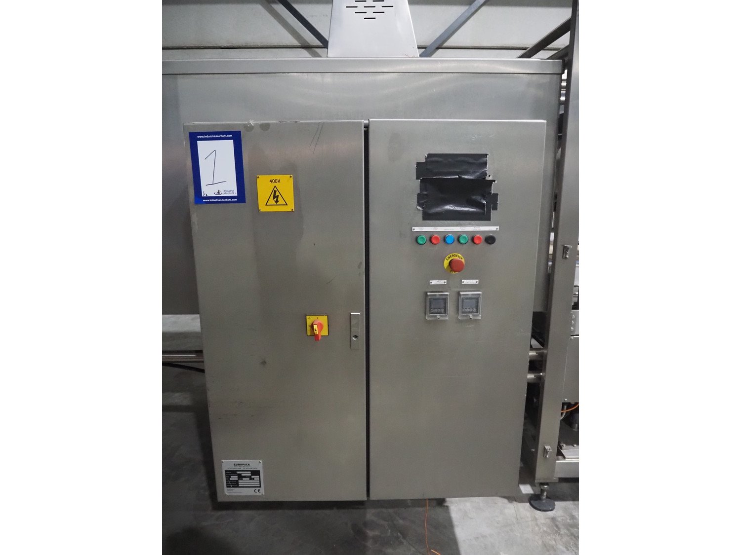 Europack wrapping and shrinking line, serial number: 02.10775.1, year of construction: 2002, 415 V, 3 Ph, 50 Hz, 29 kW, clearance infeed: 340 mm x 120 mm, film width: 780 mm, s/s belt, belt width: 660 mm, clearance shrink tunnel: 750 mm x 420 mm, outfeed belt width: 750 mm, total dimensions: 4650 mm x 3200 mm x 2000 mm. Including extra infeed wheels. Missing control panel. Kavel locatie: Langereijt 29A, 5091 JP Middelbeers, Nederland