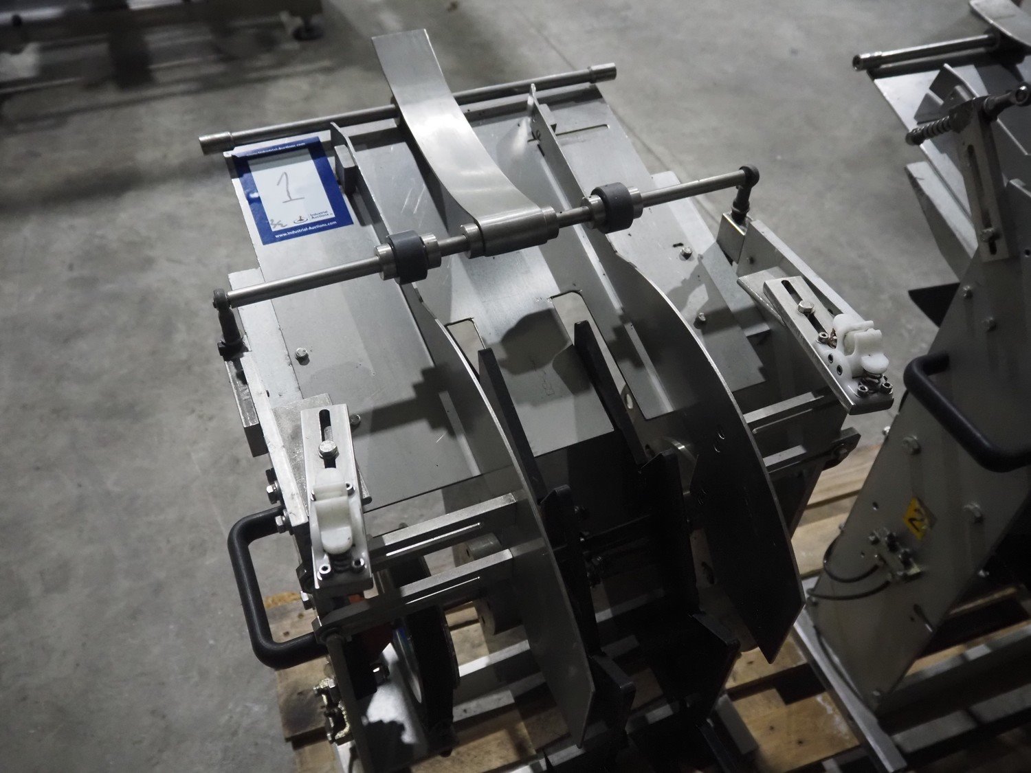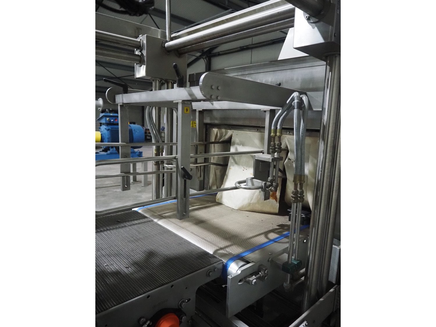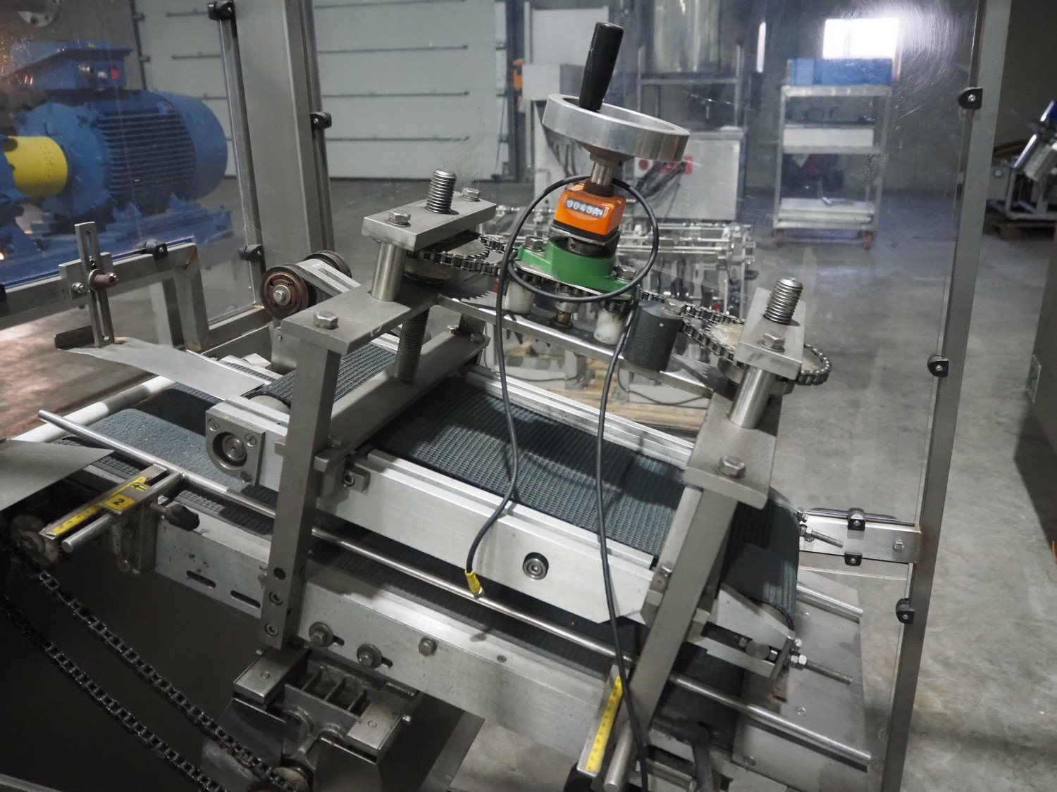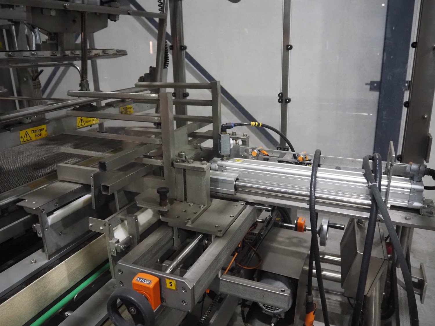 Europack wrapping and shrinking line, serial number: 02.10775.1, year of construction: 2002, 415 V, 3 Ph, 50 Hz, 29 kW, clearance infeed: 340 mm x 120 mm, film width: 780 mm, s/s belt, belt width: 660 mm, clearance shrink tunnel: 750 mm x 420 mm, outfeed belt width: 750 mm, total dimensions: 4650 mm x 3200 mm x 2000 mm. Including extra infeed wheels. Missing control panel. Kavel locatie: Langereijt 29A, 5091 JP Middelbeers, Nederland