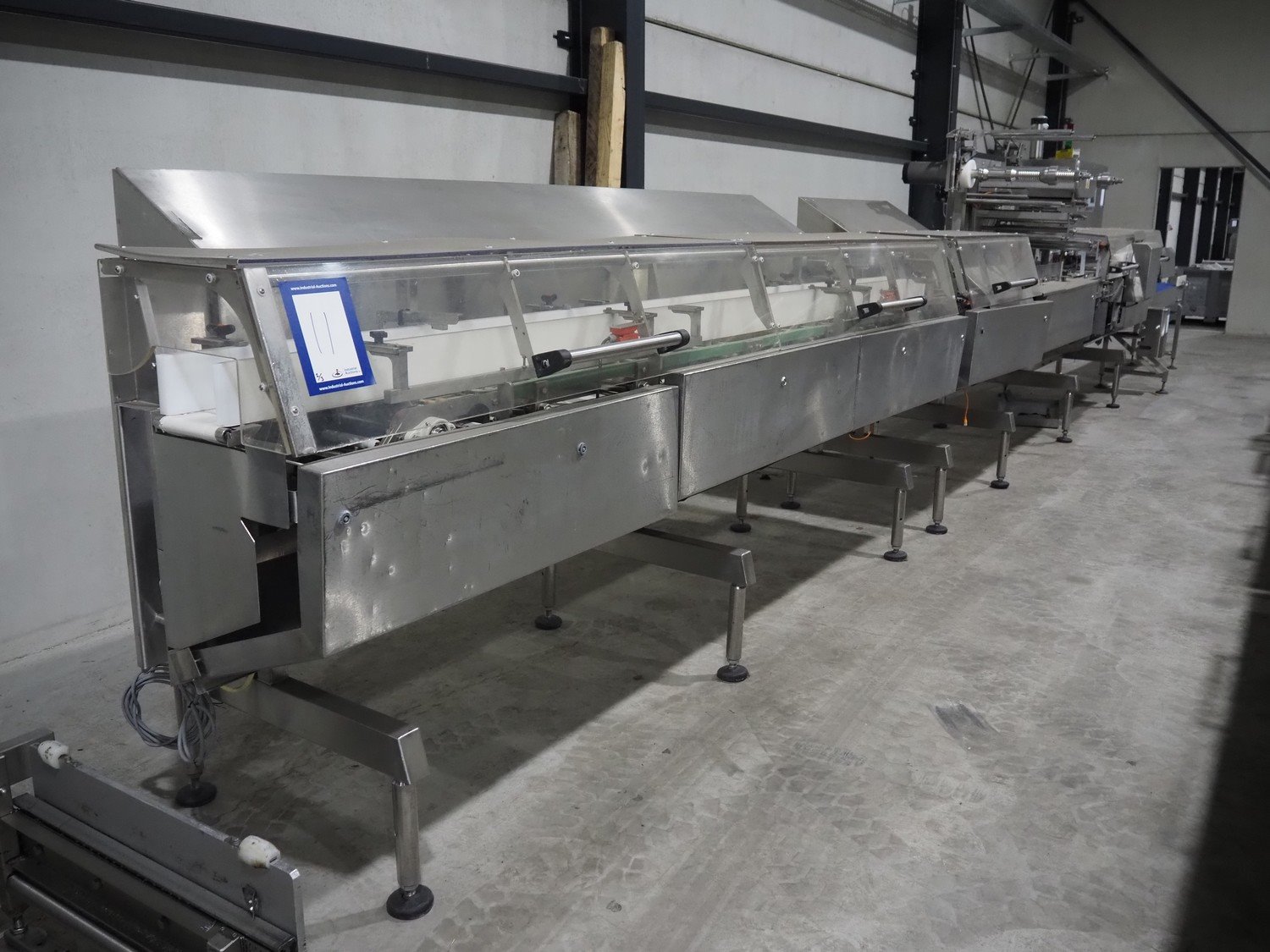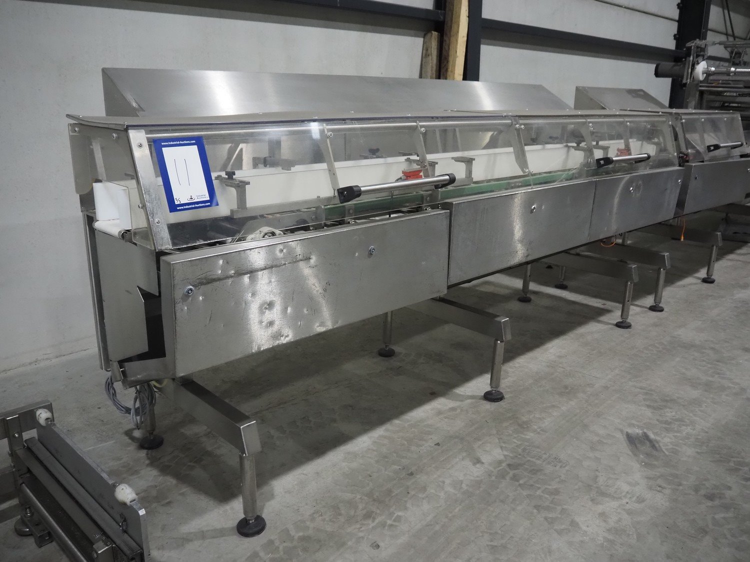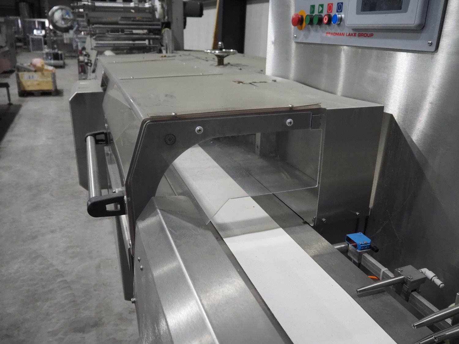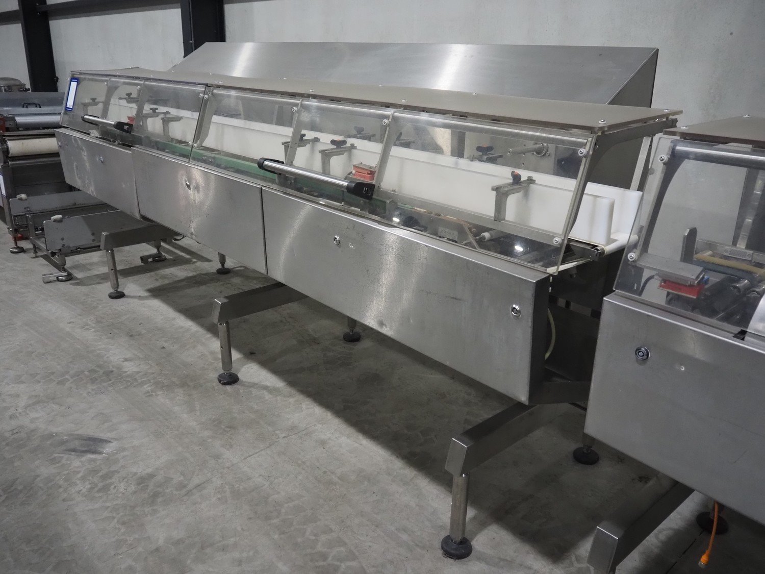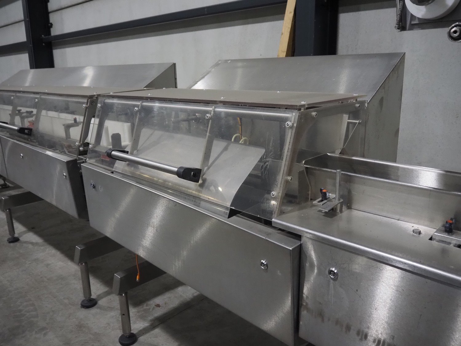 Bradman Lake Group dual feed flow packer, machine type: FT120CLX, serial number: 7098, year of construction: 2006, 415 V, 3 Ph, 50 Hz, 10 kW, plastic belt with dividers, belt width: (2x) 40 mm, divider height: 35 mm, distance between dividers: 300 mm, seal width: 230 mm, total dimensions: 5750 mm x 1200 mm x 2500 mm. Including infeed and outfeed belt, plastic infeed belt , belt width: 160 mm, total dimension: 3500 mm x 980 mm x 1550 mm. plastic outfeed belt, plastic mesh belt, belt width: 300 mm, total dimensions: 2600 mm x 600 mm x 1250 mm. Kavel locatie: Langereijt 29A, 5091 JP Middelbeers, Nederland