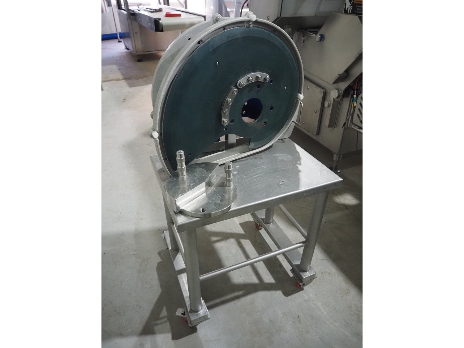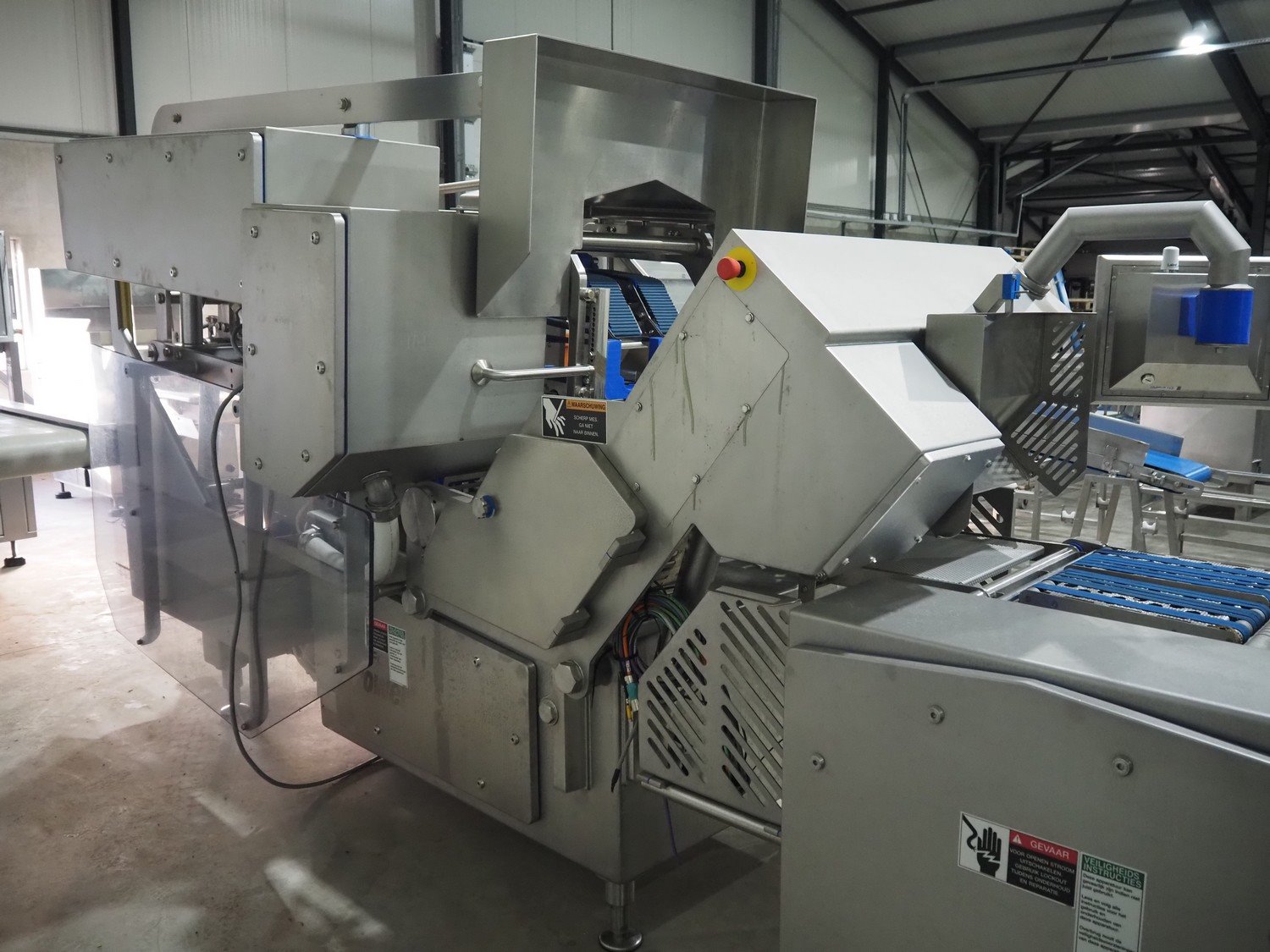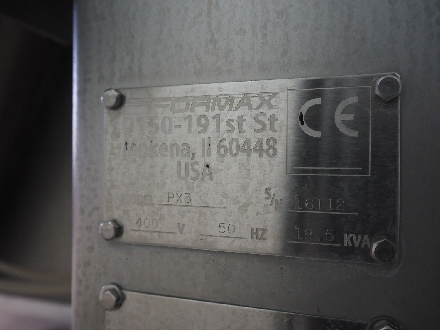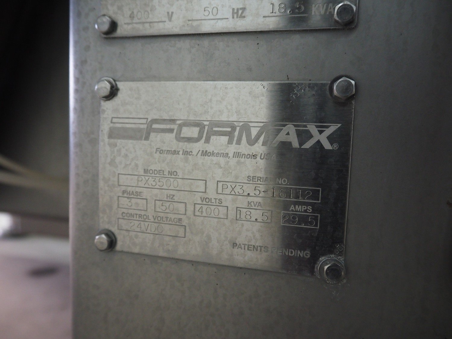 Formax slicer, model: PowerMax 3500, serial number: PX3.5-16112, 400 V, 3 Ph, 50 Hz, 29.5 A, 18.5 kW, plastic belt, belt width: (2x) 100 mm, plastic wire belt, belt width: 390 mm, total dimensions: 3900 mm x 1500 mm x 2250 mm. Including trolley with knife holder, dimensions: 770 mm x 600 mm x 1350 mm. Kavel locatie: Langereijt 29A, 5091 JP Middelbeers, Nederland
