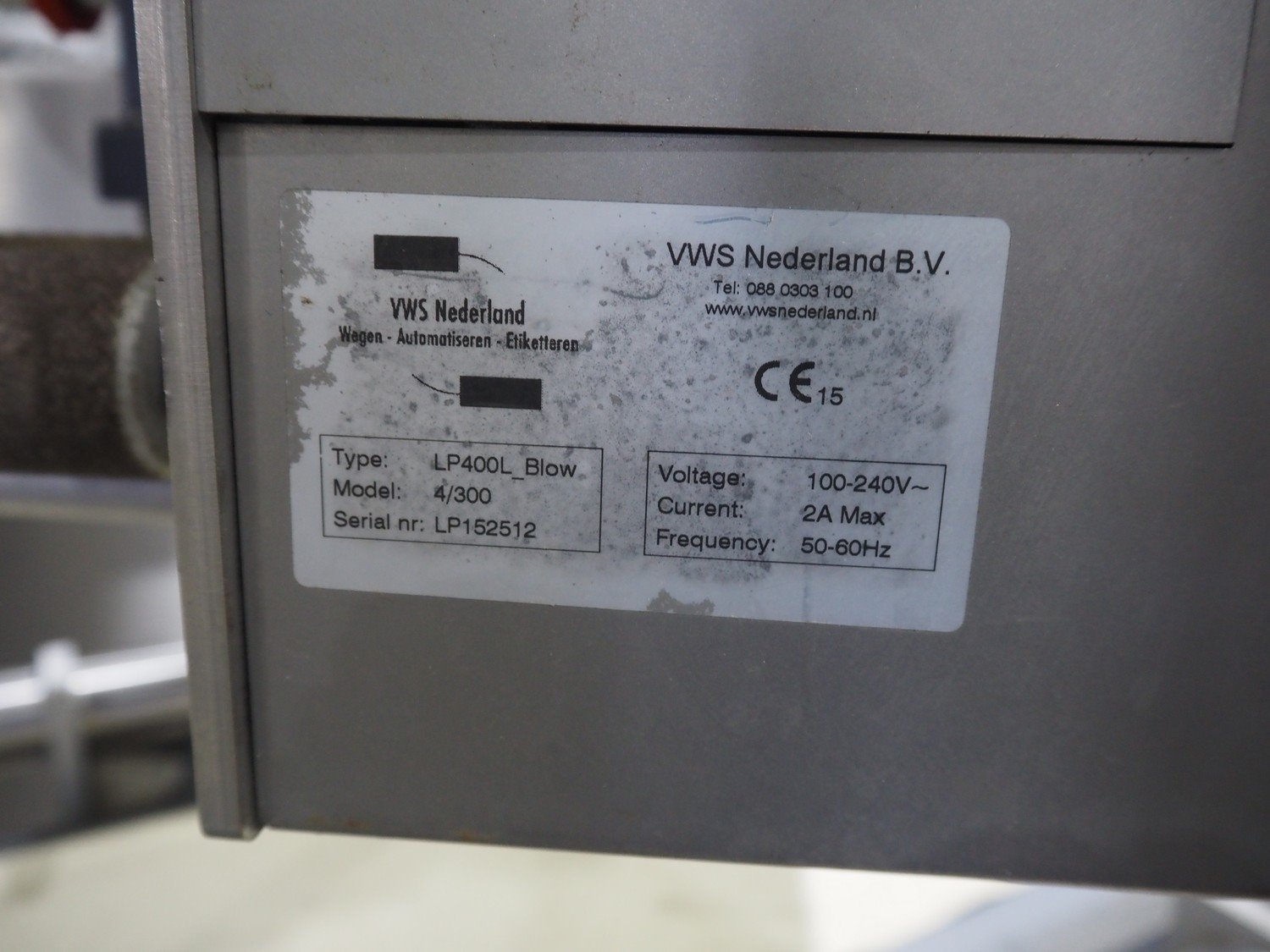 VWS Nederland B.V. double labeller, type: (2x) LP400L_Blow, model: 4/300, serial number: LP152511 and LP152512, 100-240 V, 50-60 Hz, 2 A, belt width: 295 mm, 255 mm, total dimensions: 1620 mm x 900 mm x 1960 mm. Kavel locatie: Langereijt 29A, 5091 JP Middelbeers, Nederland