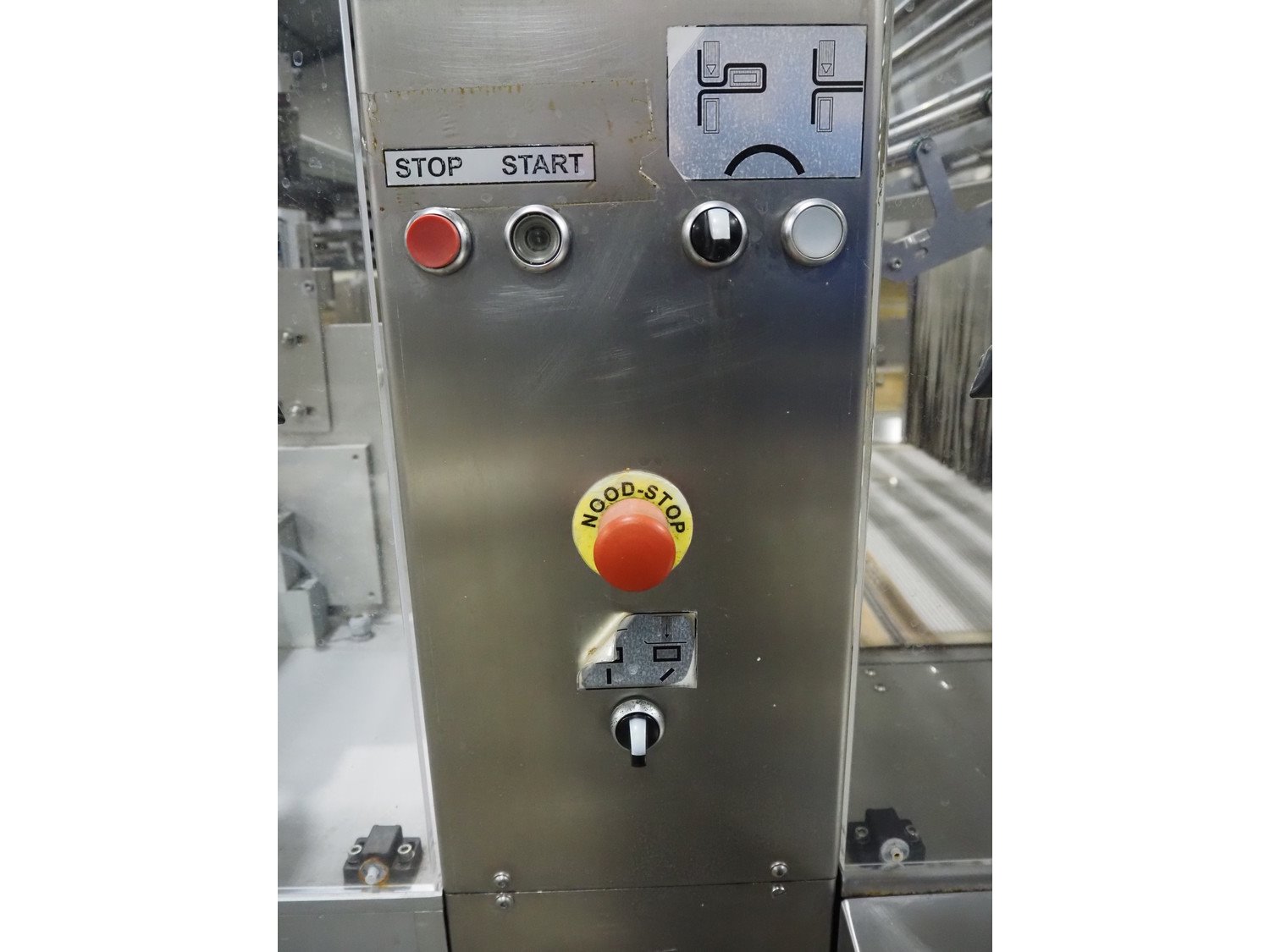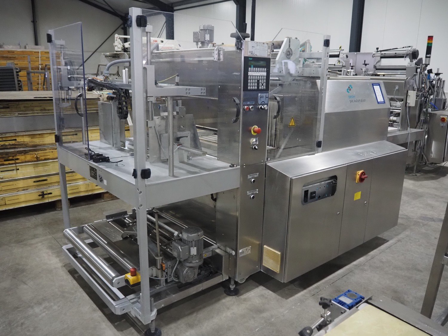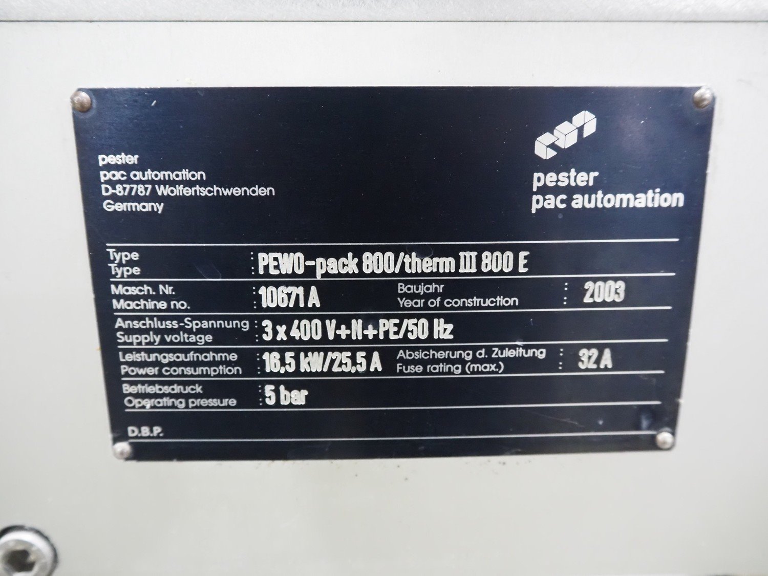 Pester Pac Automation shrink wrap- and seal machine, type: PEWO-pack 800/therm III 800 E, machine number: 10671A, year of construction: 2003, 400 V, 3 Ph, 50 Hz, 25.5 A, 16.5 kW, plastic belt, belt width: 780 mm, clearance: 780 mm x 350 mm, seal length: 850, steel rollers: roller length: 845 mm, total dimensions: 3850 mm x 1650 mm x 2300 mm. Incomplete. Kavel locatie: Langereijt 29A, 5091 JP Middelbeers, Nederland