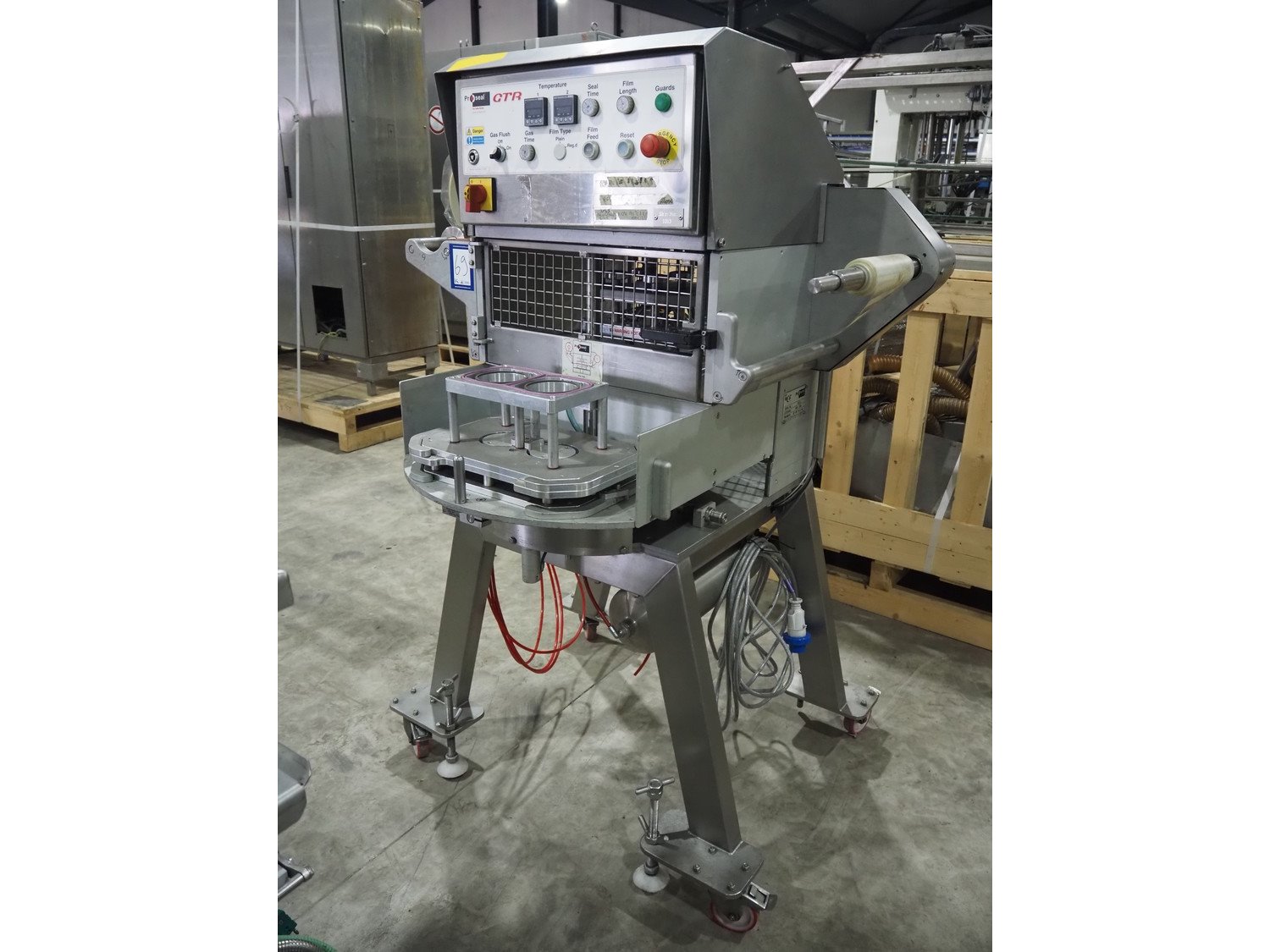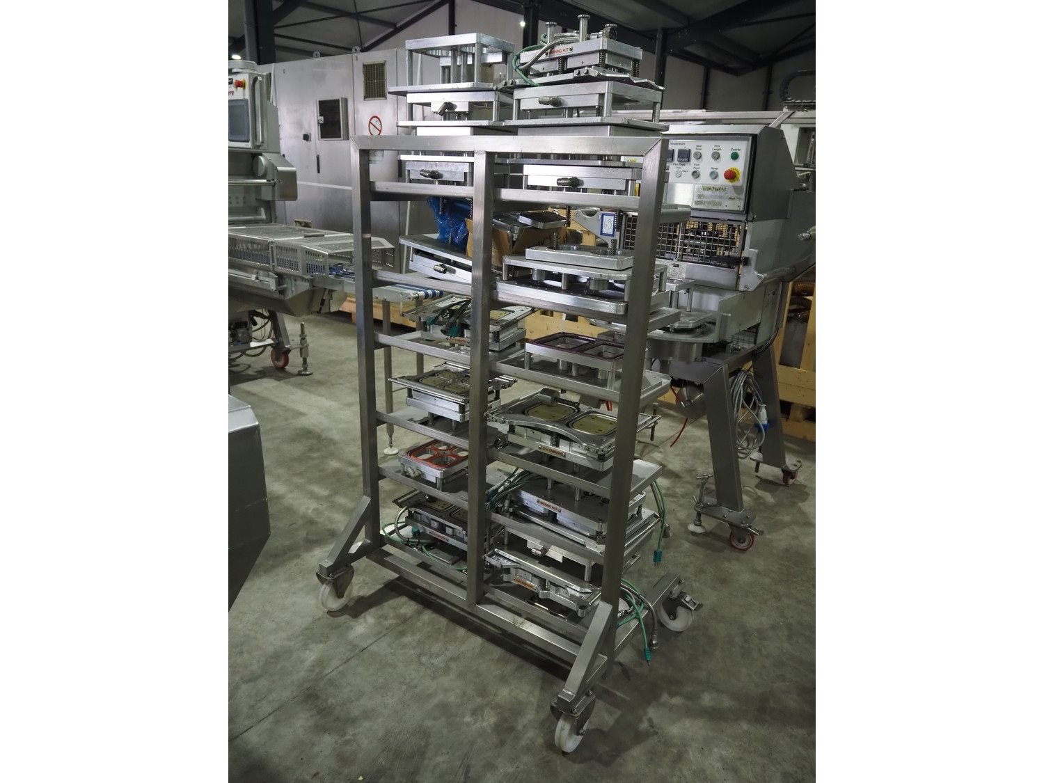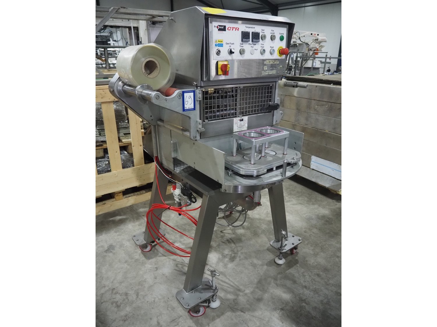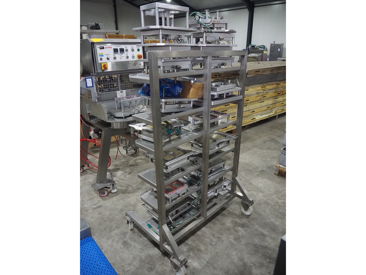 Proseal UK LTD mobile rotating traysealer, serial number: 1058, 240 V, 50 Hz, 5 bar, film width: 205 mm, dye: (2x) 105 mm x 160 mm, total dimensions: 1150 mm x 1000 mm x 1680 mm. Including s/s rack with large amount of extra forms, dye: (2x) 140 mm x 165 mm, (2x) 120 mm x 160 mm, (2x) 170 mm x 215 mm, 175 mm x 215 mm, (2x) 115 mm x 115 mm, (2x) 165 mm x 215 mm, (2x) Ø 135 mm, total dimensions rack: 1000 mm x 900 mm x 1600 mm. Kavel locatie: Langereijt 29A, 5091 JP Middelbeers, Nederland