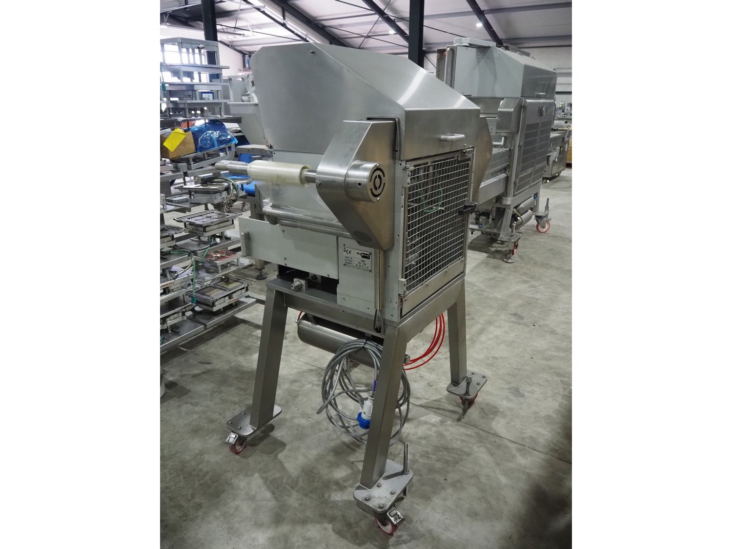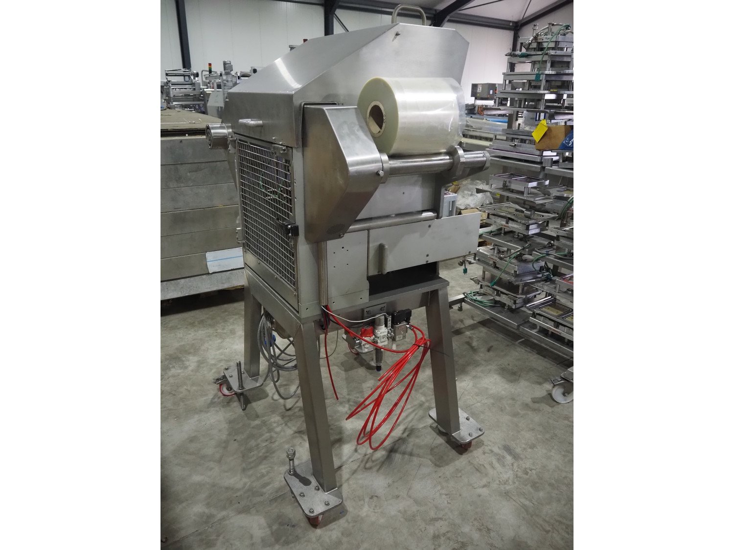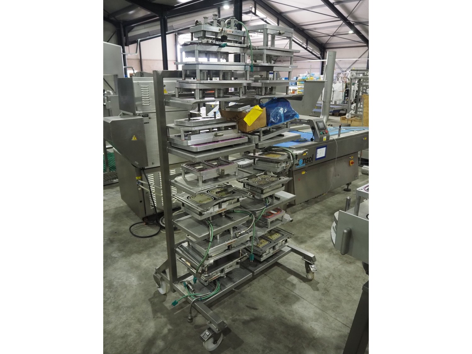 Proseal UK LTD mobile rotating traysealer, serial number: 1058, 240 V, 50 Hz, 5 bar, film width: 205 mm, dye: (2x) 105 mm x 160 mm, total dimensions: 1150 mm x 1000 mm x 1680 mm. Including s/s rack with large amount of extra forms, dye: (2x) 140 mm x 165 mm, (2x) 120 mm x 160 mm, (2x) 170 mm x 215 mm, 175 mm x 215 mm, (2x) 115 mm x 115 mm, (2x) 165 mm x 215 mm, (2x) Ø 135 mm, total dimensions rack: 1000 mm x 900 mm x 1600 mm. Kavel locatie: Langereijt 29A, 5091 JP Middelbeers, Nederland