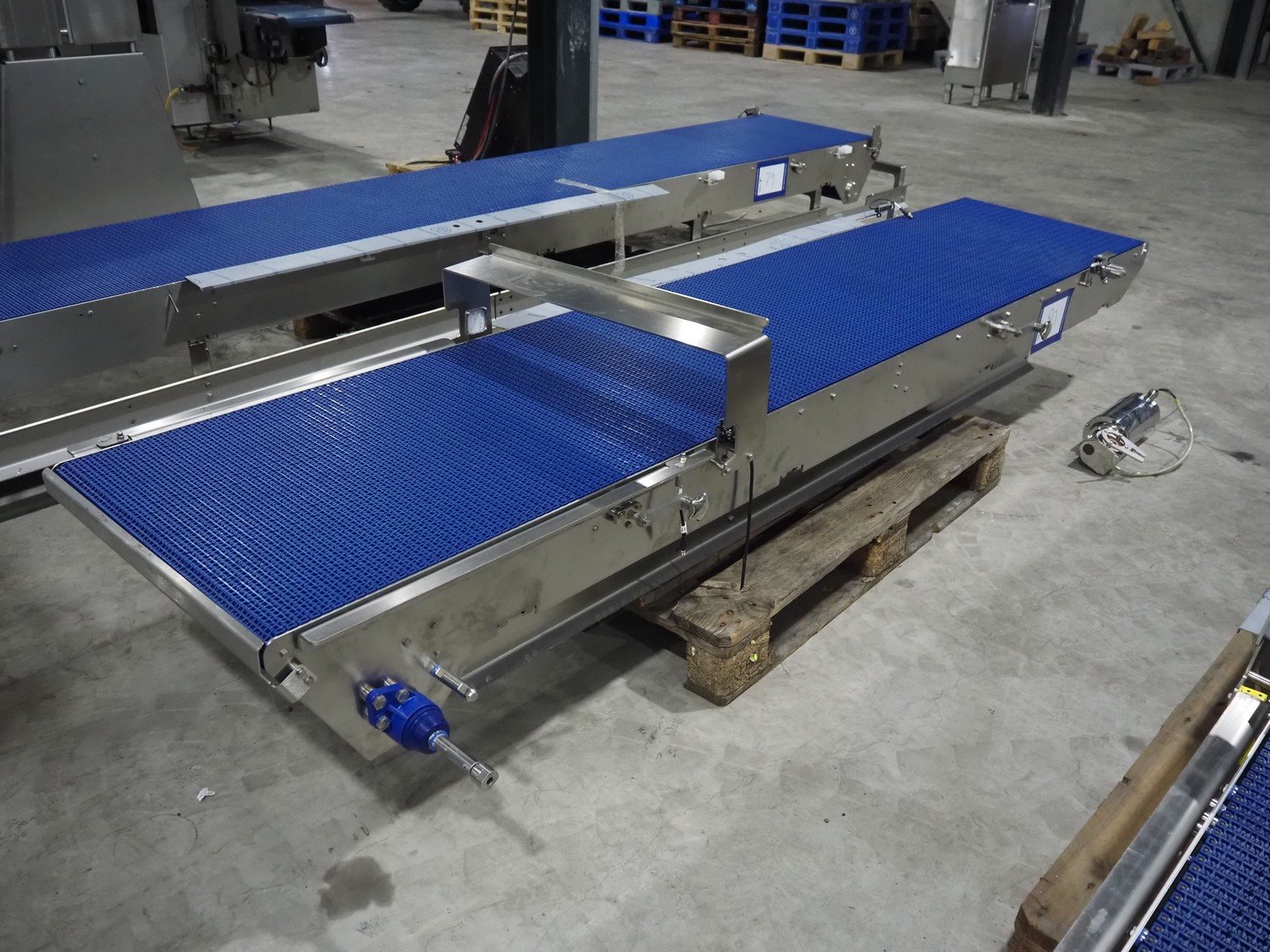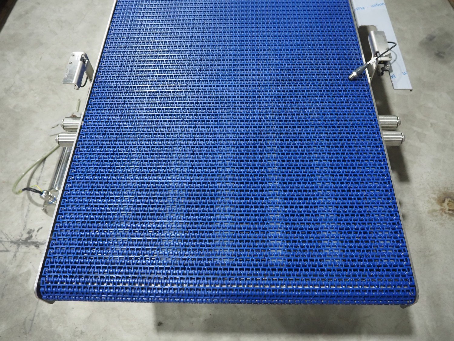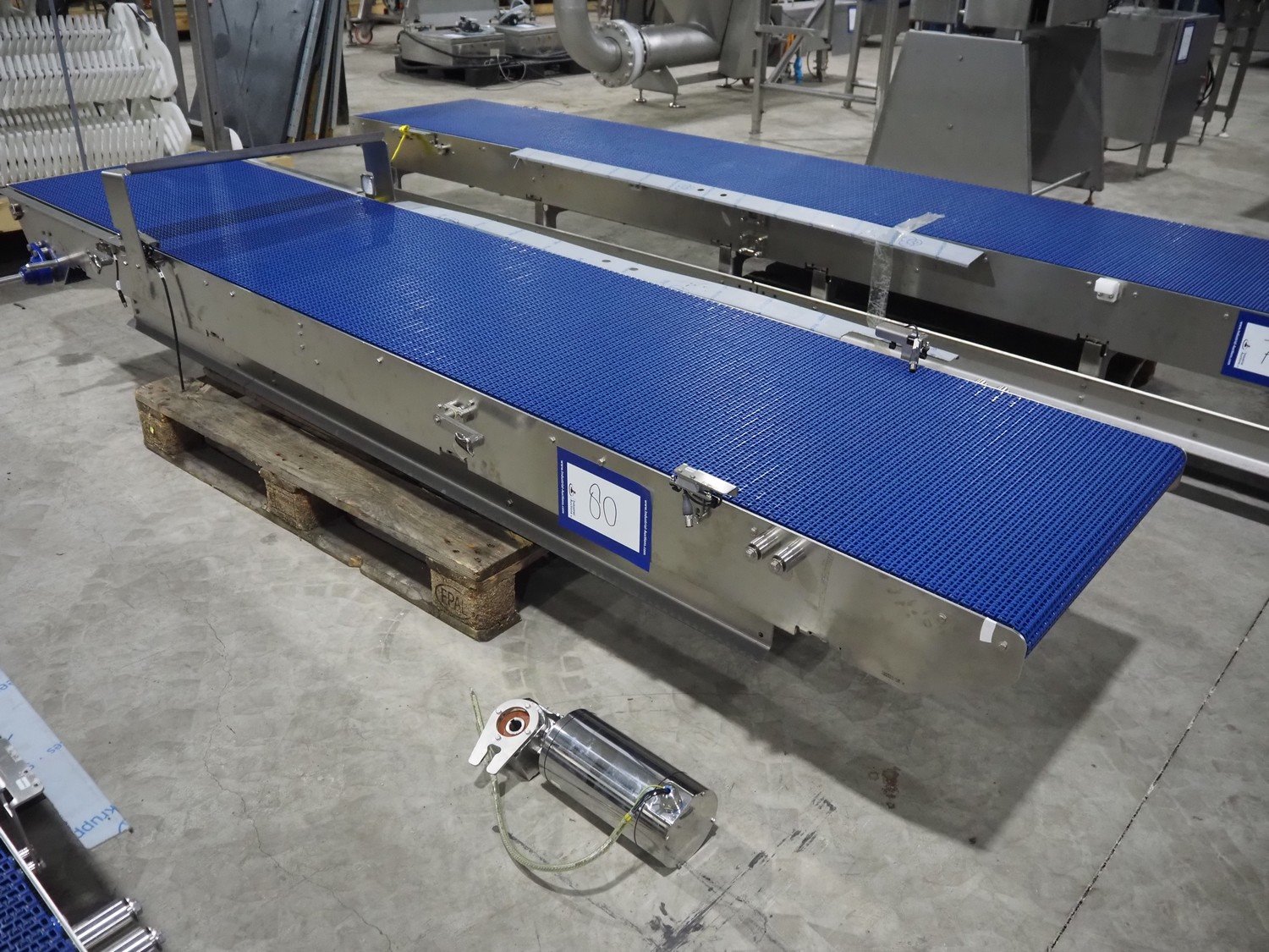Transport belt, s/s frame, plastic mesh belt, belt width: 580 mm, clearance: 600 mm x 150 mm, total dimensions: 2900 mm x 770 mm x 550 mm. Kavel locatie: Langereijt 29A, 5091 JP Middelbeers, Nederland