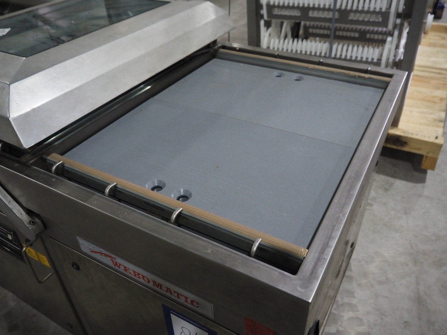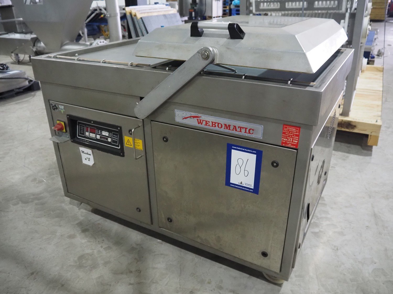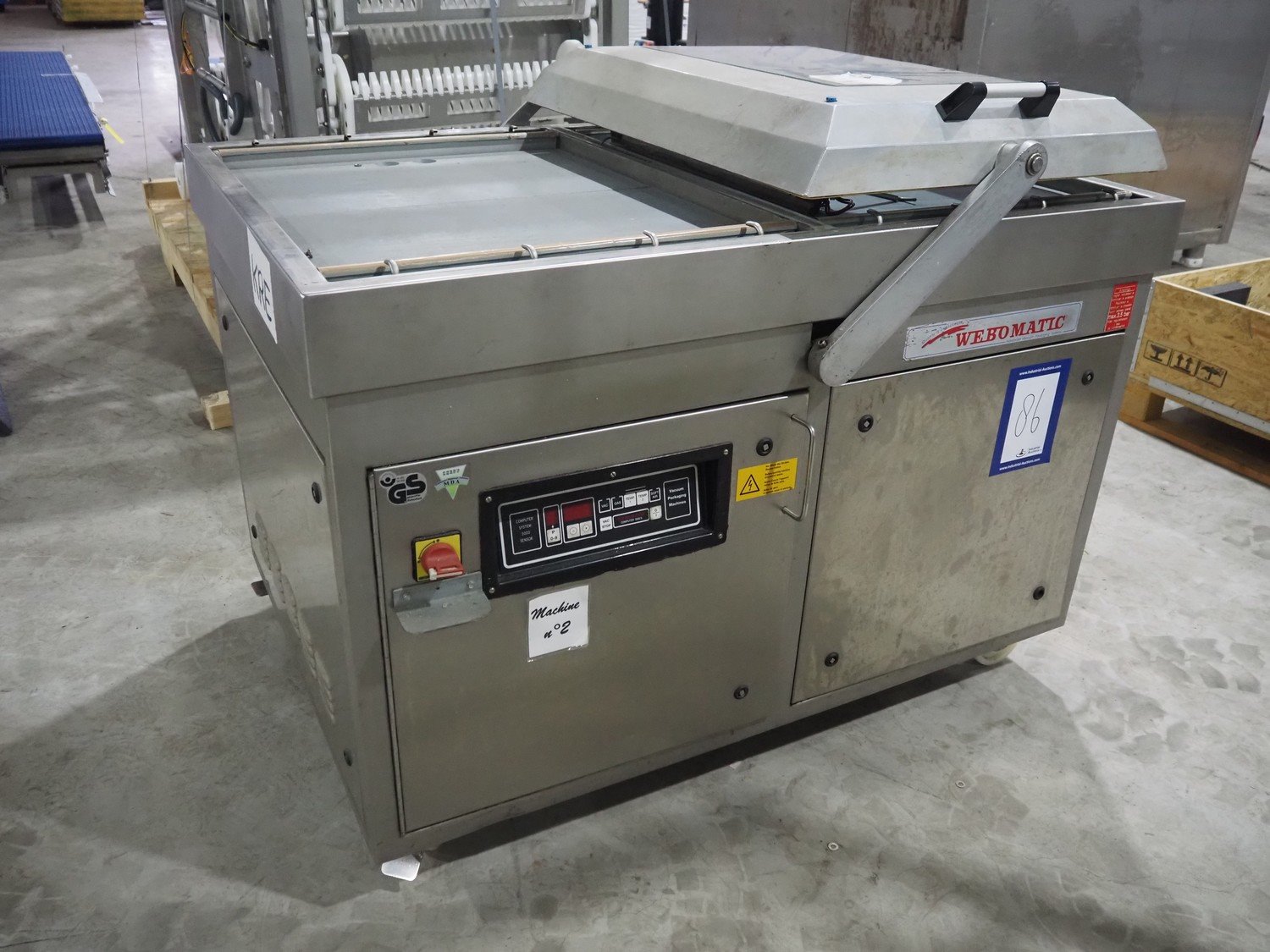 Webomatic mobile double chamber vacuum machine, type: CD 130-PR, serial number: 5810PB192, year of construction: 02/2007, 400 V, 3 Ph, 50 Hz, 9 A, 4 kW, dimensions chamber: (2x) 780 mm x 660 mm, seal length: (4x) 650 mm, total dimensions: 1450 mm x 1100 mm x 1150 mm. Without vacuum pump. Kavel locatie: Langereijt 29A, 5091 JP Middelbeers, Nederland