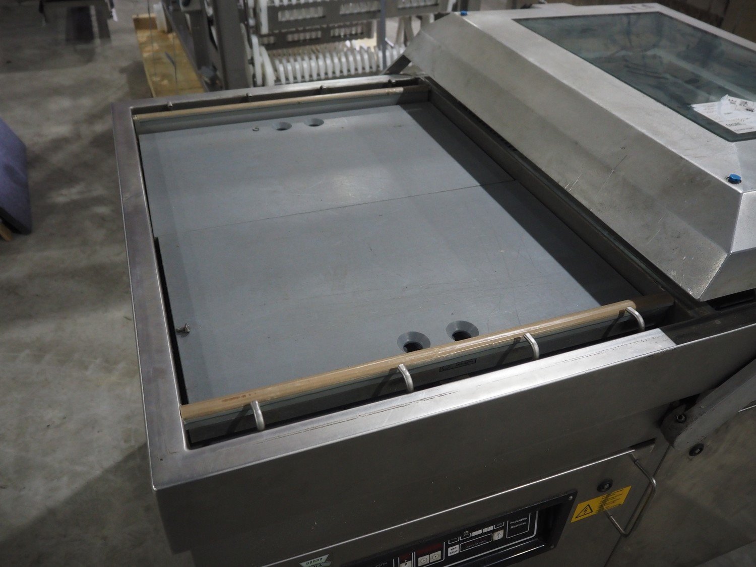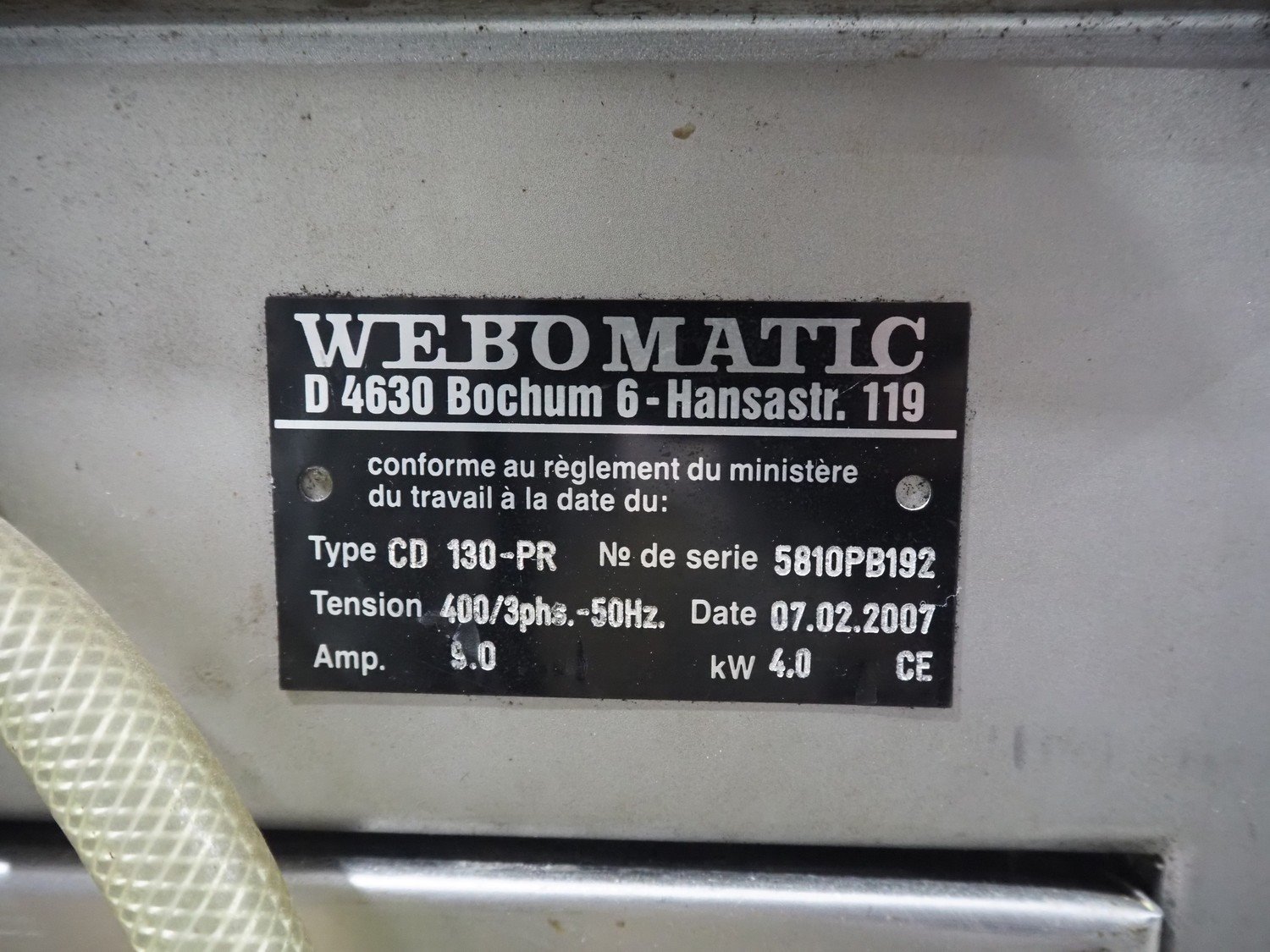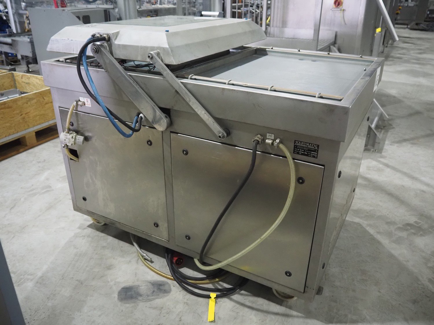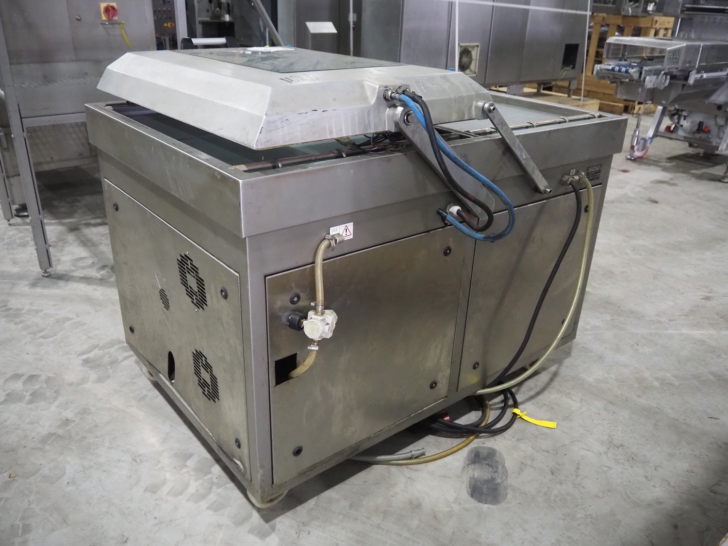 Webomatic mobile double chamber vacuum machine, type: CD 130-PR, serial number: 5810PB192, year of construction: 02/2007, 400 V, 3 Ph, 50 Hz, 9 A, 4 kW, dimensions chamber: (2x) 780 mm x 660 mm, seal length: (4x) 650 mm, total dimensions: 1450 mm x 1100 mm x 1150 mm. Without vacuum pump. Kavel locatie: Langereijt 29A, 5091 JP Middelbeers, Nederland