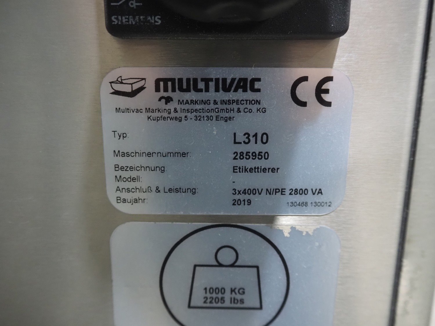 Multivac labelling machine, type: L310, serial number: 285950, year of construction: 2019, 400 V, 3 Ph, year of construction: 2019, weight: 1000 kg, plastic belt, belt width: (3x) 190 mm (1x) 90 mm, total dimensions: 2900 mm x 1850 mm x 2000 mm. Kavel locatie: Langereijt 29A, 5091 JP Middelbeers, Nederland